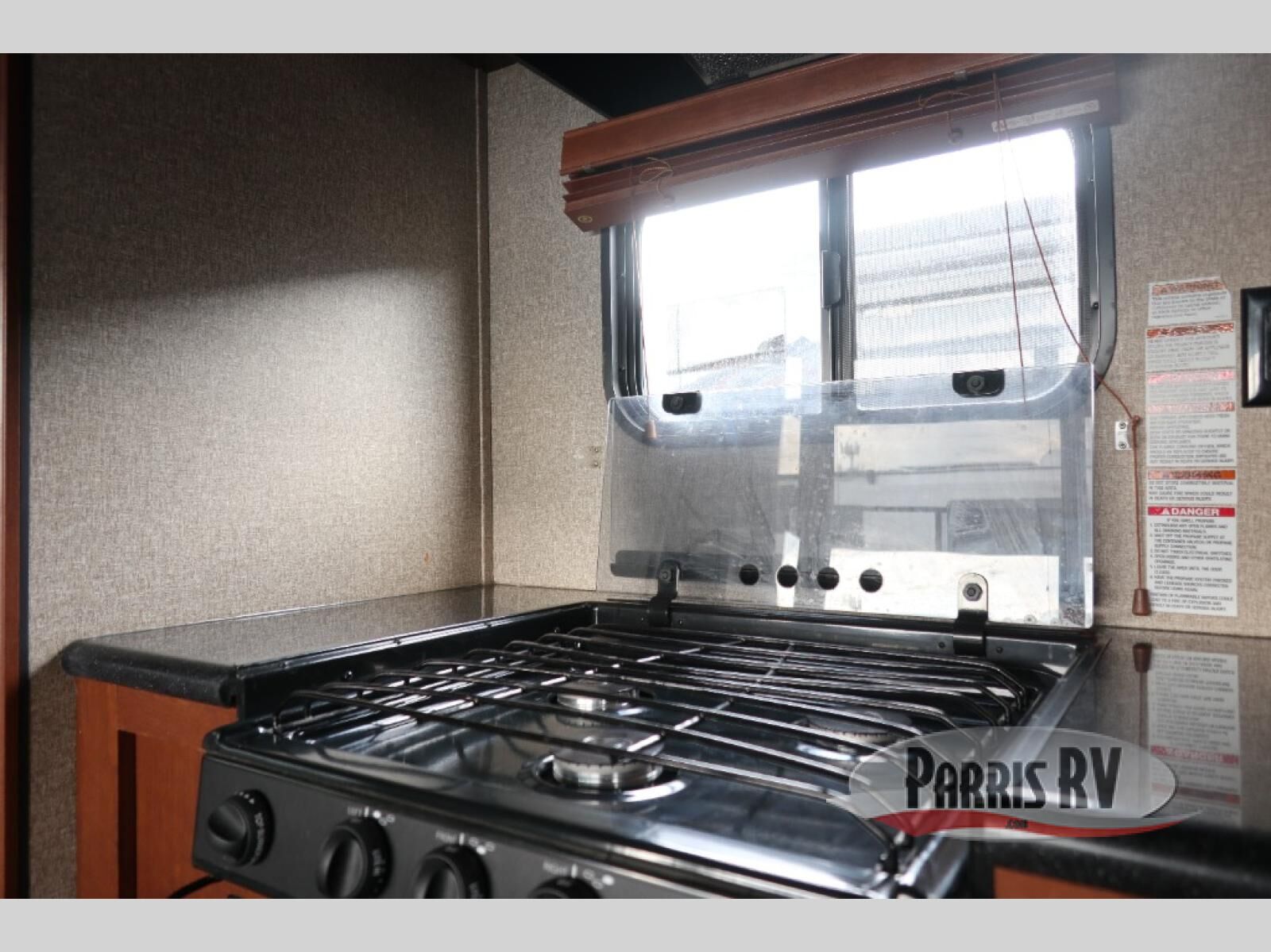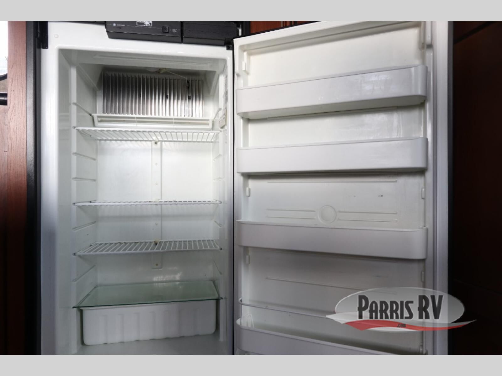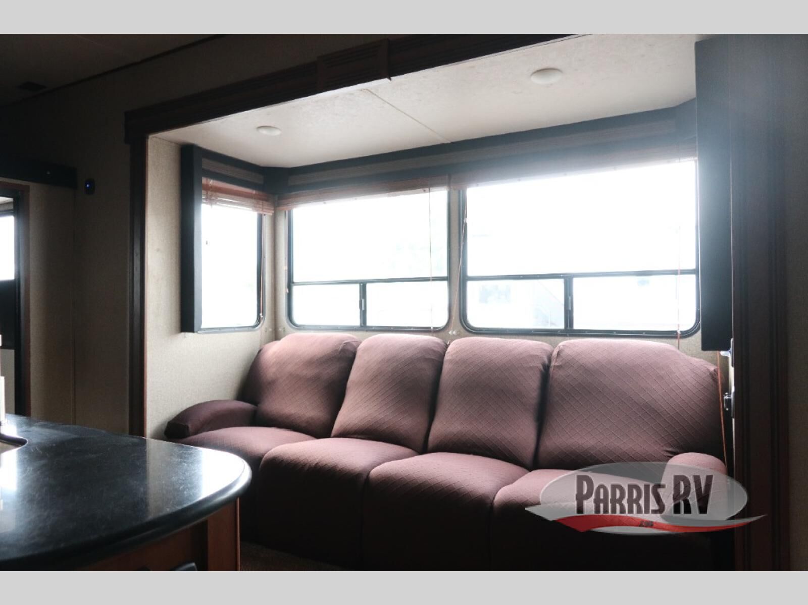 In the main living area there is a sofa slide with recliners. You will also find a pantry and another slide with a refrigerator, three burner range, and microwave. The kitchen island offers much counter space and a double kitchen sink. Along the front of the living area there is an entertainment center with a fireplace.