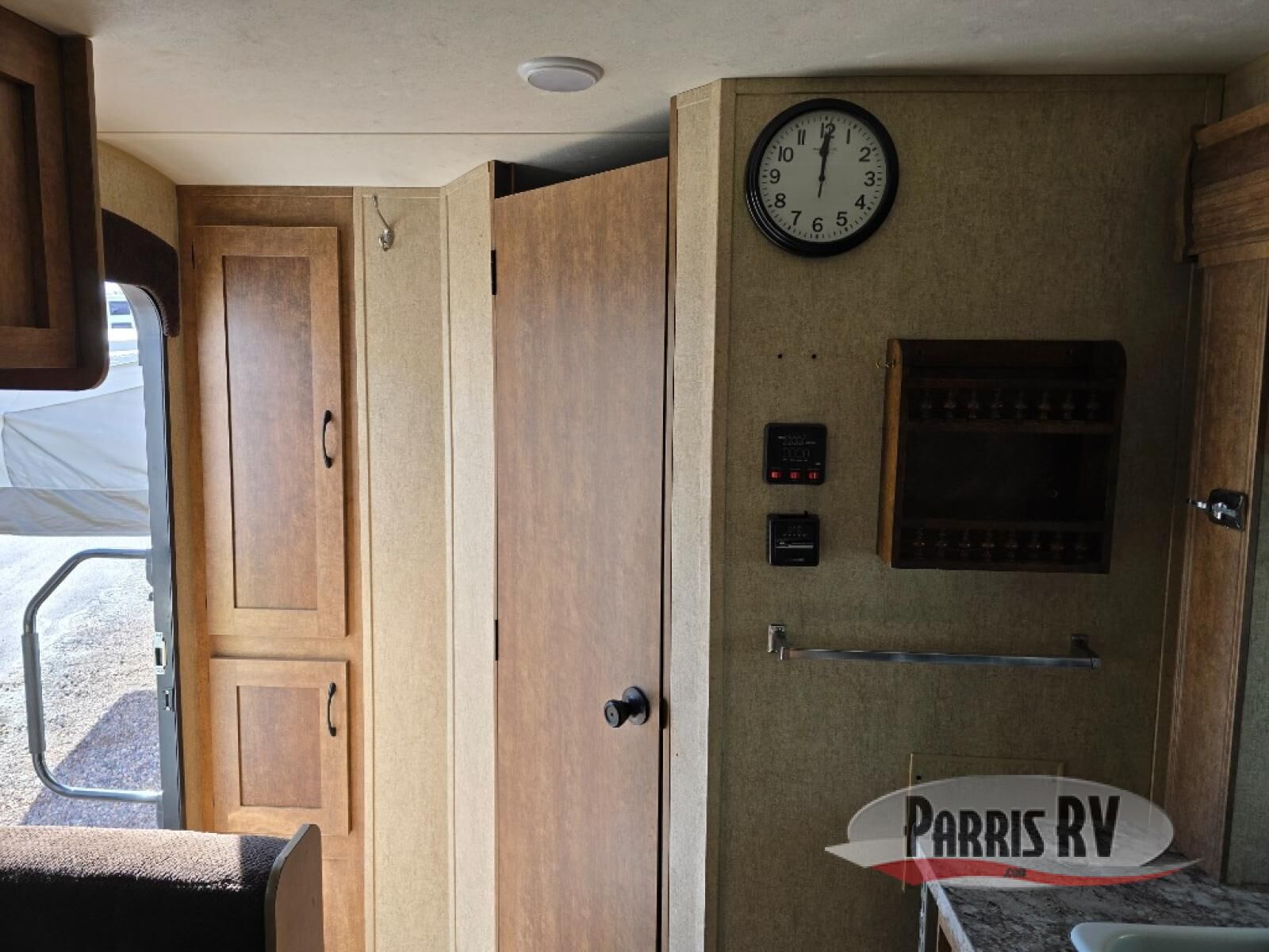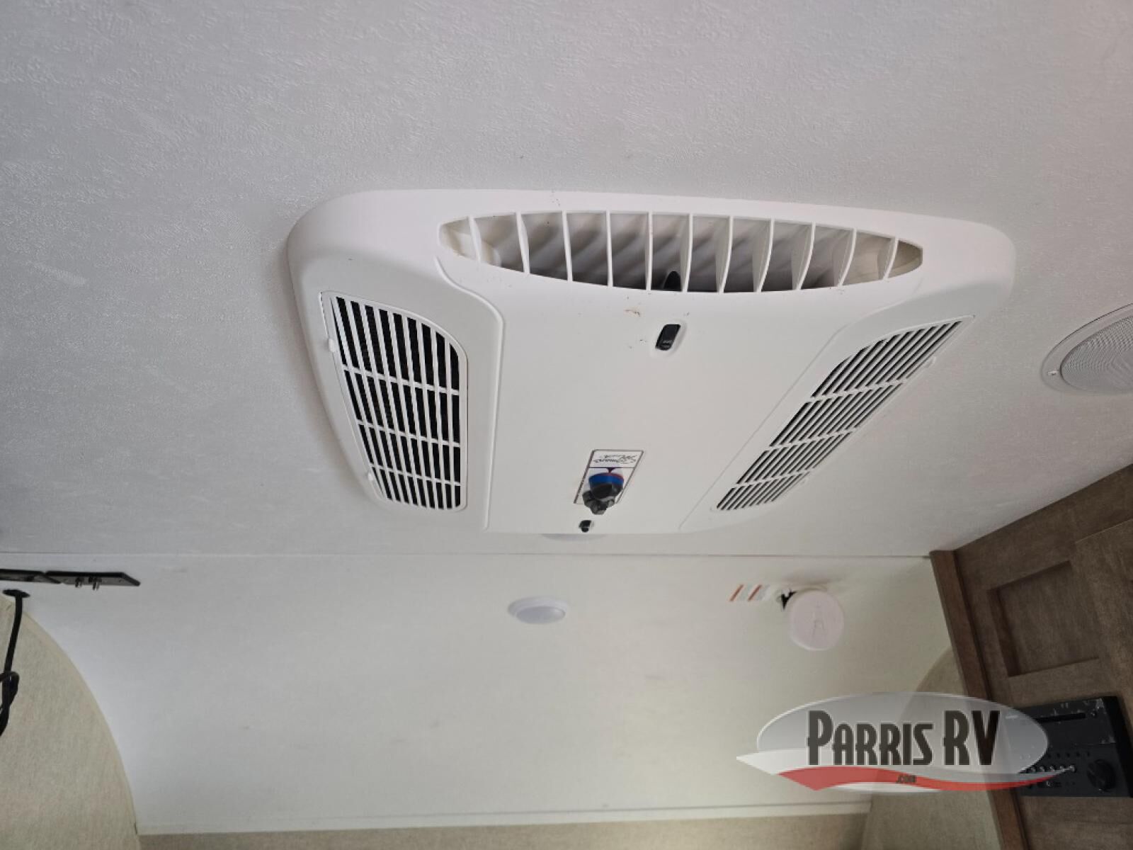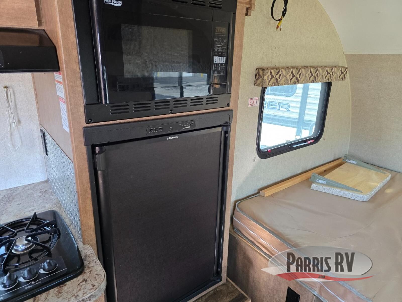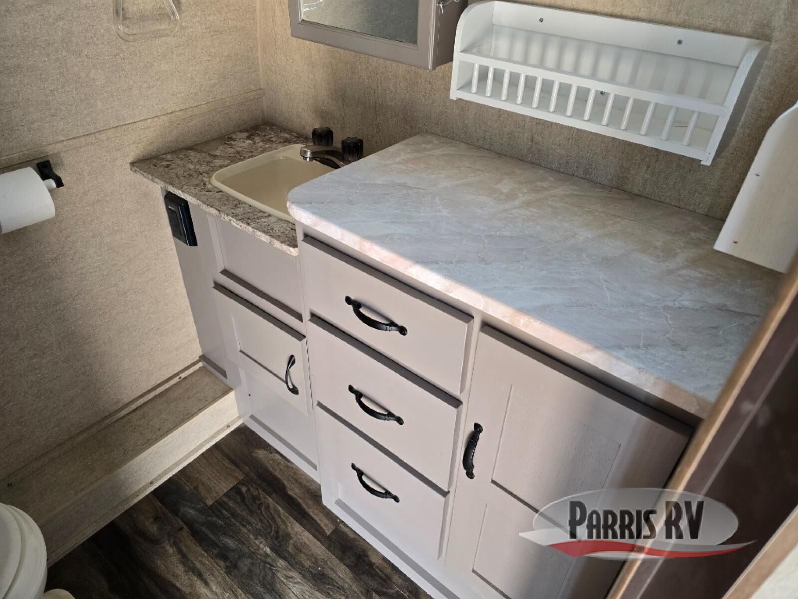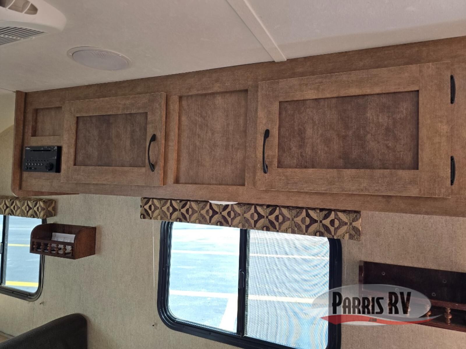 The slide out along the road side features a sink, a two burner range, a refrigerator with an overhead microwave, and an overhead cabinet where you can store dishes. Across from the slide out is the dinette and overhead cabinet, and located along the very front of this model is a queen bed.