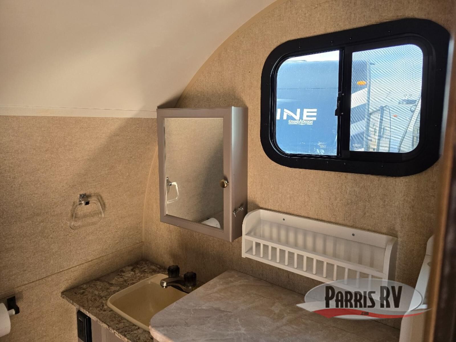 Along the rear of this model is the bathroom area. Here you will find a corner shower, a sink, a toilet, and a wardrobe.