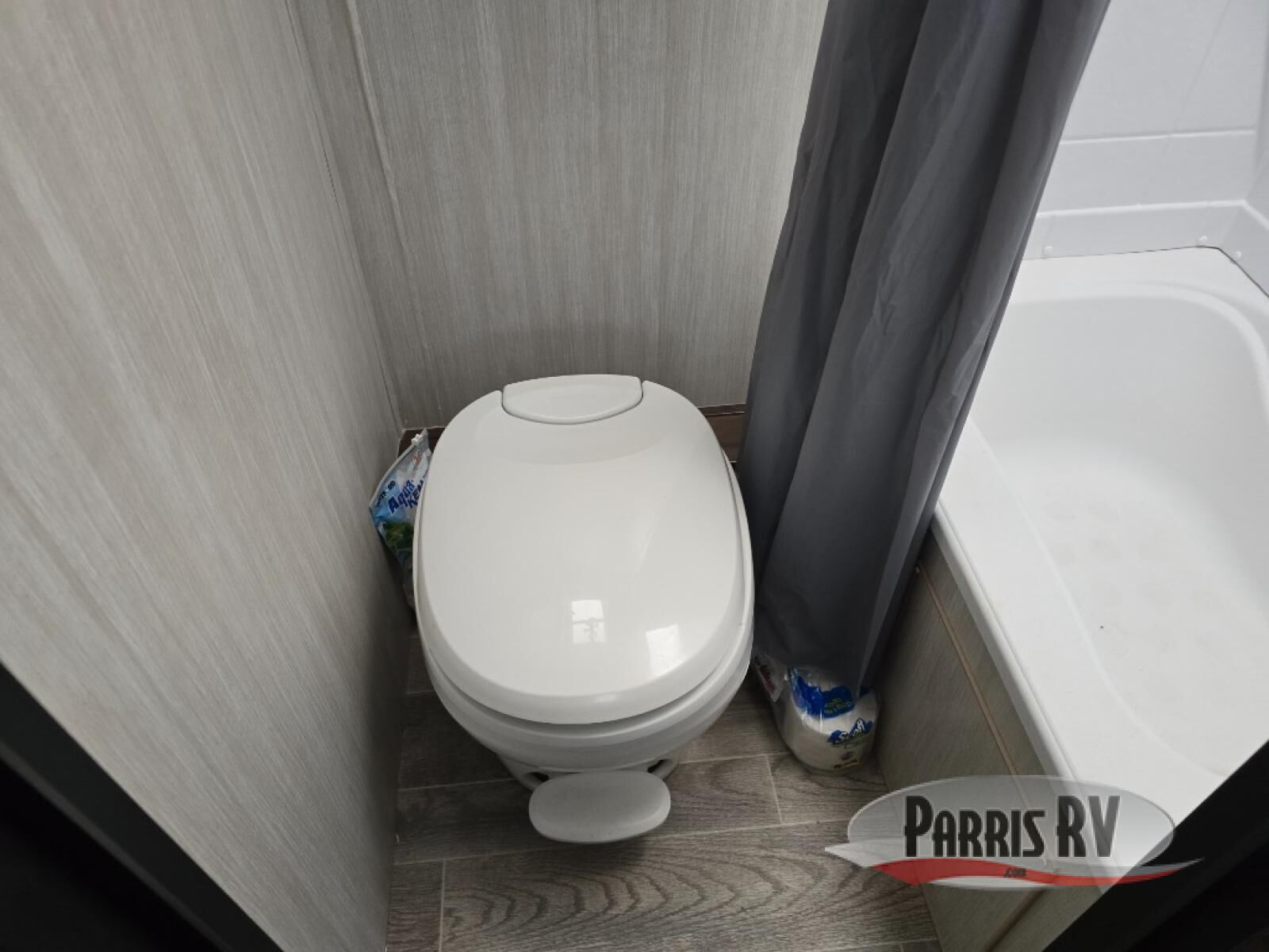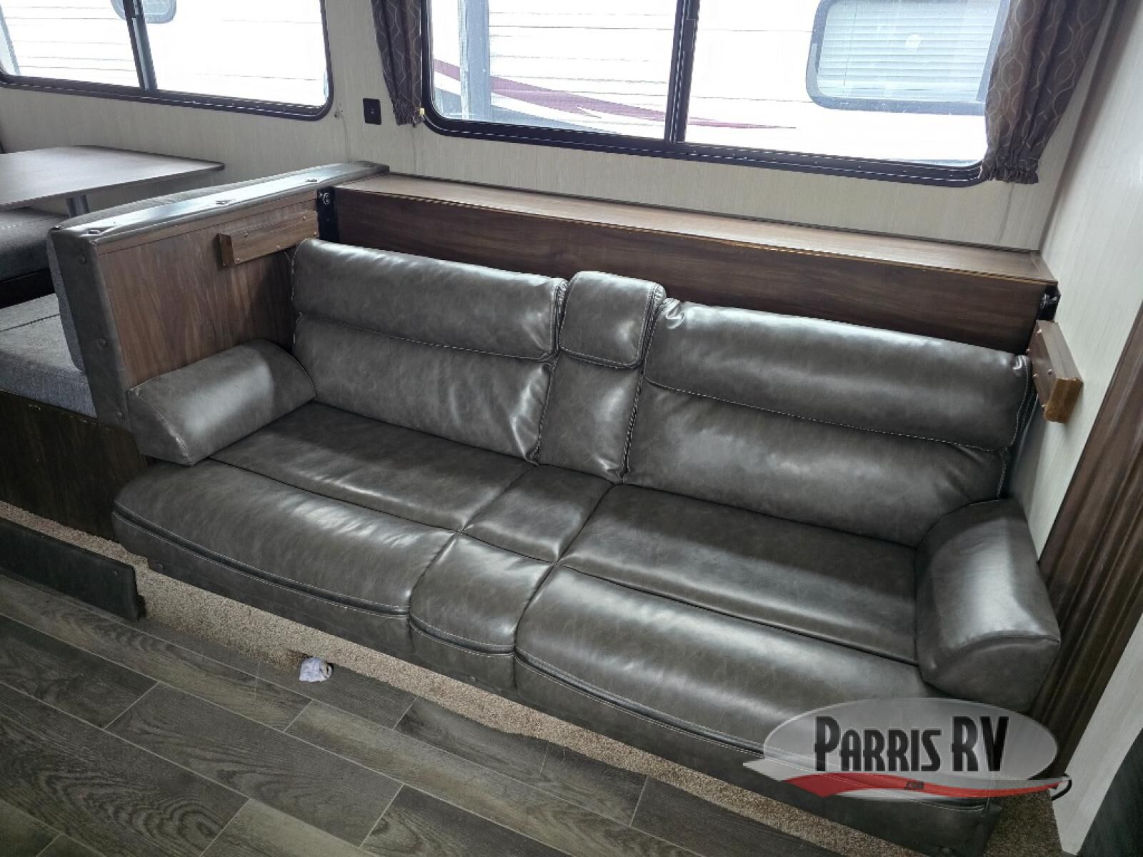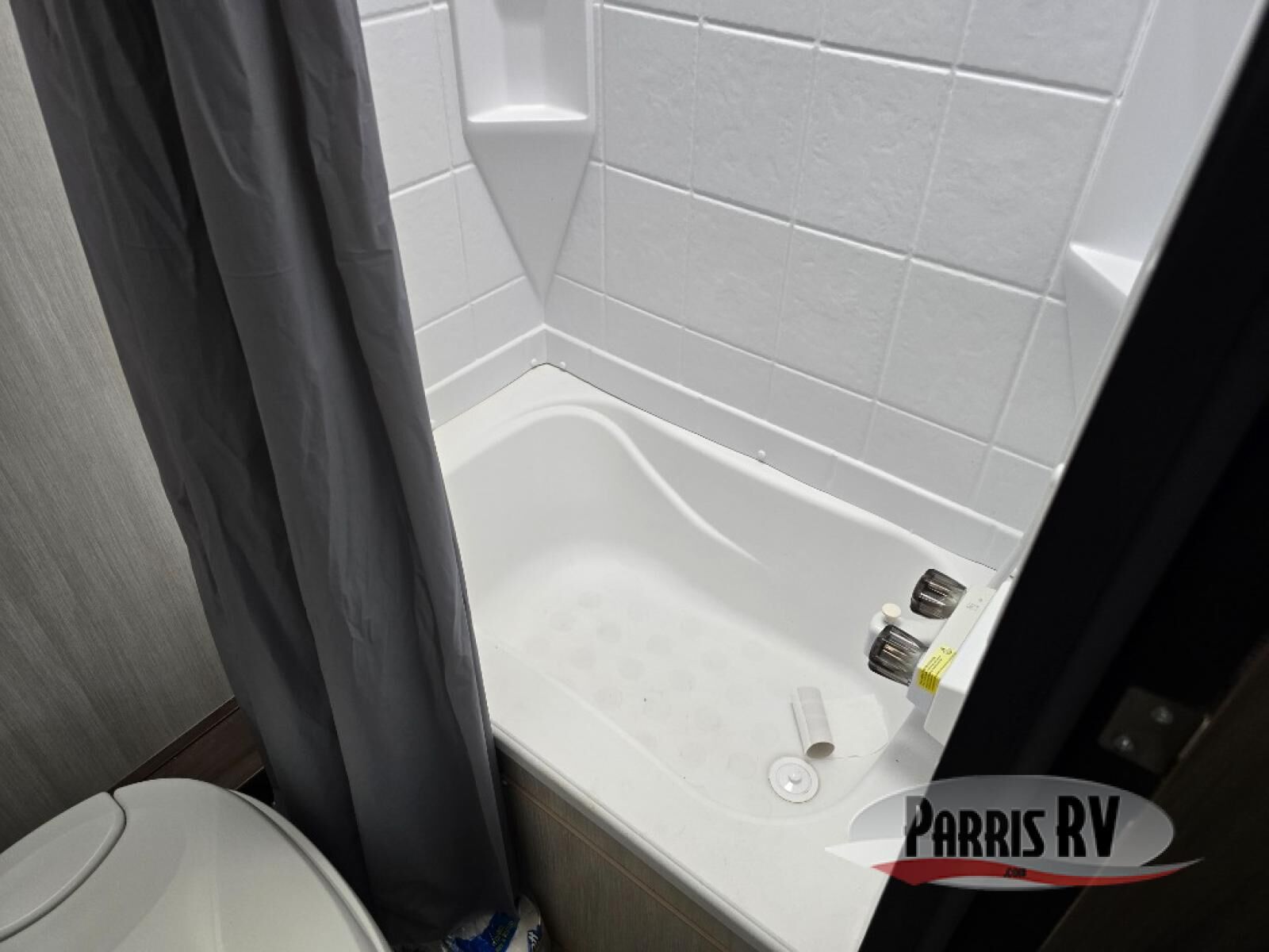 Imagine a large slide with a booth dinette and sofa with a hidden bunk above for nighttime. Now imagine you are sound asleep in your own queen bed while the kids sleep on the bunk and furniture. Everyone can wake up to the smell of pancakes being made on the cooktop and bacon in the microwave. Then you can take turns getting ready in privacy in the toilet and tub/shower room before making your outdoor plans. You will find plenty of storage for your clothing and such on the shelves and inside the cabinets, plus along the exterior in the outdoor storage areas.