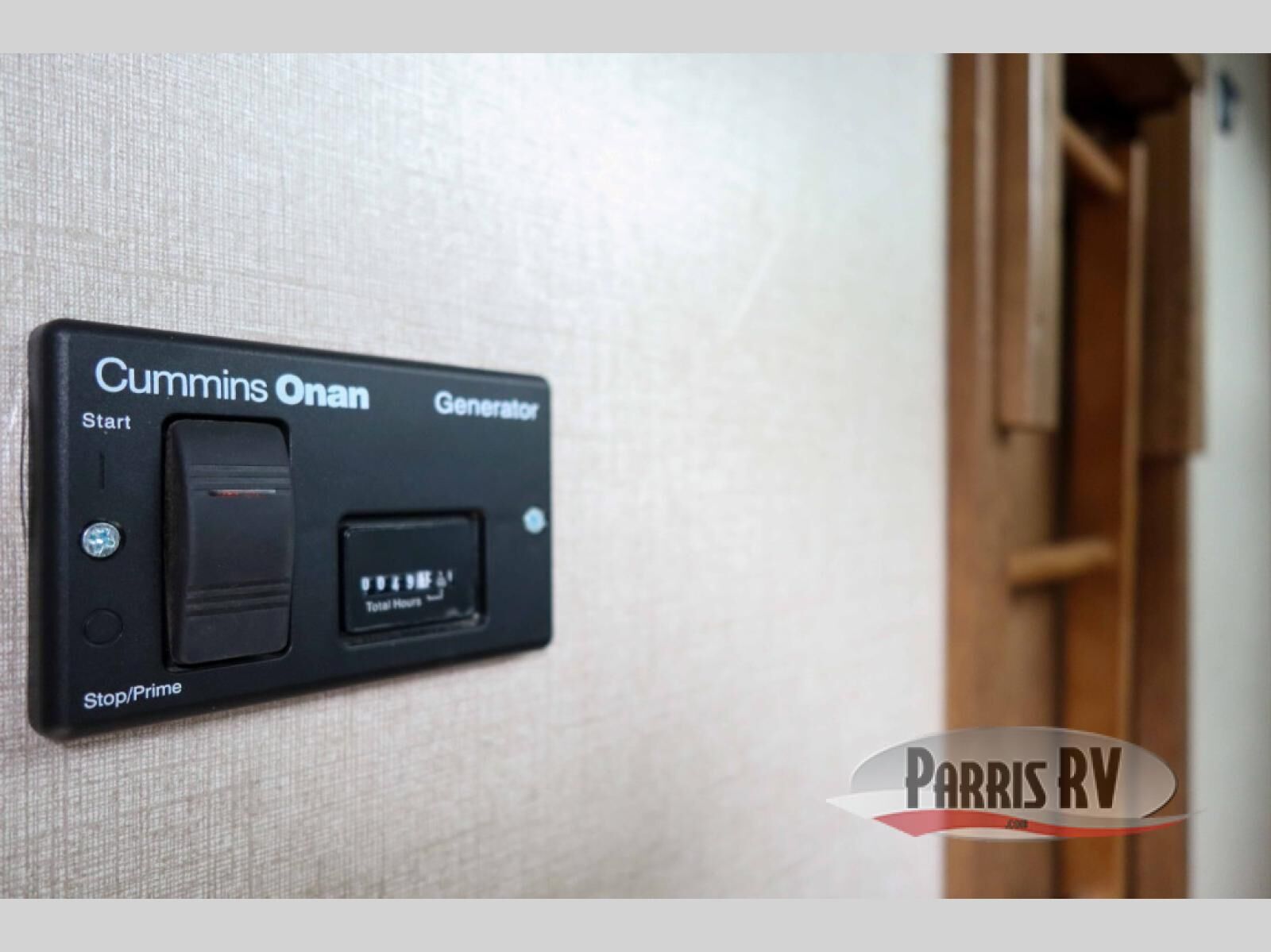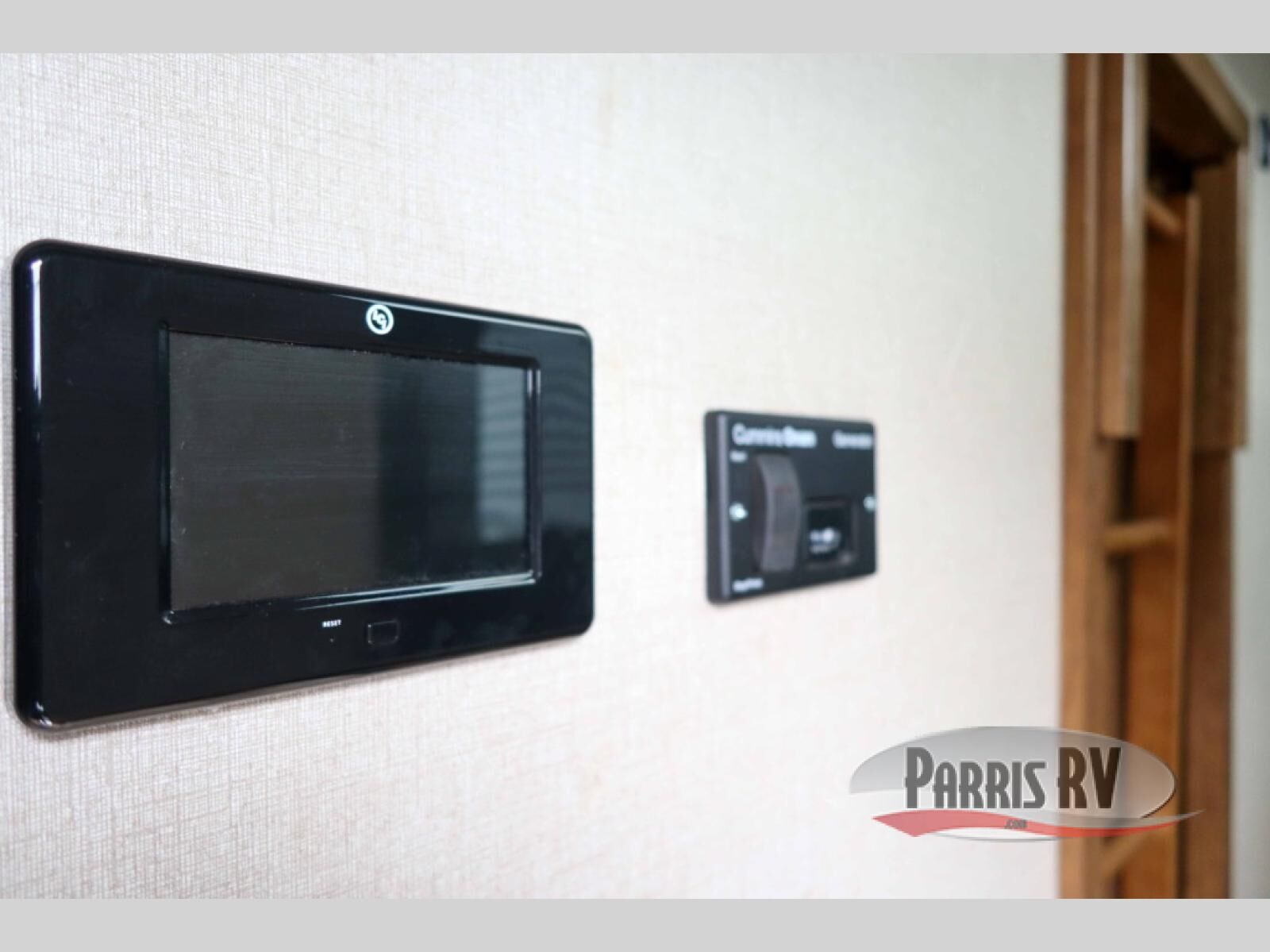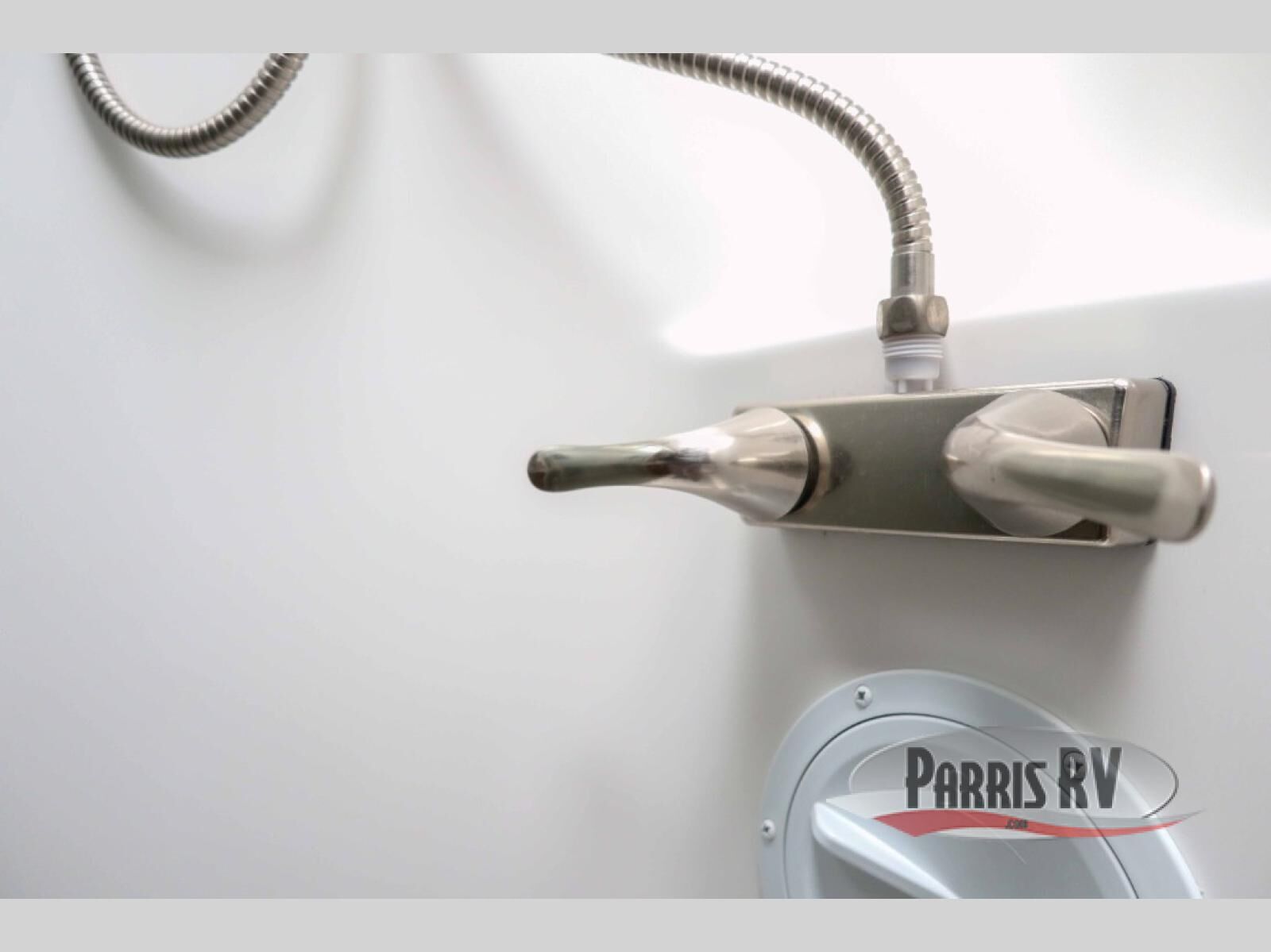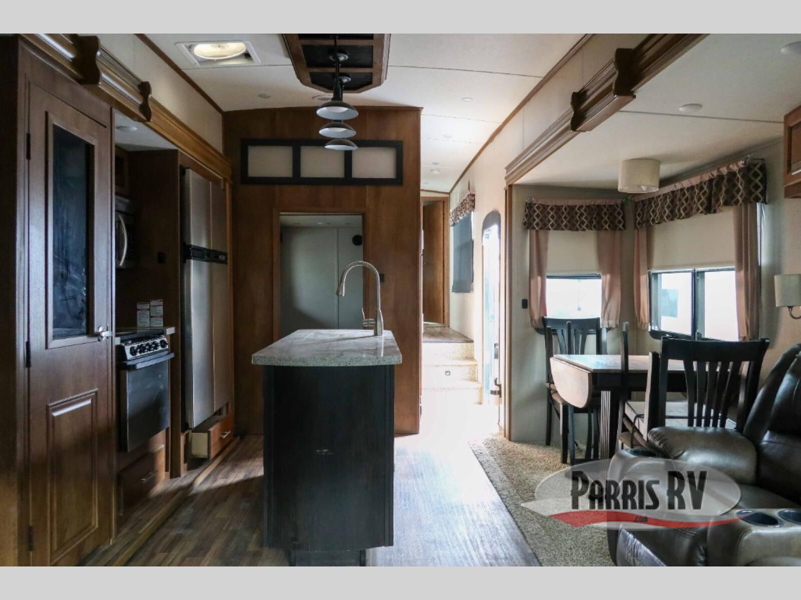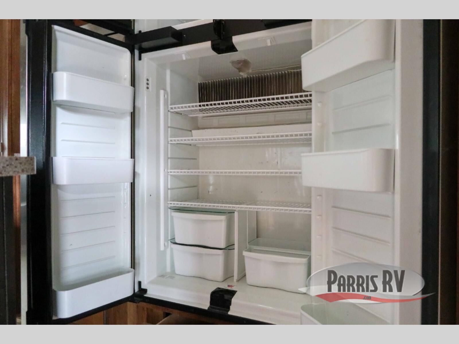 The opposite side slide out features an entertainment center adjacent to the sofa along with overhead storage for your things. There is also a pantry with drawers, a three burner range with overhead microwave oven, and refrigerator within this slide. The off set island provides added food prep space, plus a double kitchen sink.