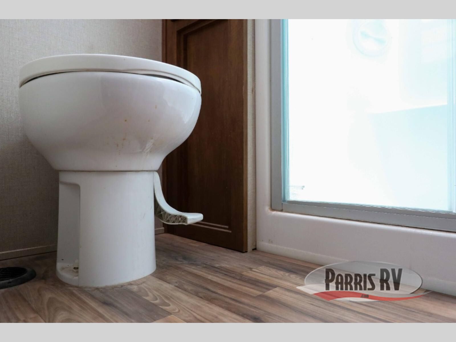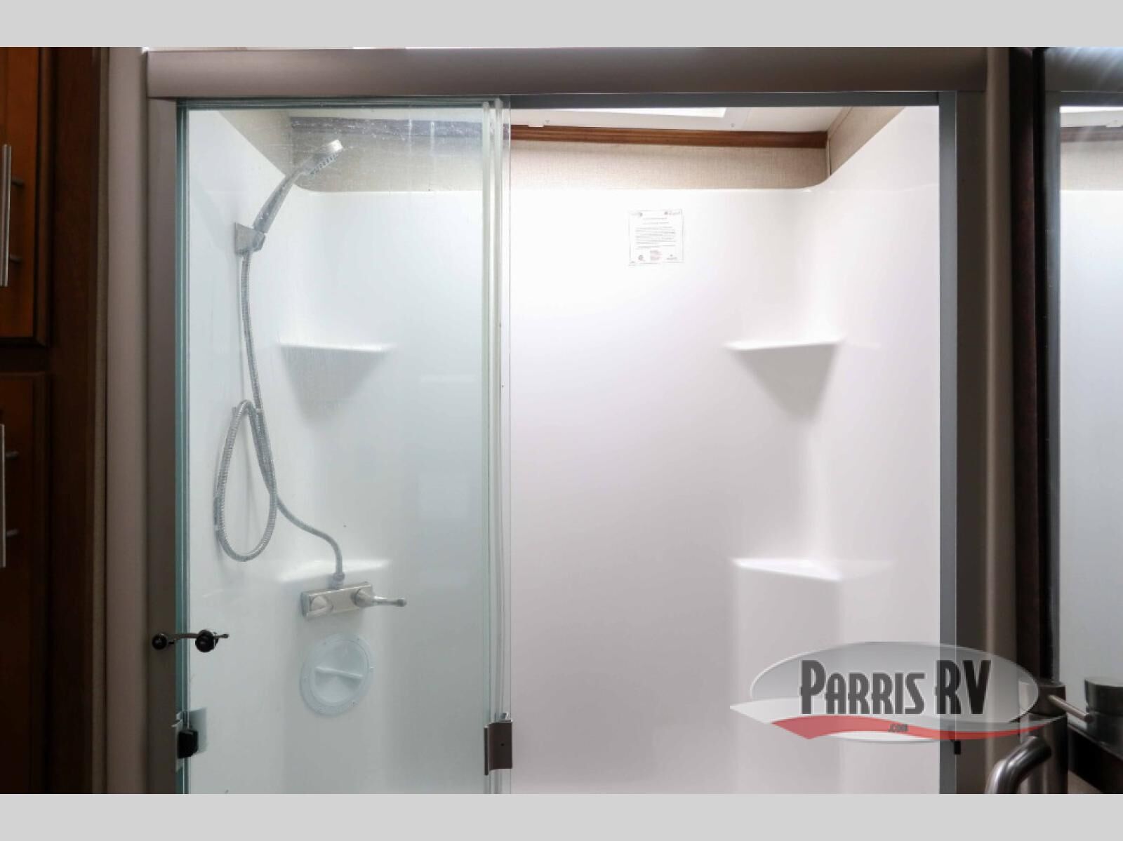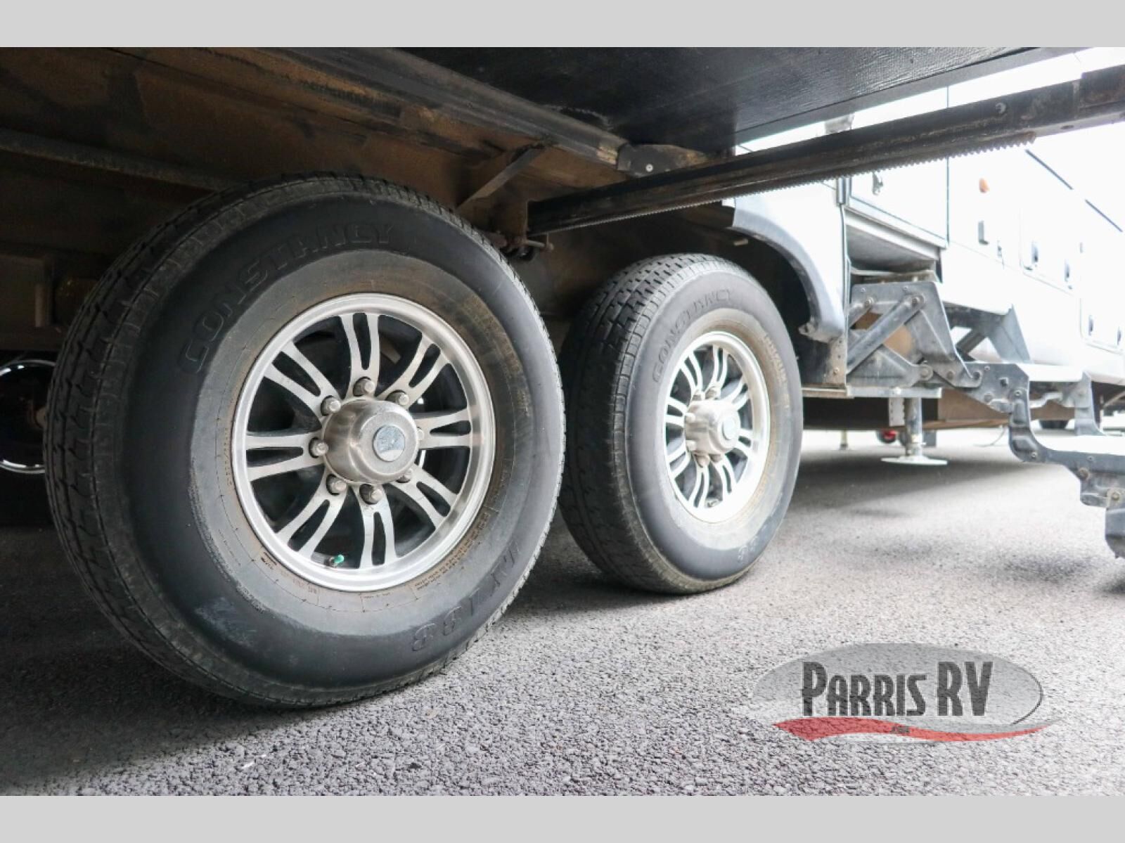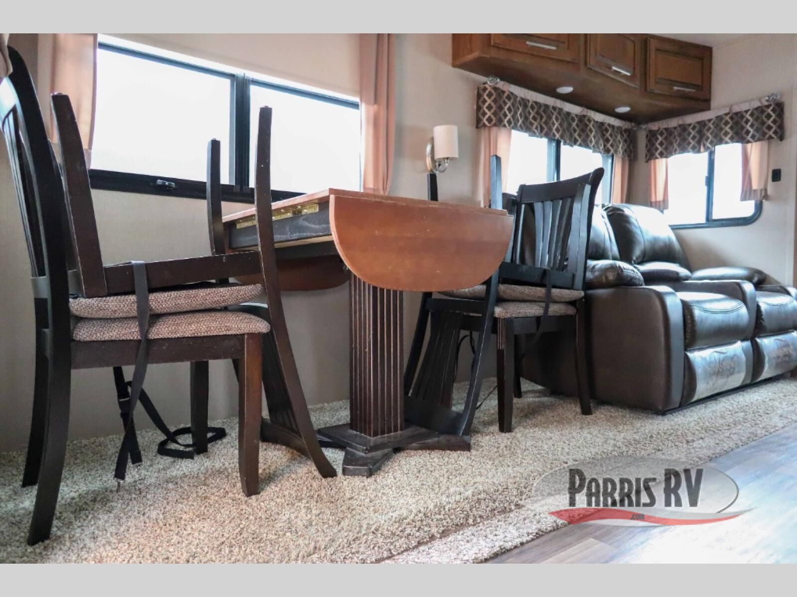 Step inside to a wide open interior space on your left with dual opposing slides. There is a slide out dining table with four chairs and two lounge chairs including storage above. Along the rear wall find a hide-a-bed sofa with storage cabinets overhead the entire width of the unit making this a nice conversation or TV watching area.