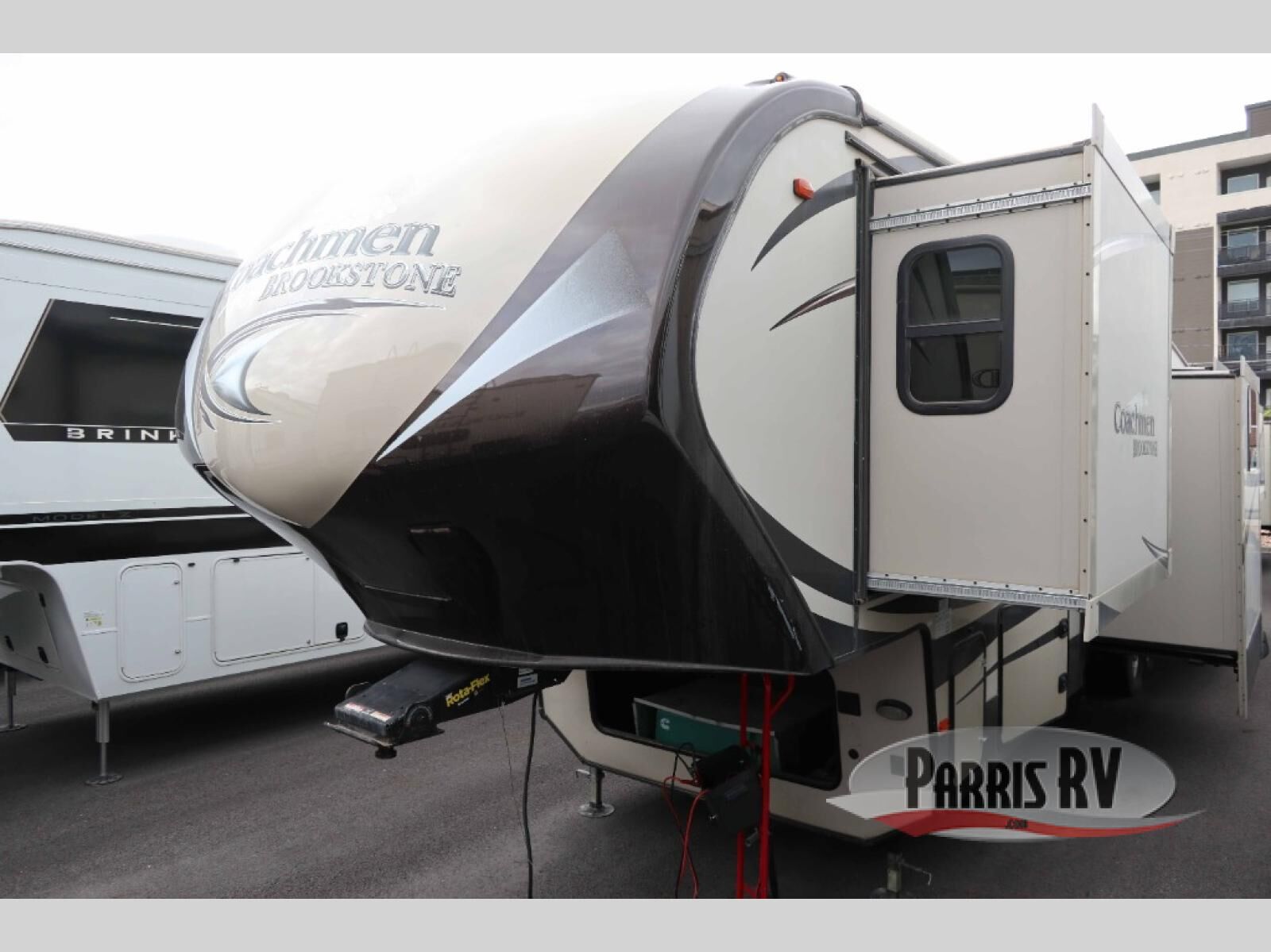 This Coachmen Brookstone fifth wheel will make traveling with family and friends enjoyable. Model 395RL features a rear living layout, quadruple slides for added interior space, a second bedroom with a loft above, and so much more!