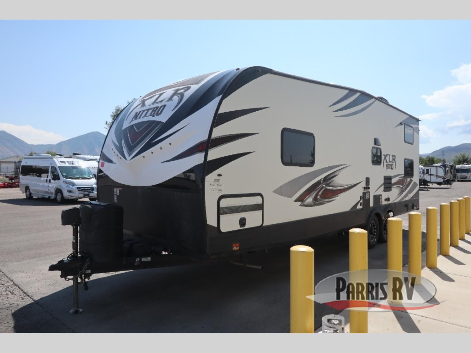 When your adventures require a bit of off-road fun, choose this Nitro XLR toy hauler travel trailer as your home base! A zero gravity 8' rear ramp door makes loading and unloading a breeze, and the 5,000 lb. tie downs will keep all of your toys and gear secure while you travel. Playing will be the only hard part of your adventures because with this Nitro XLR toy hauler you will have plenty of comfort when you are done. A spacious bath across from the side entry makes it easy to slip in and get cleaned up without leaving too much of a trail. And, if you are really dusty and dirty from playing hard outside, you can use the exterior hot and cold spray port to rinse off any evidence of fun before heading inside. A private bedroom with king bed up front offers plenty of room for you to dream of your next ride, and your guests will find their sleeping space just as comfy in back with the standard electric bed and pass-through dinette below that can convert making room to easily sleep four!