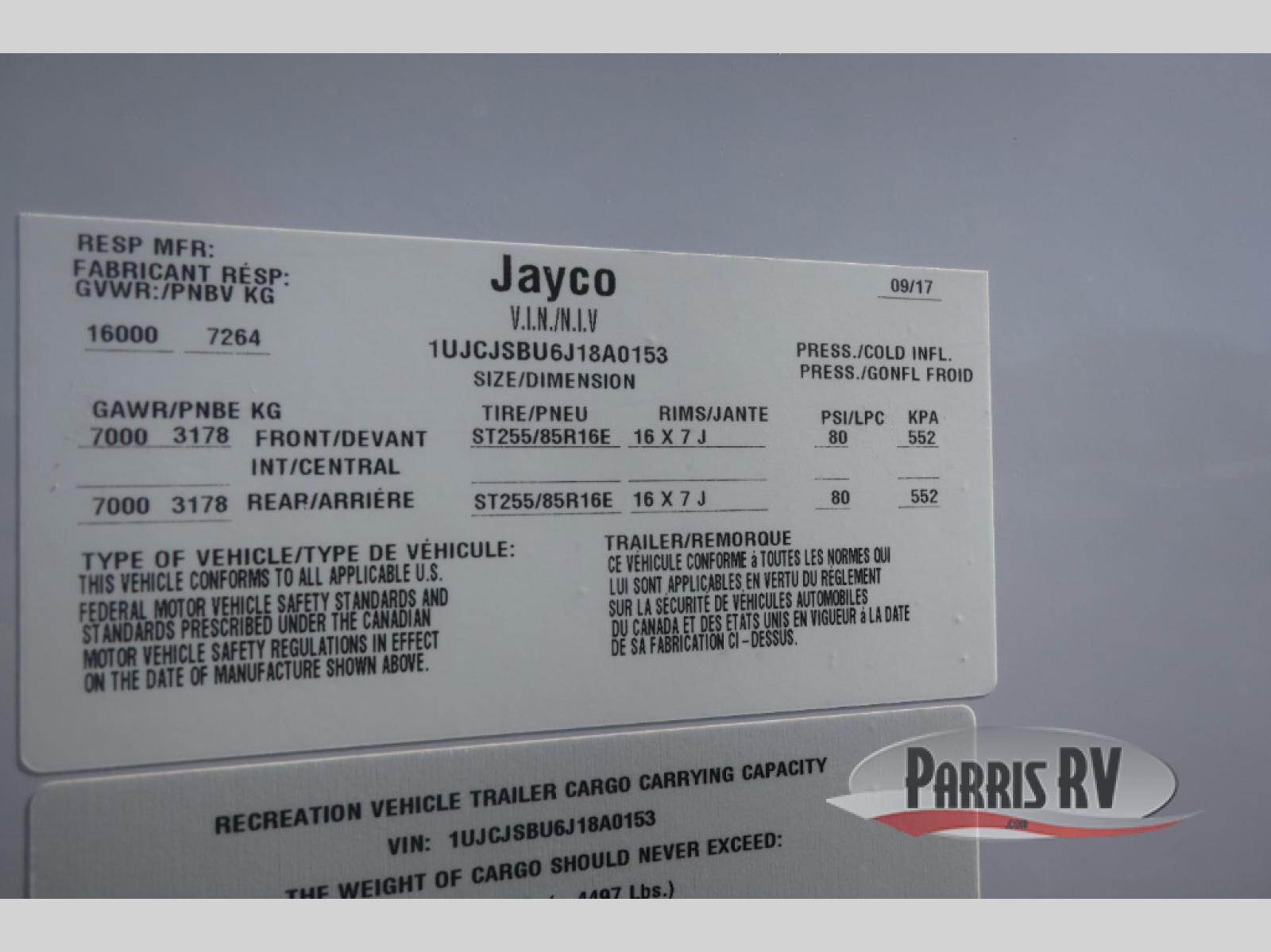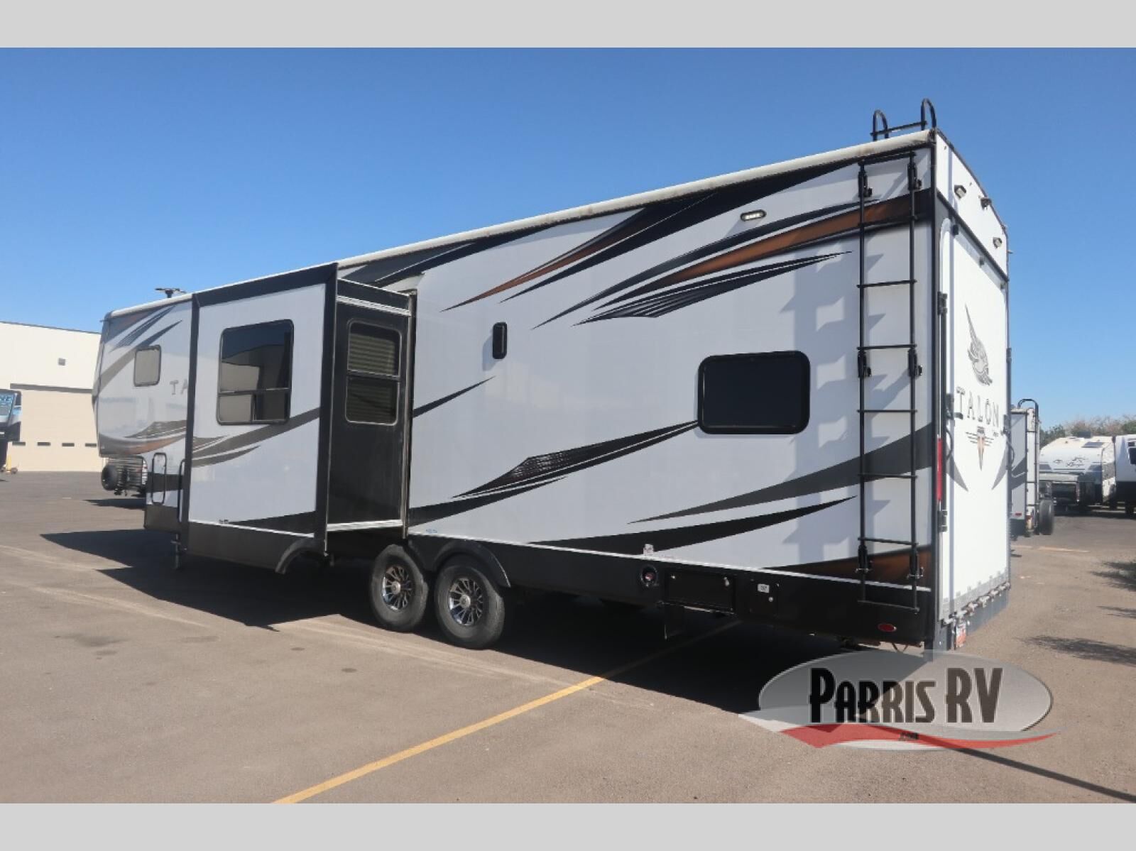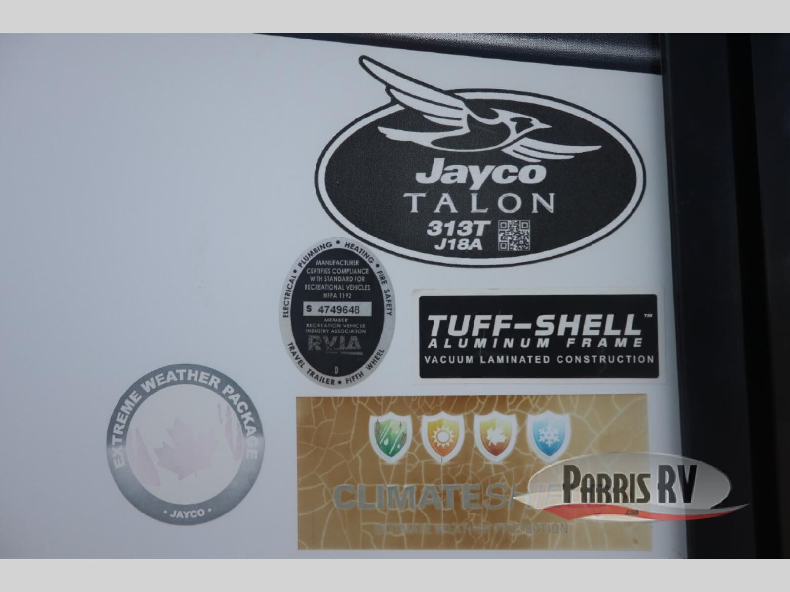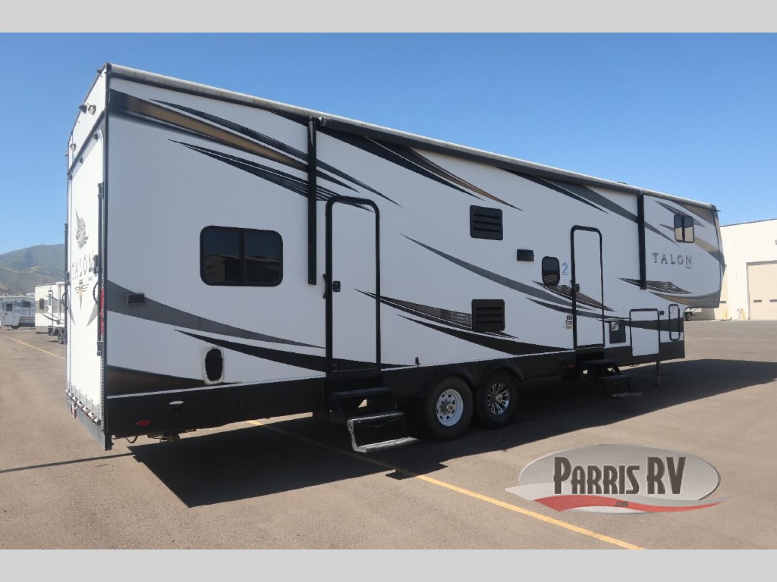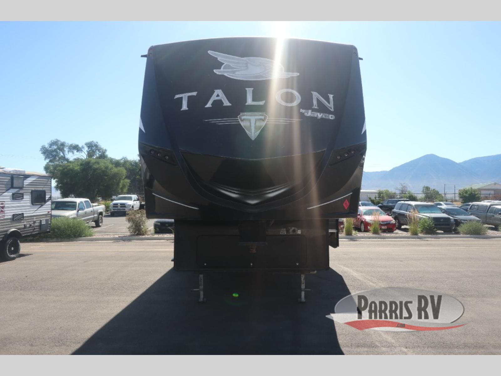 Owning this Jayco Talon toy hauler means that you own the ability to adventure anytime and anywhere. The comforts of home have been included in this unit with the addition of items such as the stainless steel, residential-sized appliances and whole-house LED lighting. The front, private bedroom, with a Jayco-exclusive Simmons mattress, allows you the privacy to which you are accustomed, and the bathroom skylight gives the space a fresh look throughout the day.