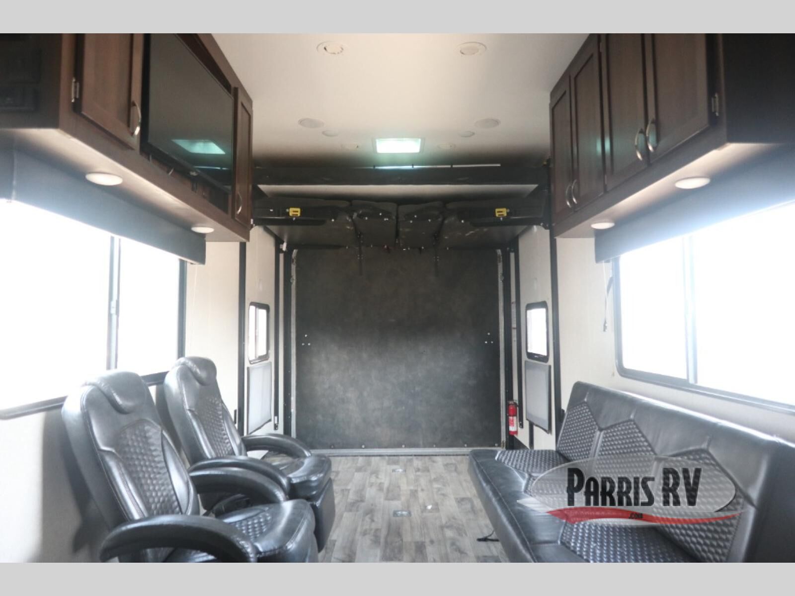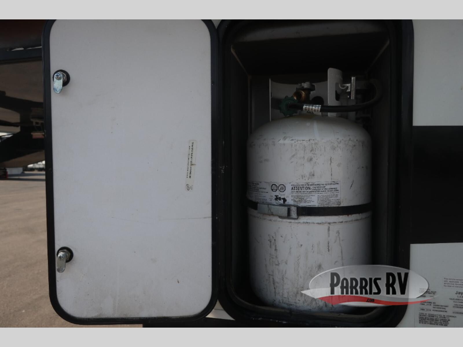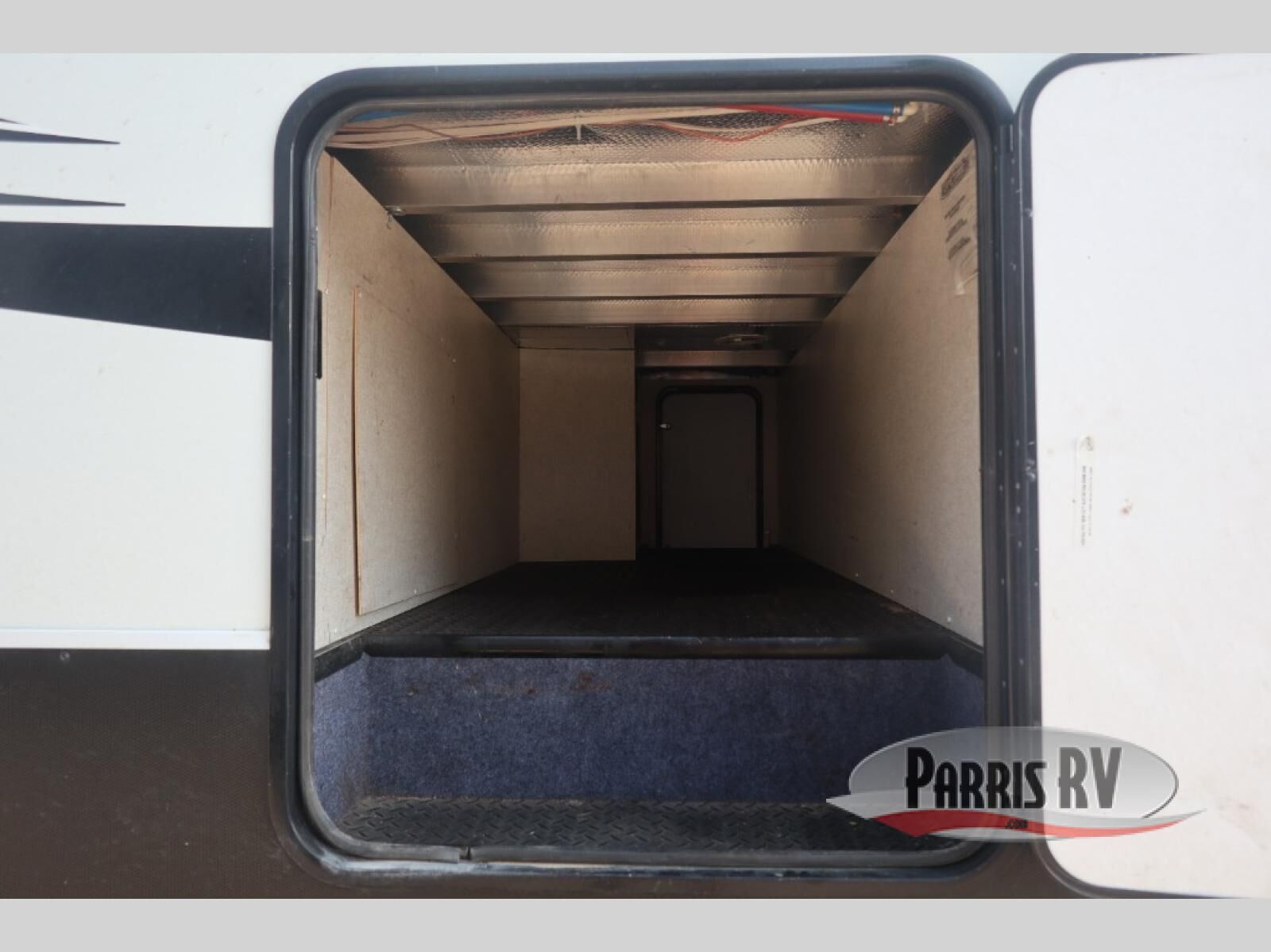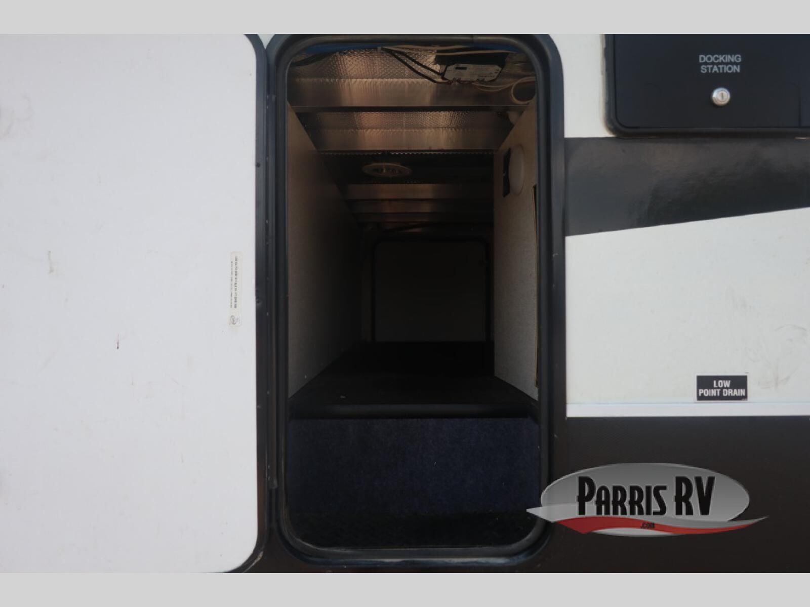 The best feature of this Jayco toy hauler is definitely the versatile garage area. The 2,500 LB capacity ramp allows you to tow along even the heaviest of outdoor accessories during the day, and the convertible sofa beds and pull-down ramp door screen allow you to have a lounge and relaxation area each night. During those cool summer evenings when the night sky shines its brightest, you can sit with friends on the enclosed ramp or take the party outdoors underneath the electric awning lined with LED lighting. The included lockable and insulated storage doors are a part of the Keyed Alike single key system which means that you only need to worry about one key for the entire unit, and the 16" tires that this toy hauler is built upon are a part of the American-made Goodyear brand.