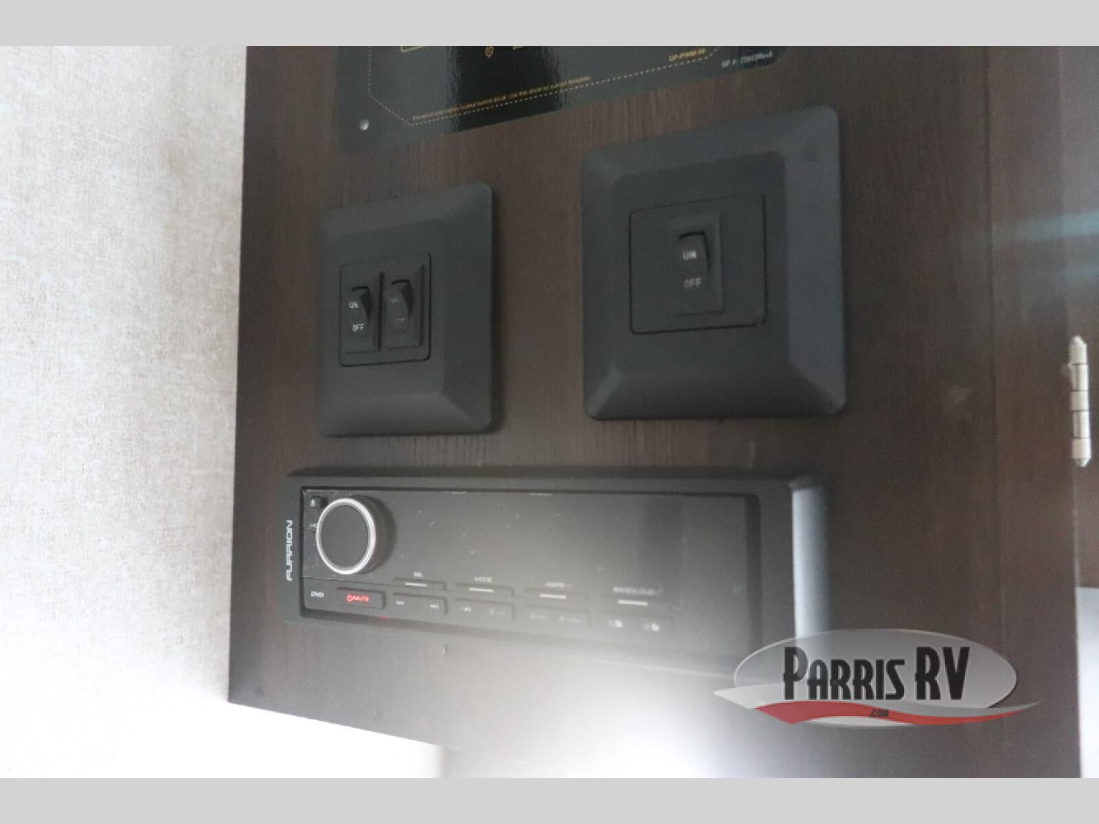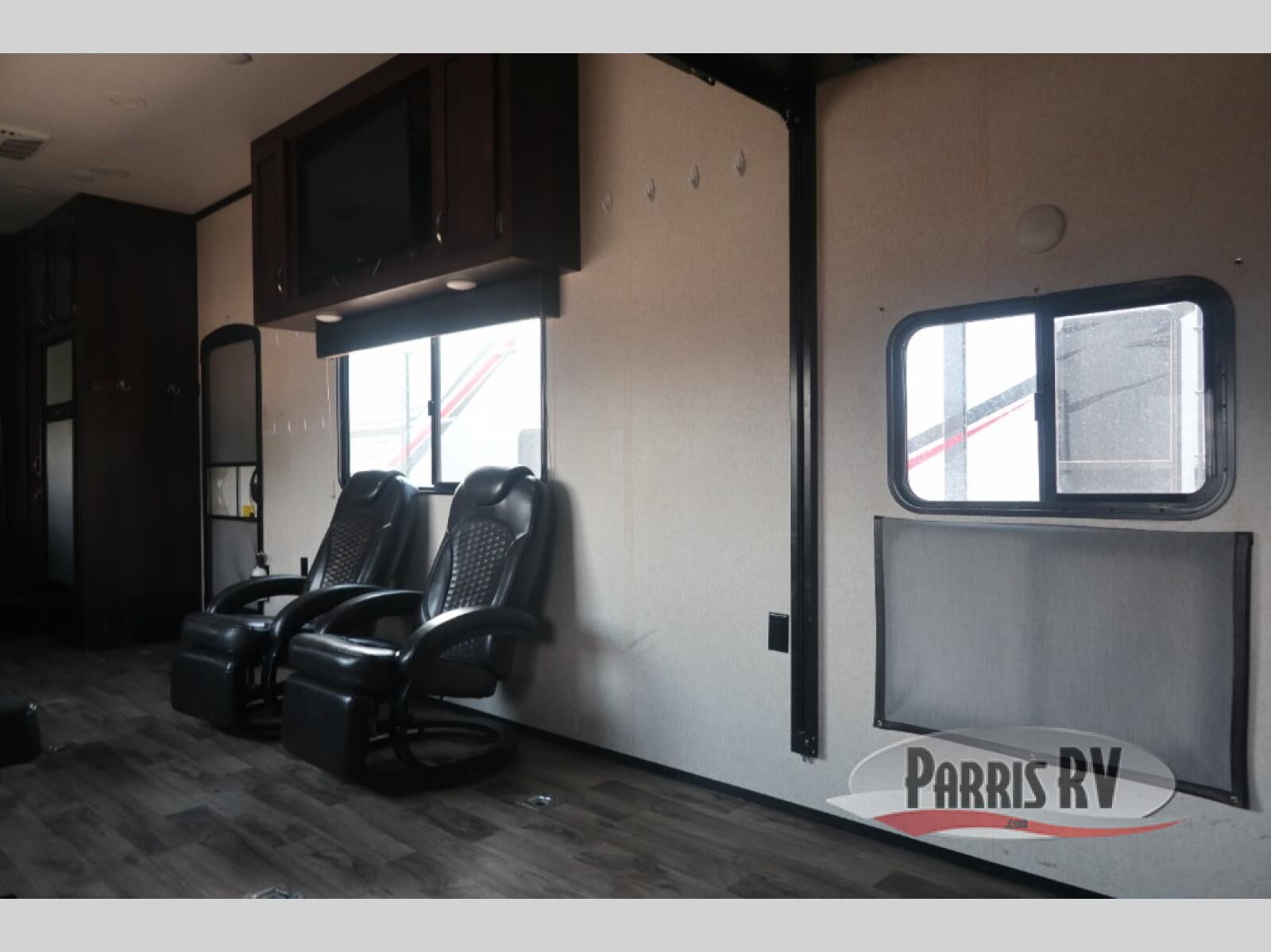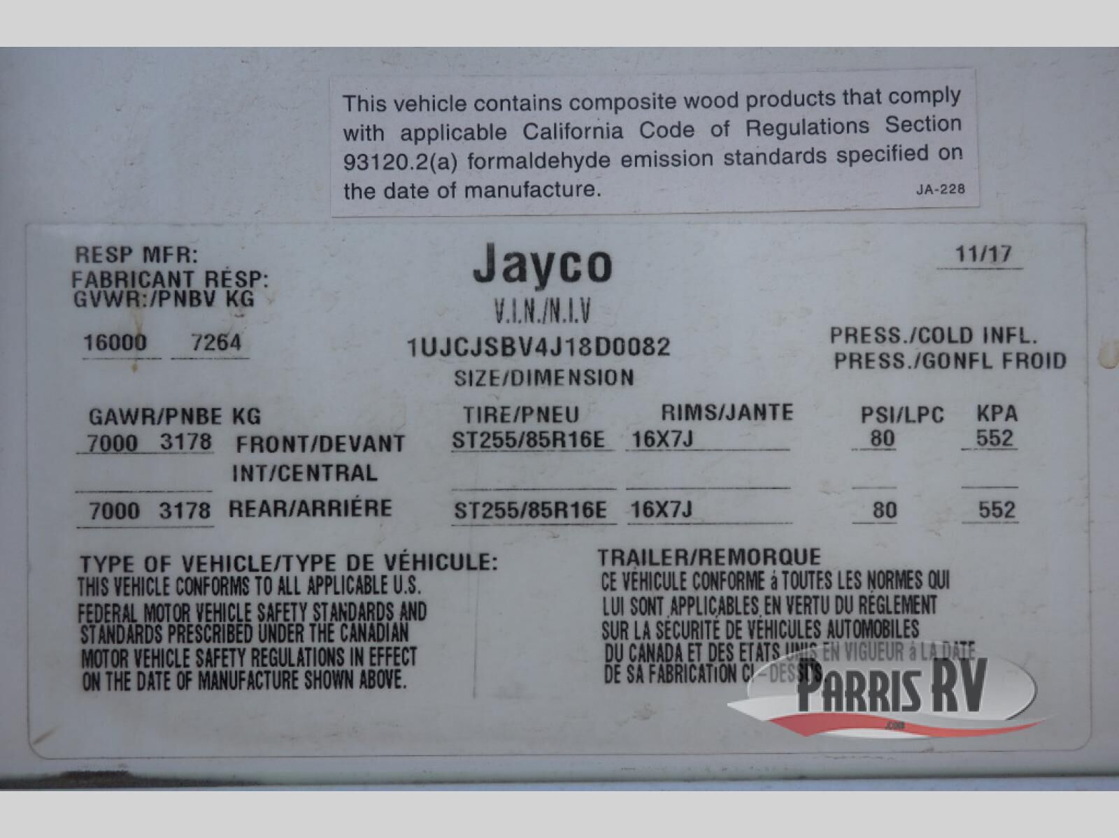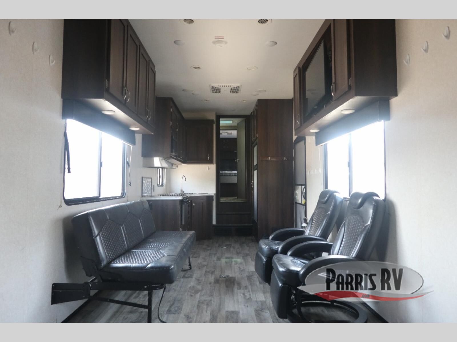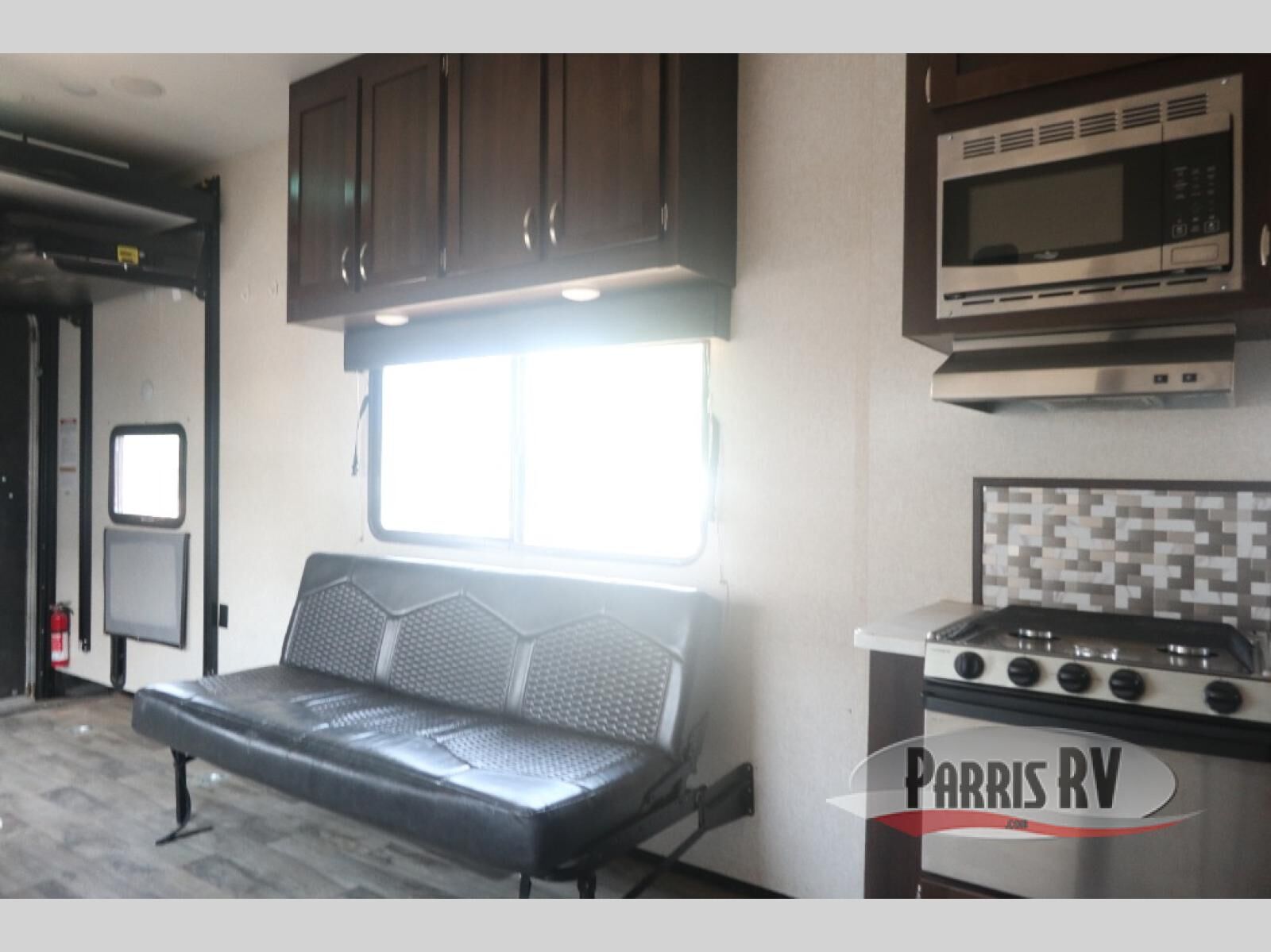 The best feature of this Jayco toy hauler is definitely the versatile garage area. The 2,500 LB capacity ramp allows you to tow along even the heaviest of outdoor accessories during the day, and the convertible sofa beds and pull-down ramp door screen allow you to have a lounge and relaxation area each night. During those cool summer evenings when the night sky shines its brightest, you can sit with friends on the enclosed ramp or take the party outdoors underneath the electric awning lined with LED lighting. The included lockable and insulated storage doors are a part of the Keyed Alike single key system which means that you only need to worry about one key for the entire unit, and the 16" tires that this toy hauler is built upon are a part of the American-made Goodyear brand.