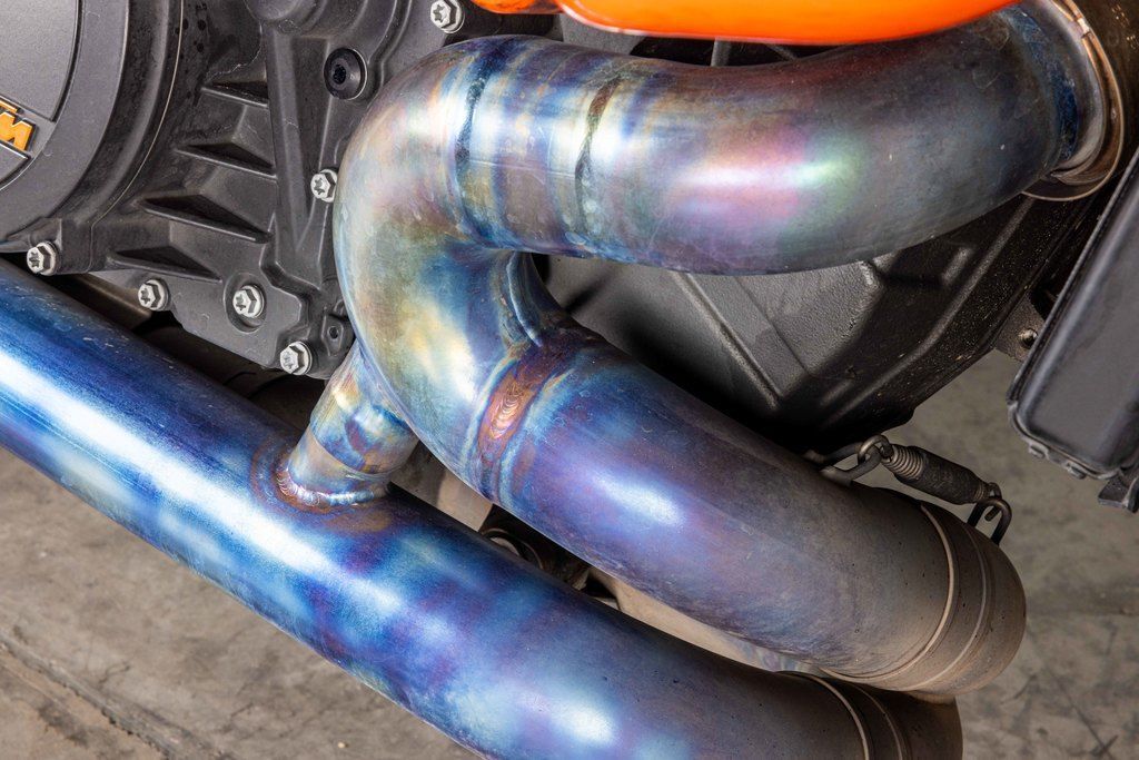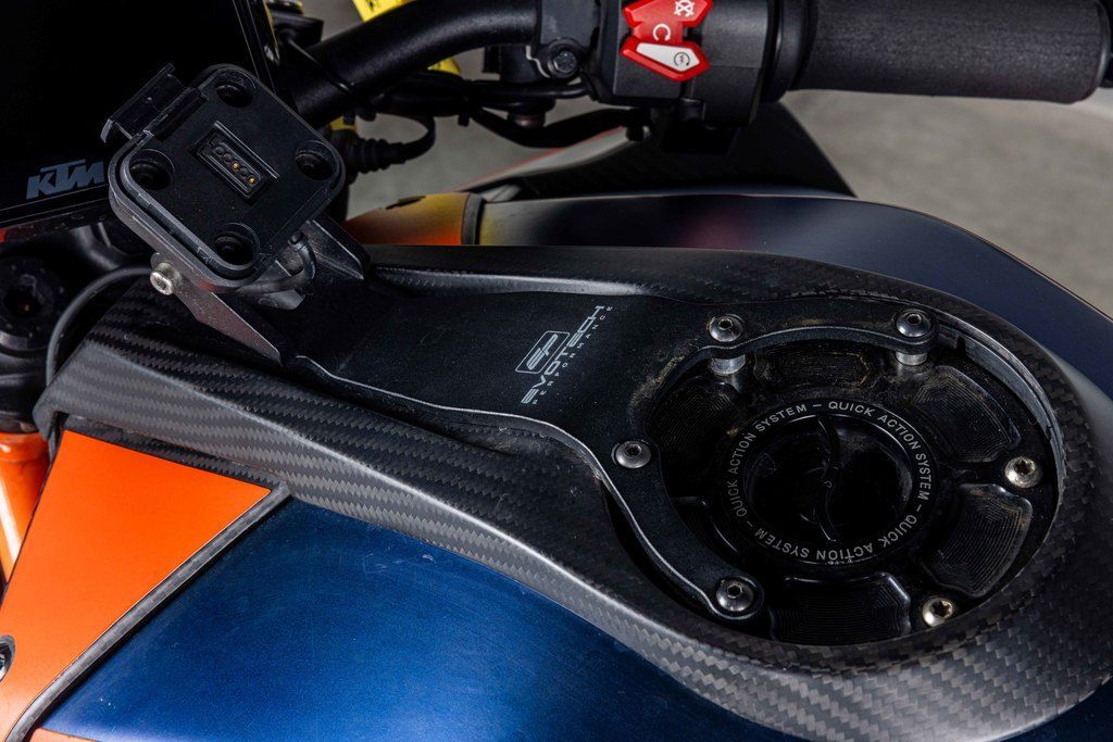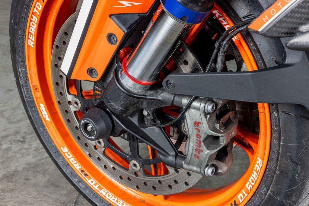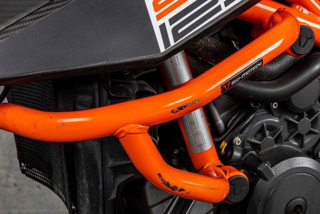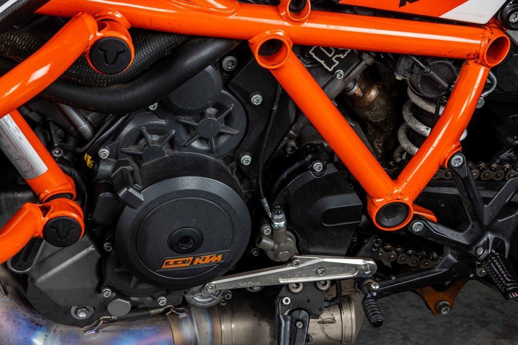 The frame, which uses the engine as a means to increase torsional rigidity, has resulted in the KTM 1290 SUPER DUKE R EVO being 3 times stiffer than its predecessor. This allows for an effortless, confidence-inspiring riding position which translate into an ultimately faster ride. This is achieved by maximizing the feedback from the chassis and the front tire. The frame also makes use of thicker diameter tubes with thinner walls, which is the single biggest weight saving measure on the bike - saving 2 kg compared to the previous generation model.