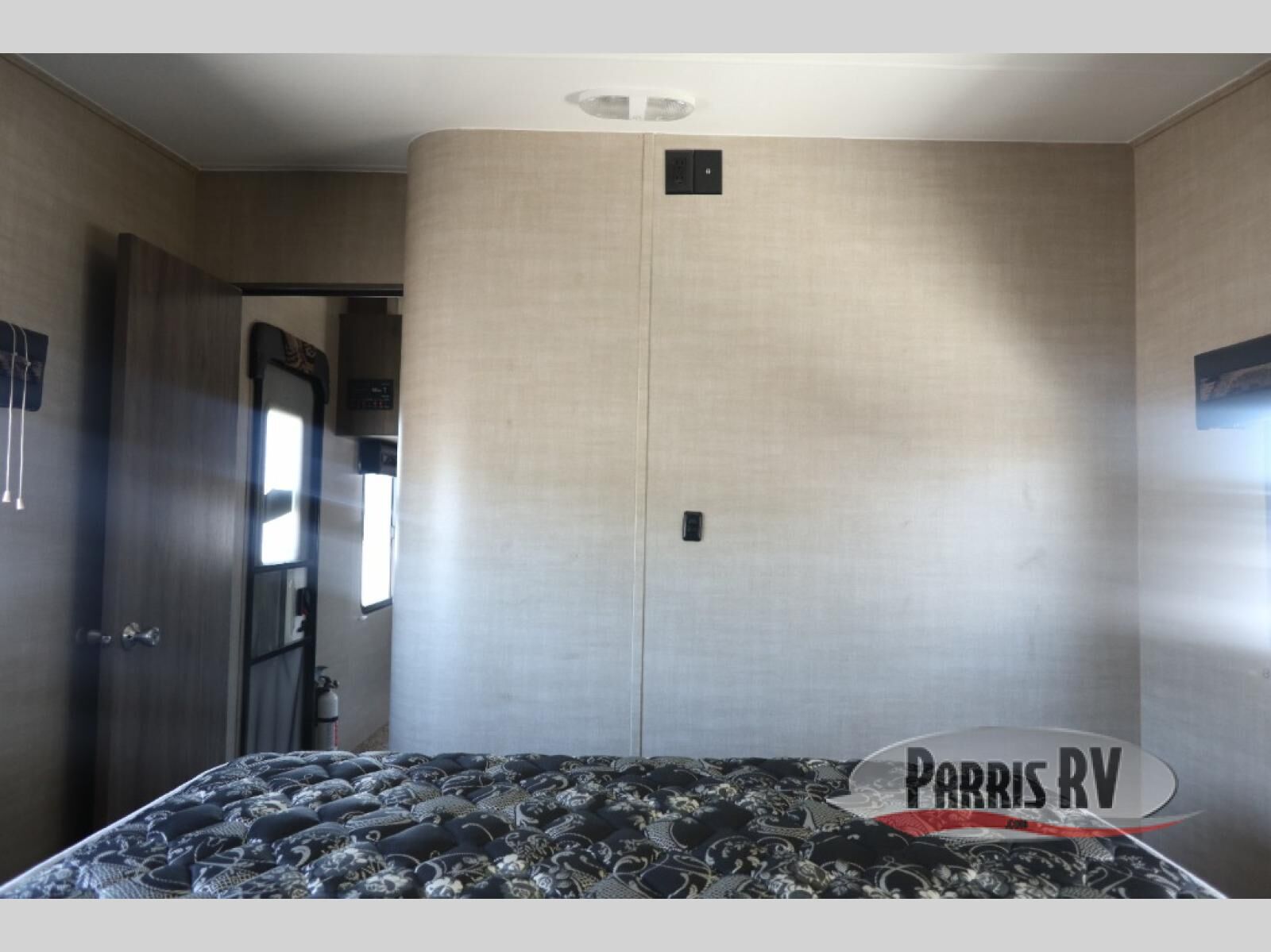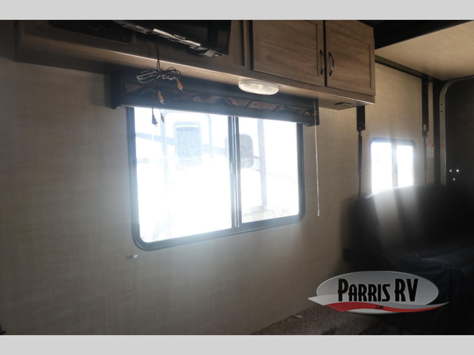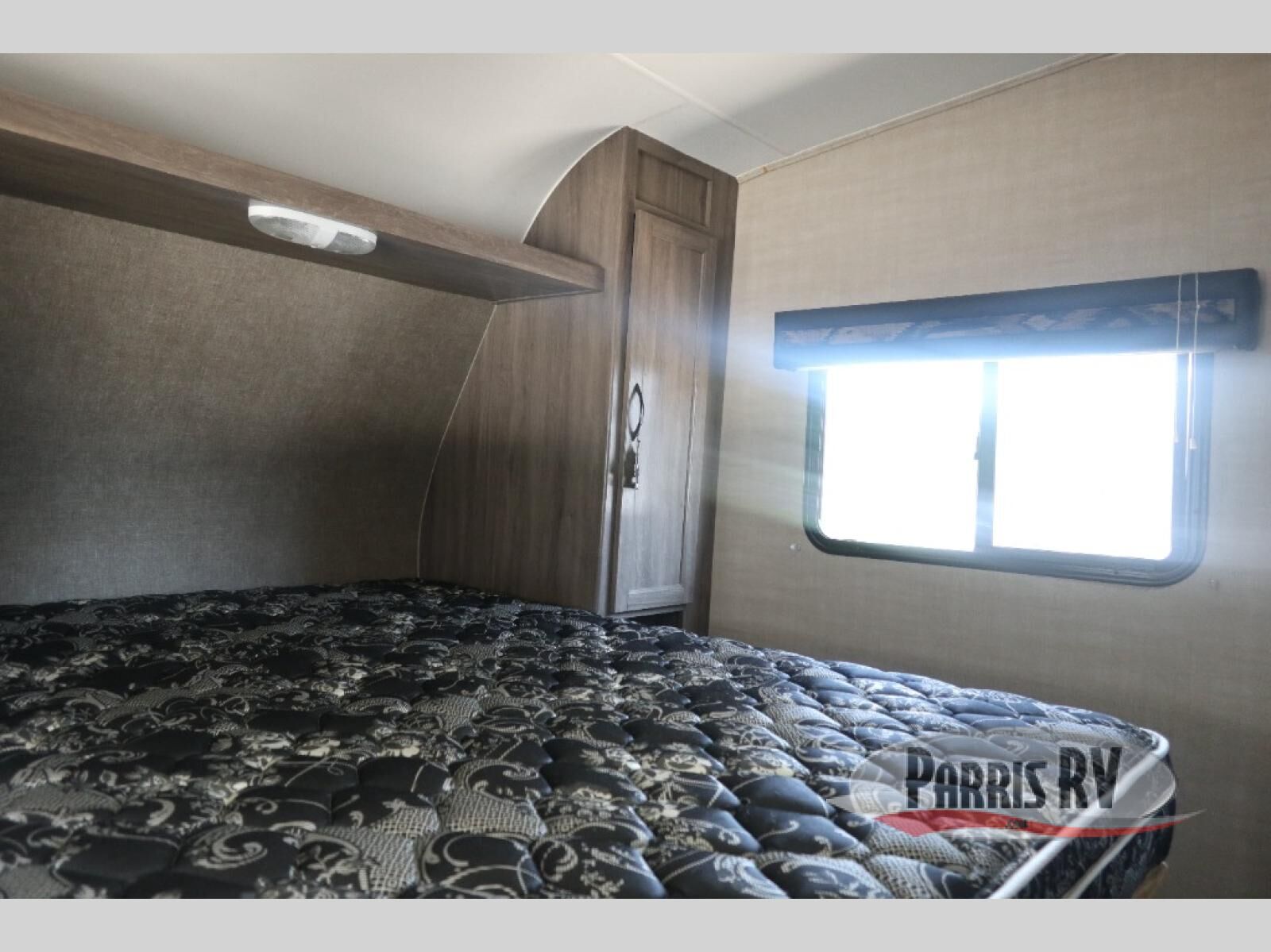 In the front of this unit, you will see a spacious room with a queen sized bed, two wardrobes, and some over head cabinetry for storing your clothing and other camping items.