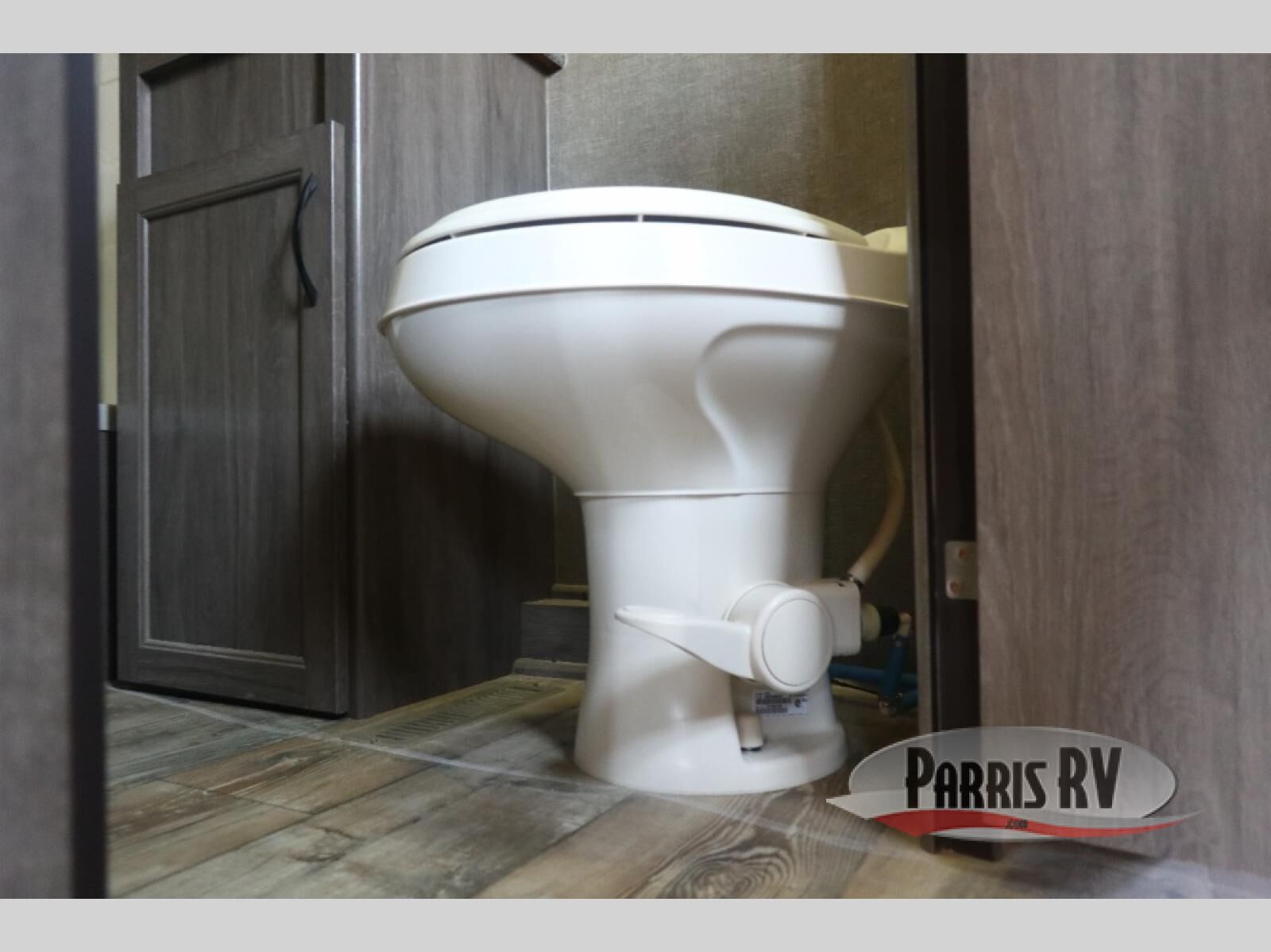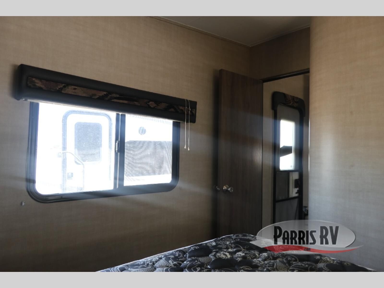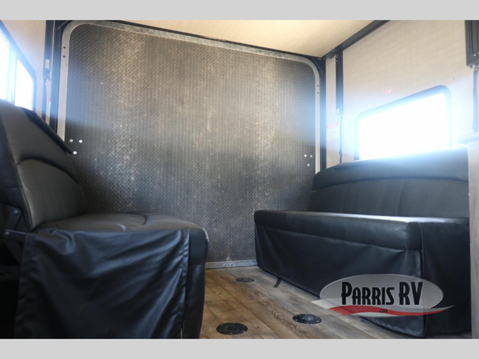 In the front of this unit, you will see a spacious room with a queen sized bed, two wardrobes, and some over head cabinetry for storing your clothing and other camping items.