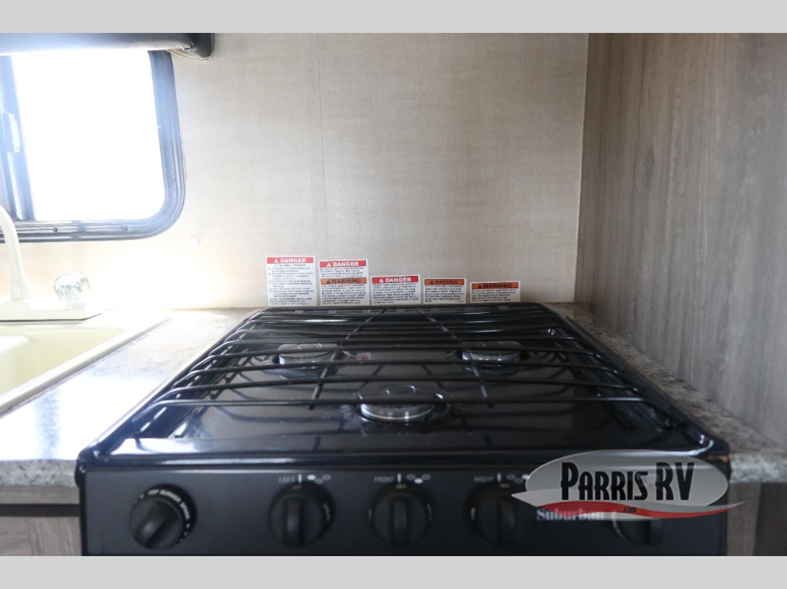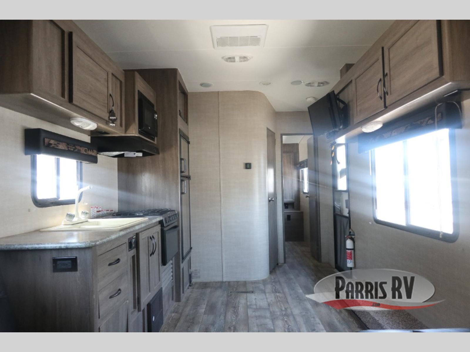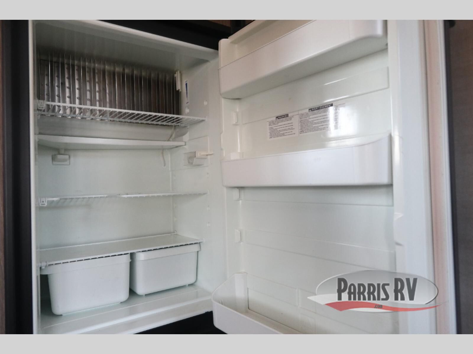 In the main living space, you have a kitchen with a large double door refrigerator, a three burner range with an over head microwave, and a double sink. Located opposite the kitchen is some overhead cabinetry on the curbside wall for storing your clean dishes.
