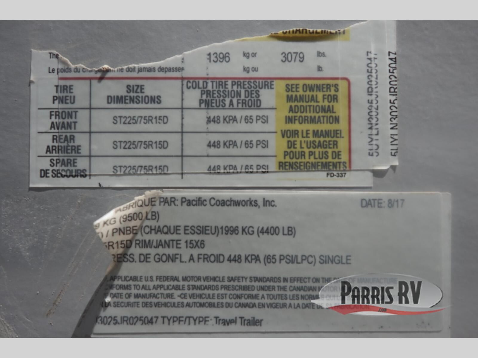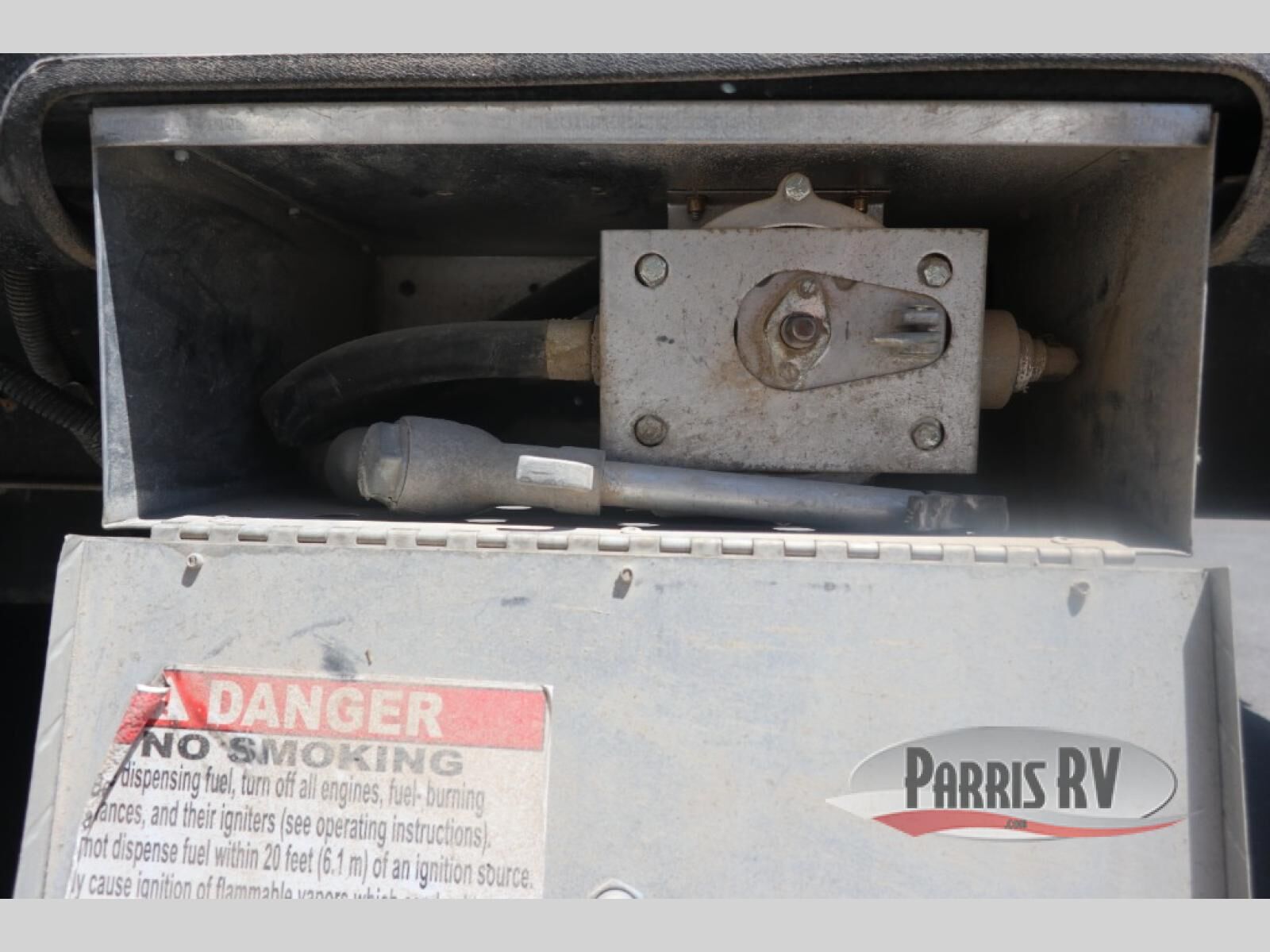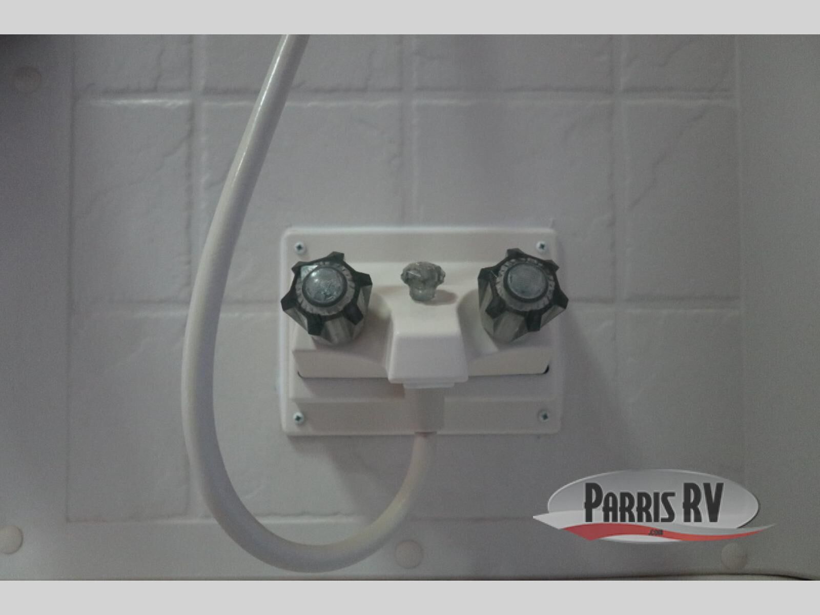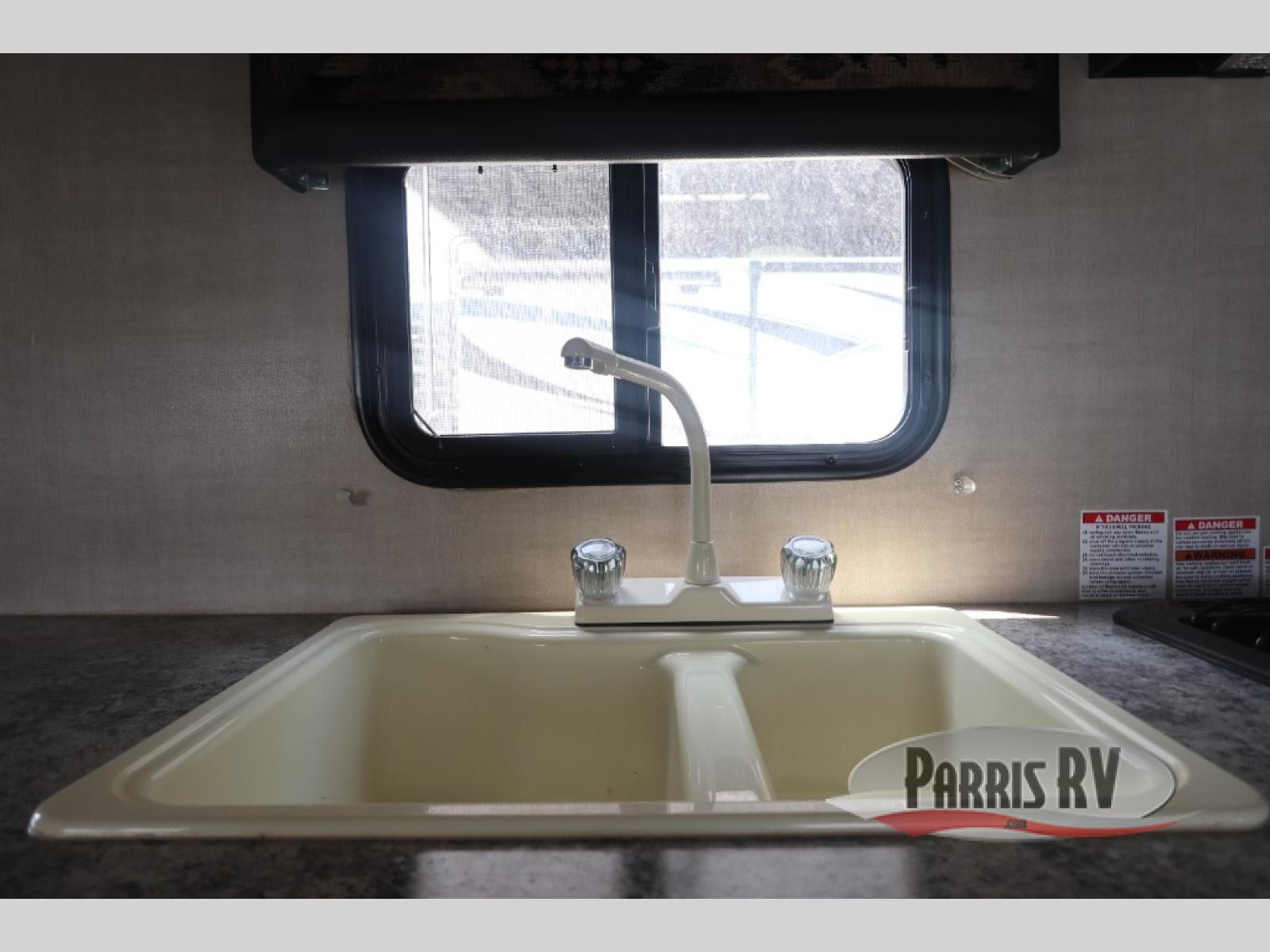 In the main living space, you have a kitchen with a large double door refrigerator, a three burner range with an over head microwave, and a double sink. Located opposite the kitchen is some overhead cabinetry on the curbside wall for storing your clean dishes.