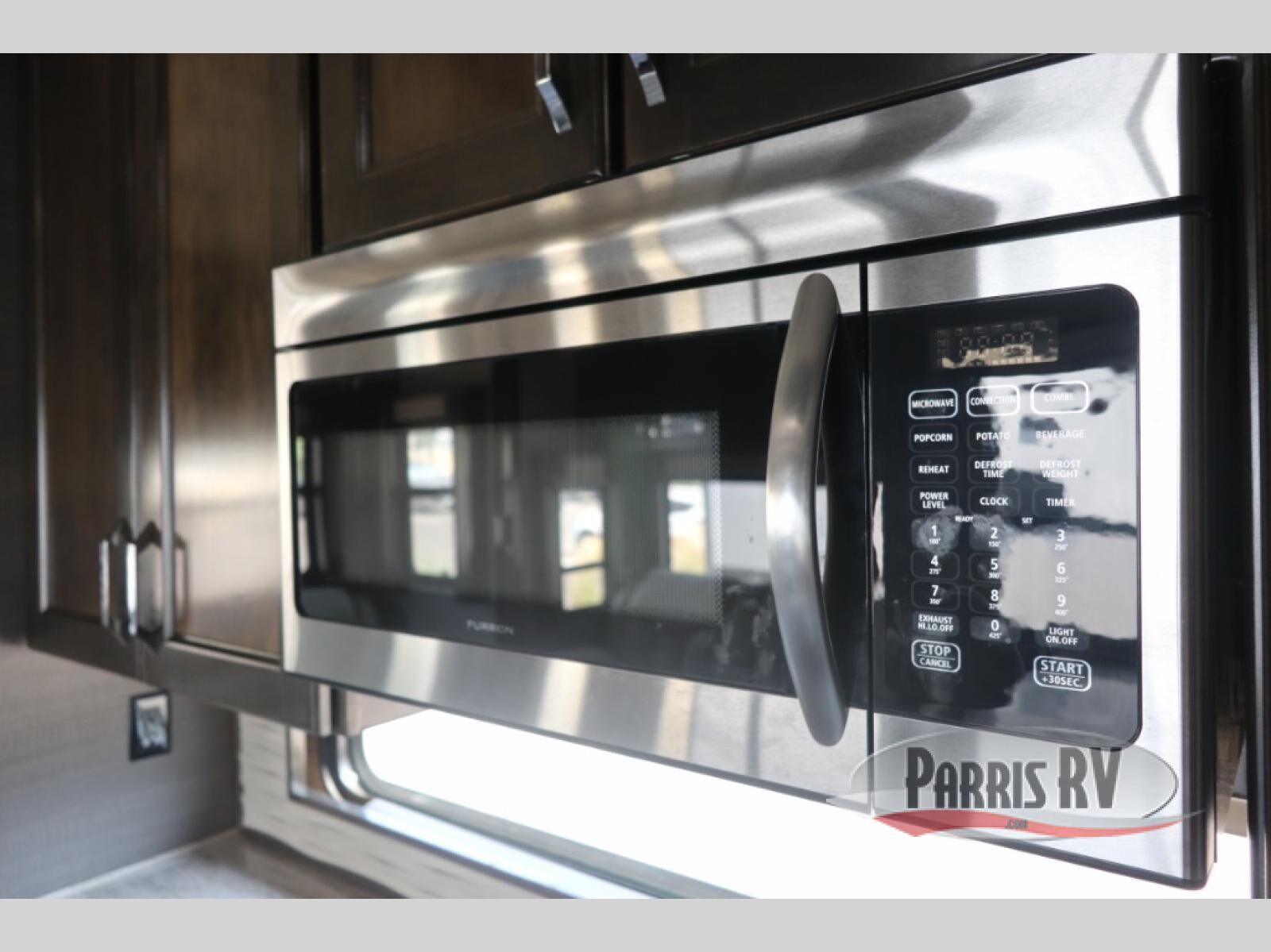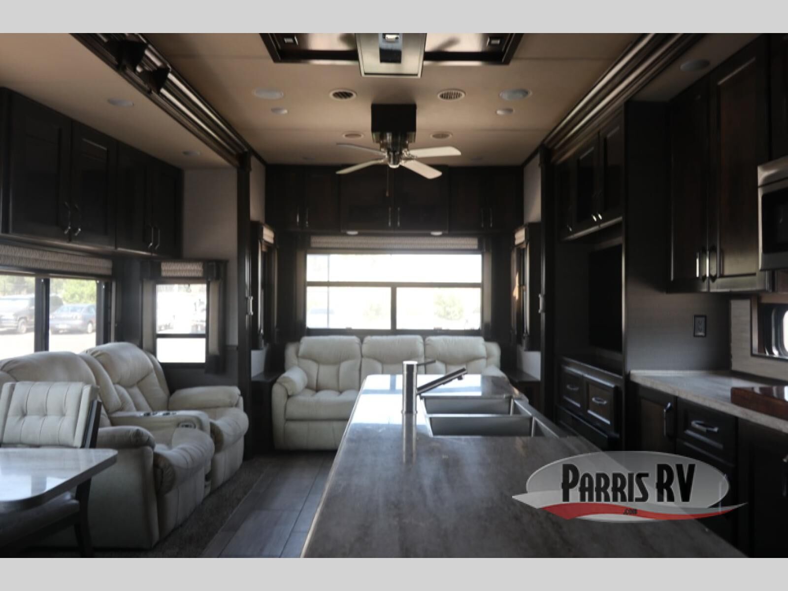 This Beacon fifth wheel feels spacious on the interior because of opposing slides in the main living area, and there is even a third slide in the front master suite so that you can enjoy the time you spend getting ready each morning. You'll definitely be drawn to the large island with lighting overhead, and the full hutch will be a great place to store precious kitchen items.