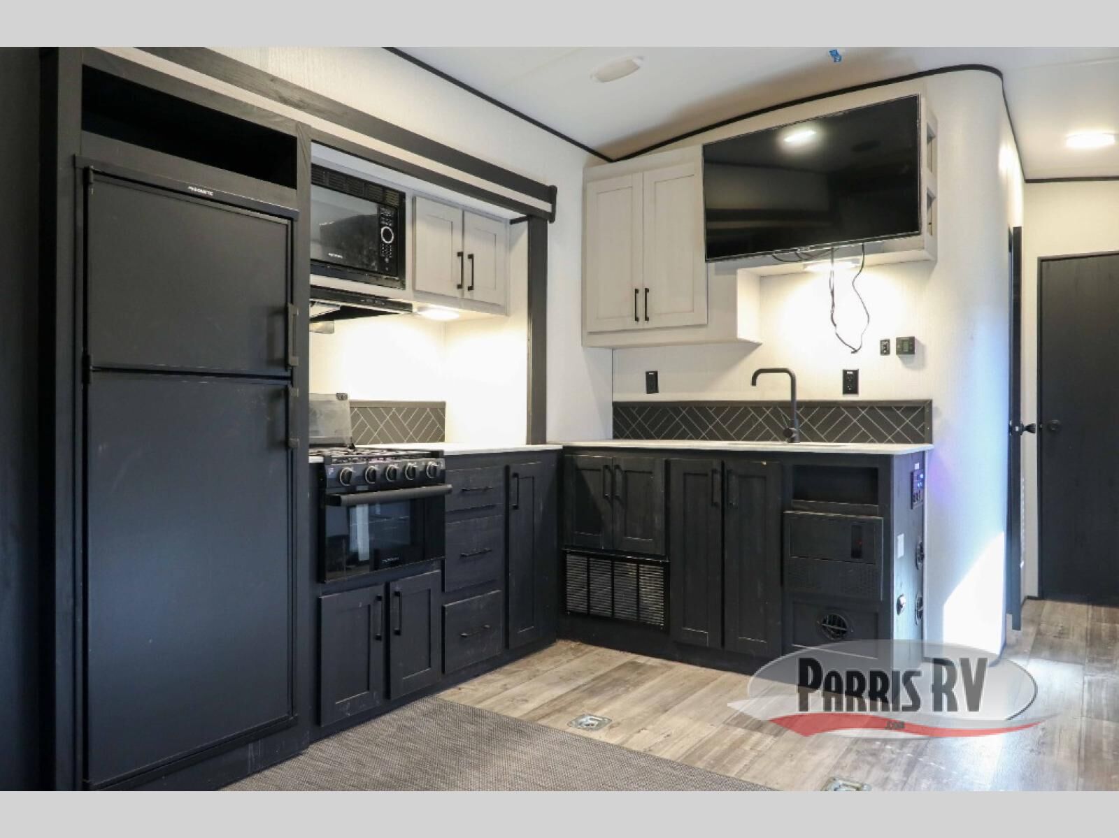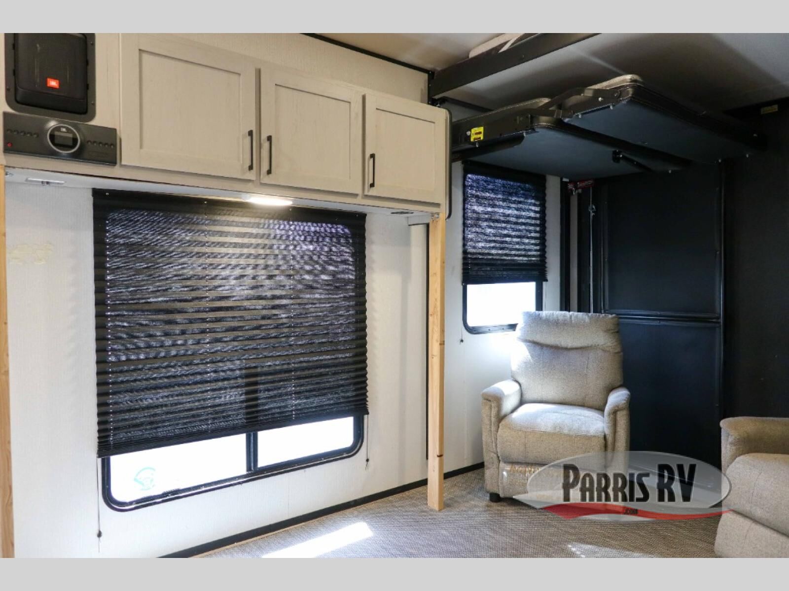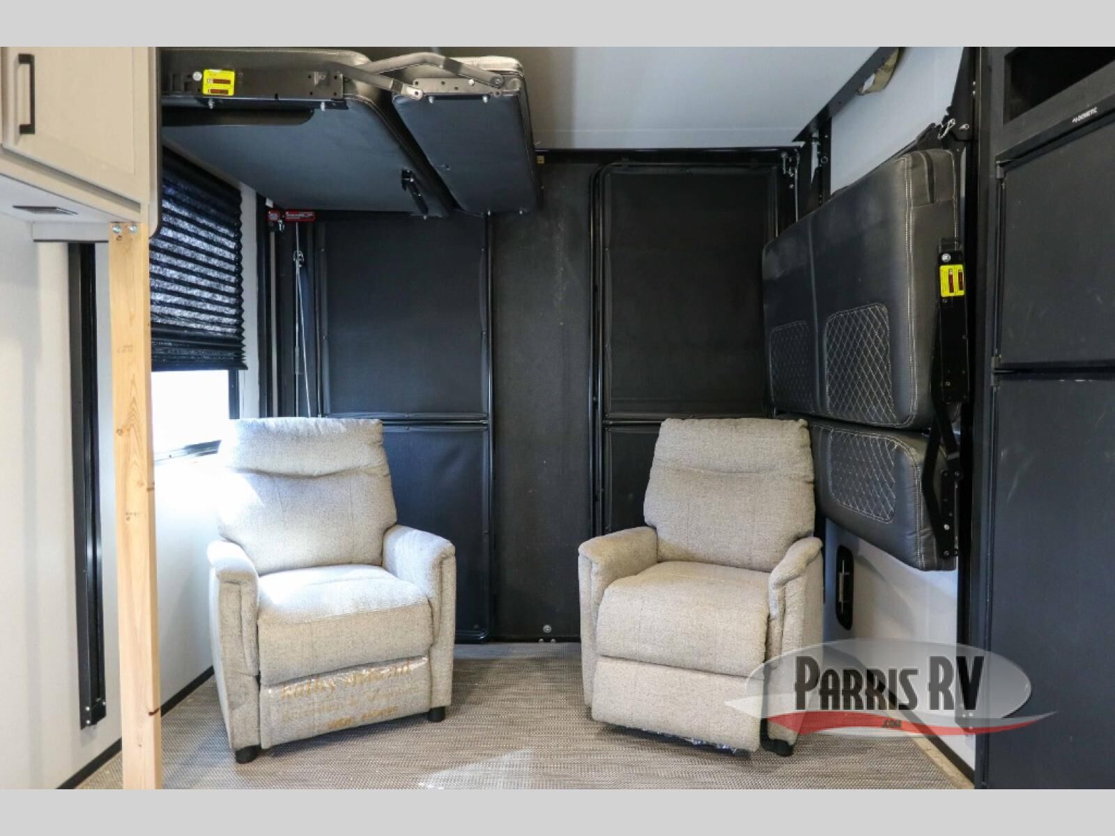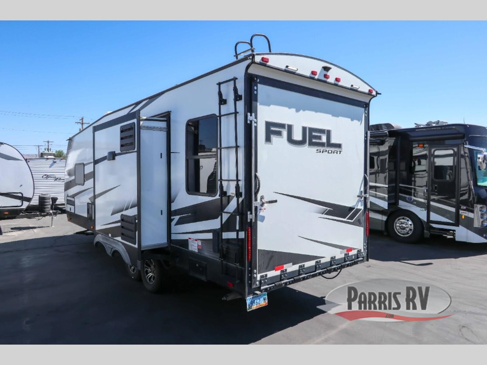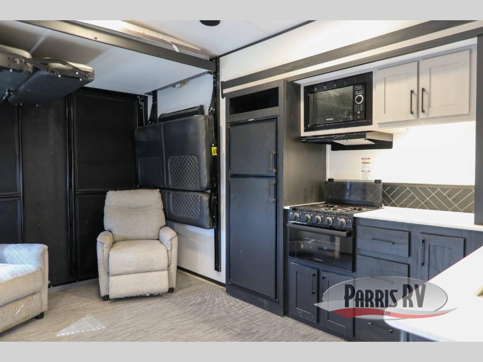 This Fuel toy hauler has all of the comfort and convenience you need! There is a front master suite with a king-size bed and a private entrance into the dual-entry bathroom. The kitchen has an 8-cubic foot refrigerator for storing any items that need to be chilled, and the three-burner range is an excellent tool for turning those items into something delicious to eat. You can sit back and relax in one of the lounge chairs, or you can sit at the opposing sofas with dinette below the power queen bunk.