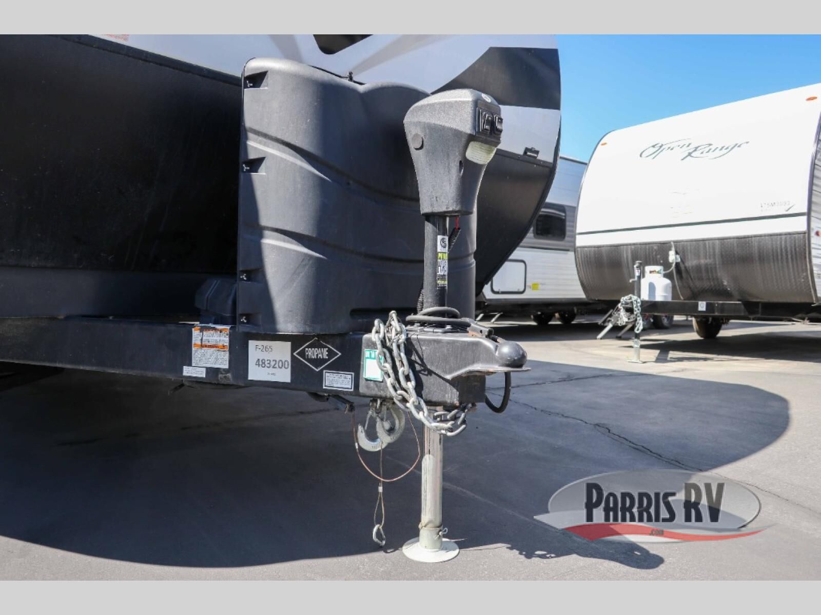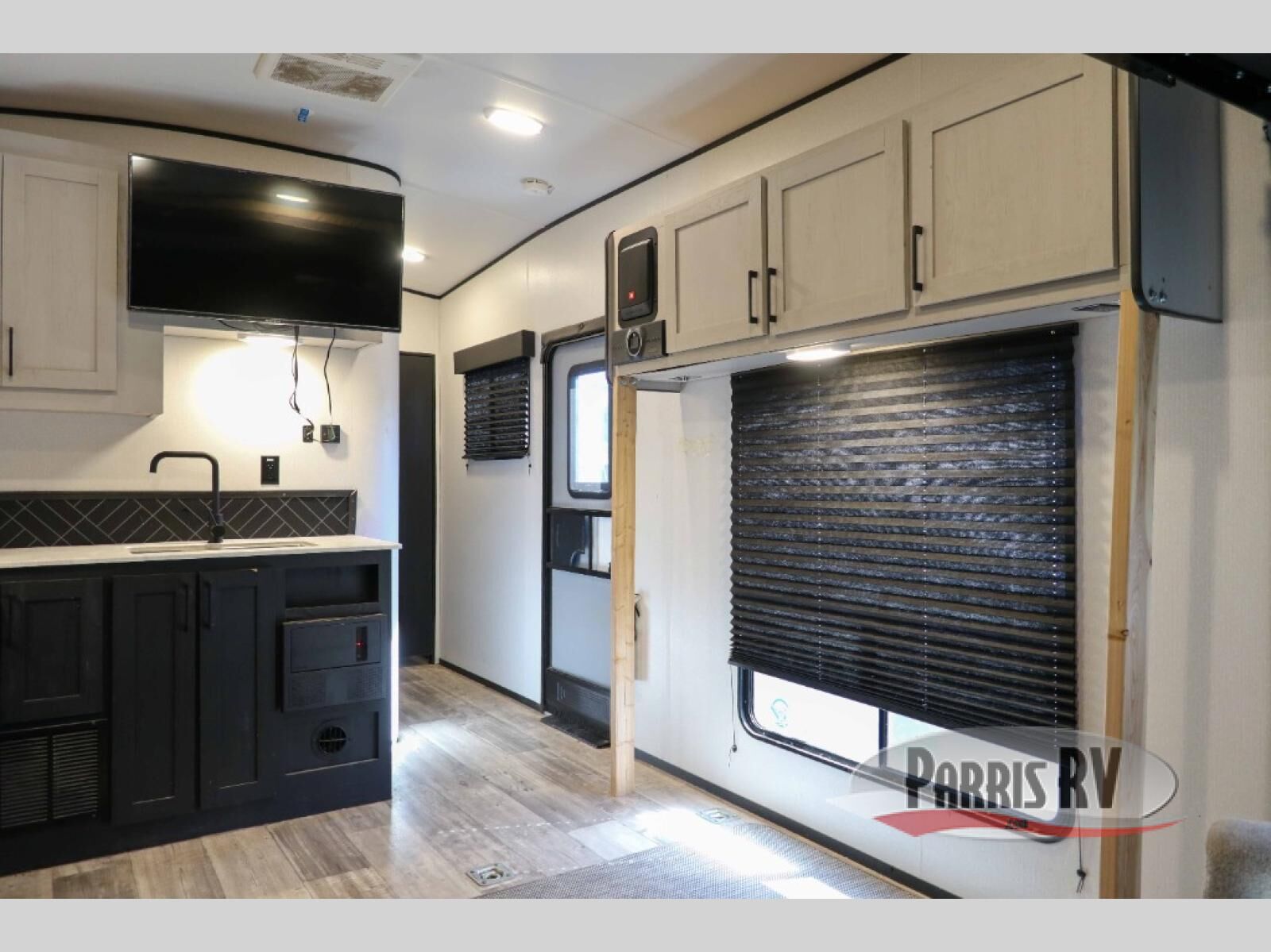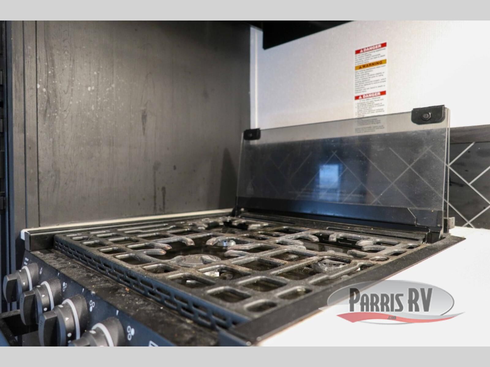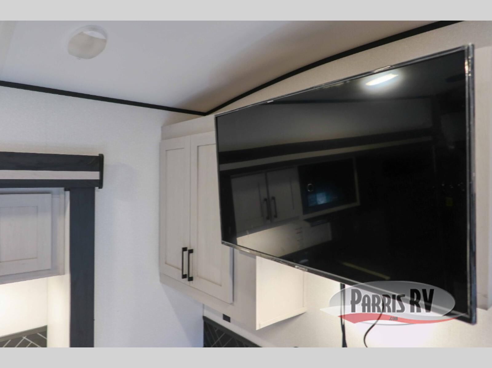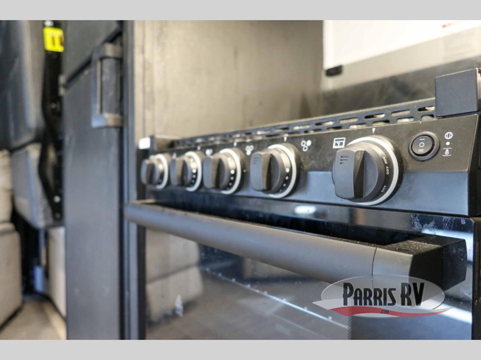 This Fuel toy hauler has all of the comfort and convenience you need! There is a front master suite with a king-size bed and a private entrance into the dual-entry bathroom. The kitchen has an 8-cubic foot refrigerator for storing any items that need to be chilled, and the three-burner range is an excellent tool for turning those items into something delicious to eat. You can sit back and relax in one of the lounge chairs, or you can sit at the opposing sofas with dinette below the power queen bunk.