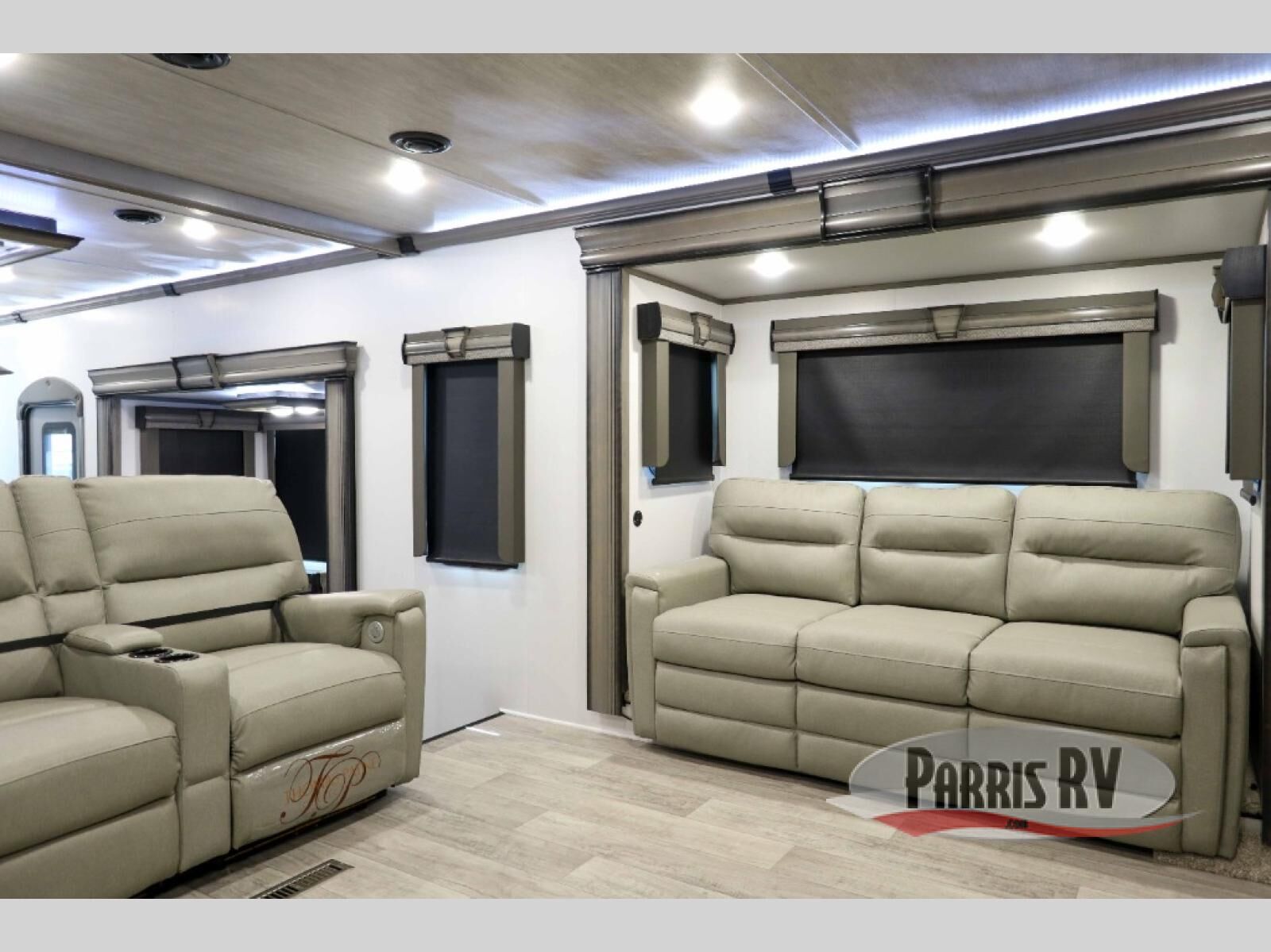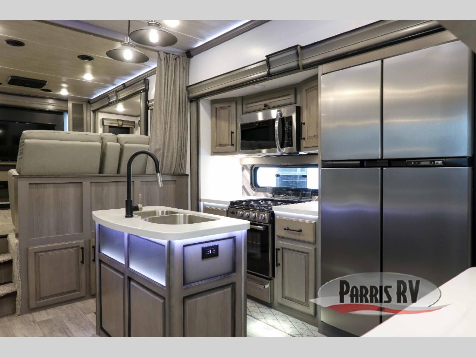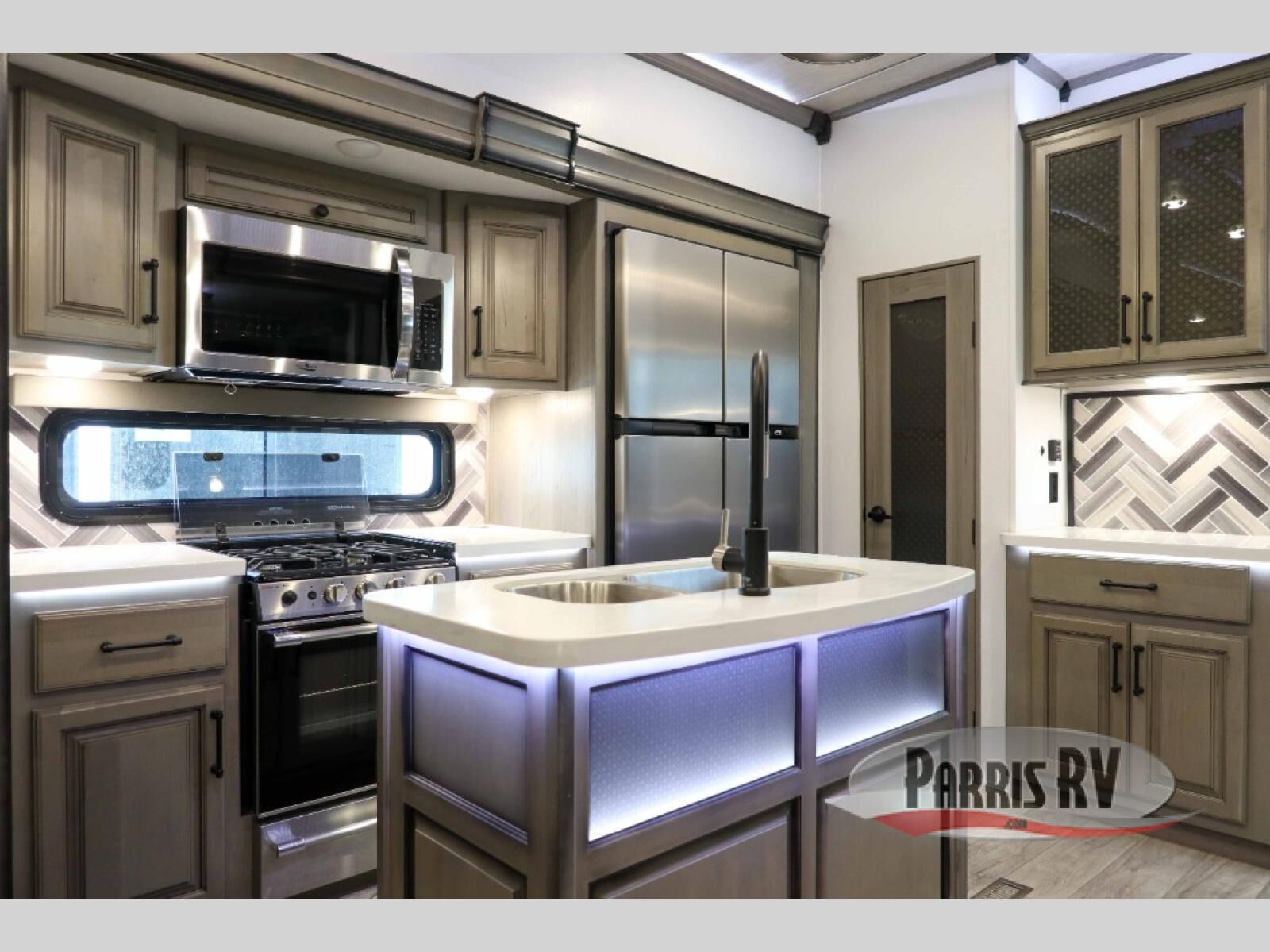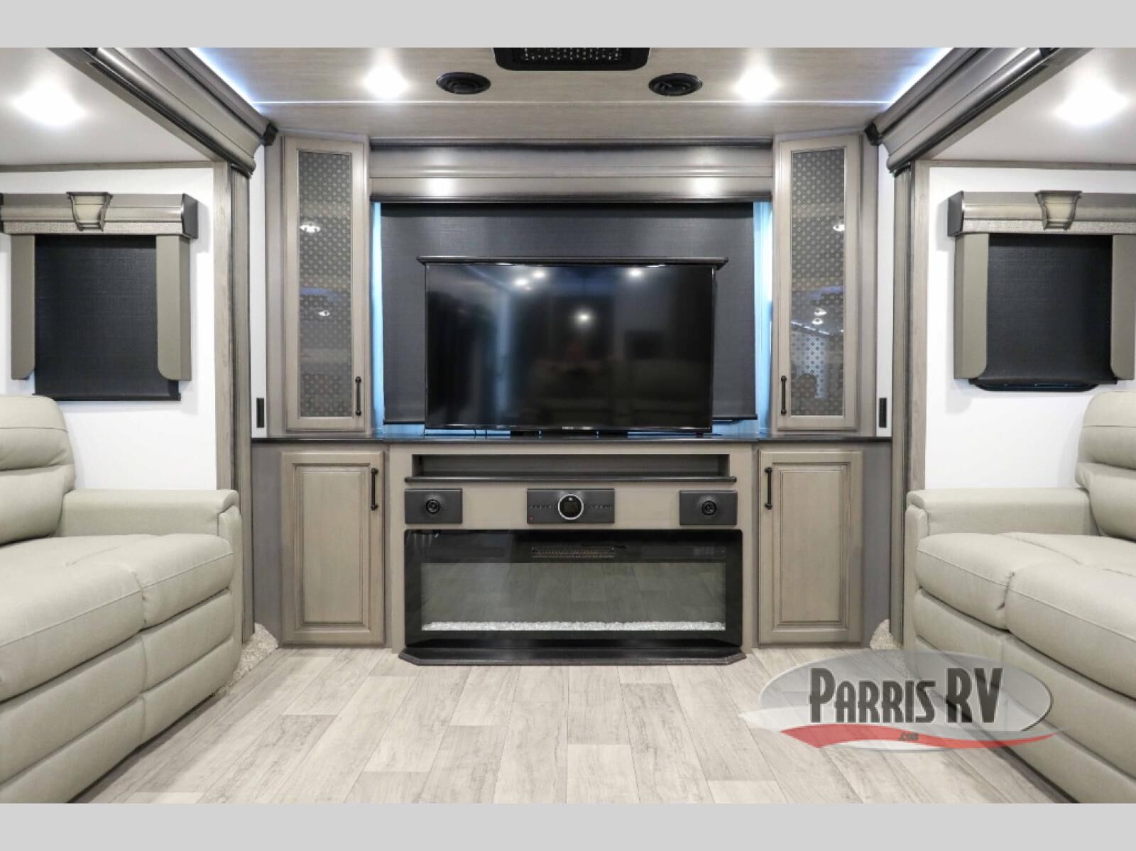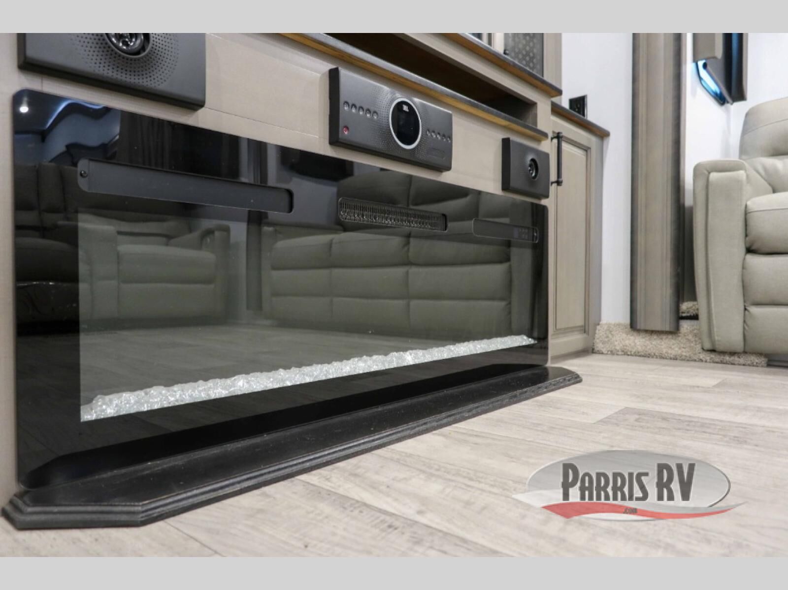 The coffee lover will enjoy camping in this fifth wheel with the coffee station in the kitchen! The kitchen also has an island, a large pantry, a glass top range with convection microwave and range hood that has a pull-down spice rack, a 18 cu. ft. residential refrigerator, and floor cabinets for your storage needs. Eat your meals and play card games at the free standing legless dinette with 110V outlets to charge your electronics. The separated living area has opposing hide-a-bed sofas and power Thomas Payne theater seating across from a rear entertainment center with a telescoping 50" LCD HDTV and a 5,000 BTU decorative fireplace heater with storage on either side. When you're ready to wind down your nights, head to the front private bedroom to enjoy a good night's rest on the king bed slide with storage underneath and there is a front closet with a clothing hamper and an area to add the optional stackable washer and dryer to have clean clothes for your longer trips!