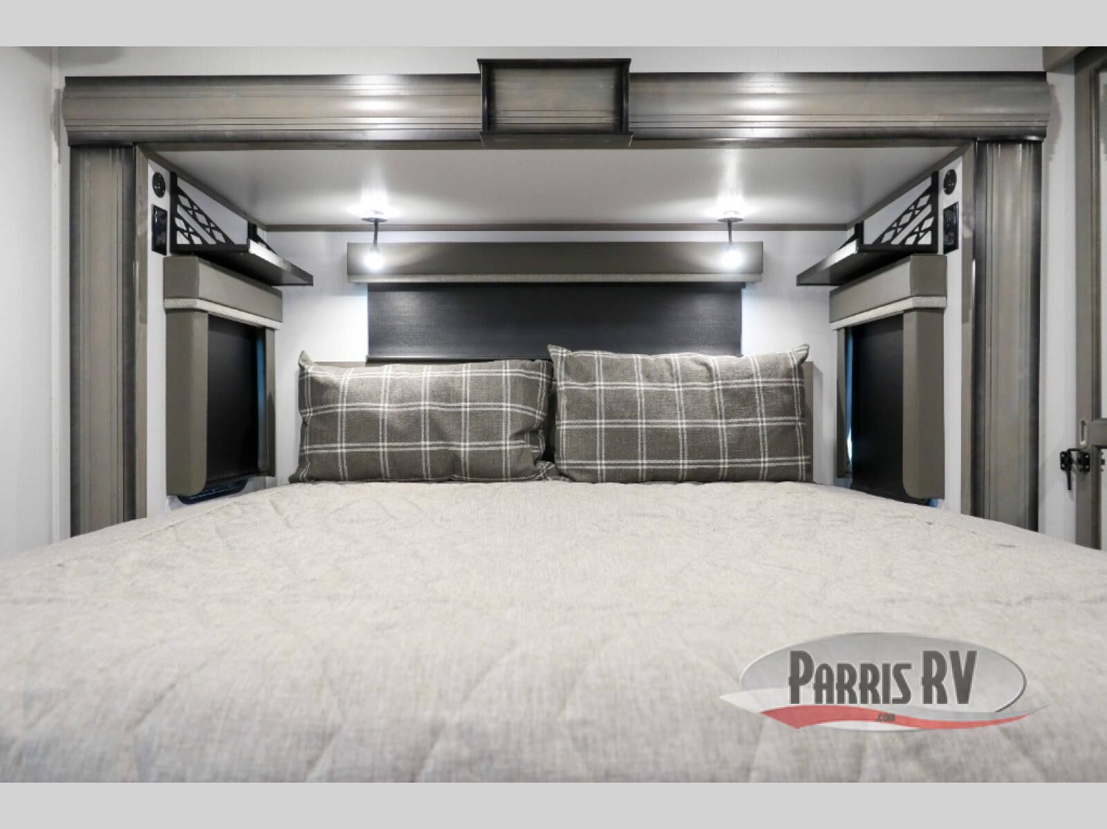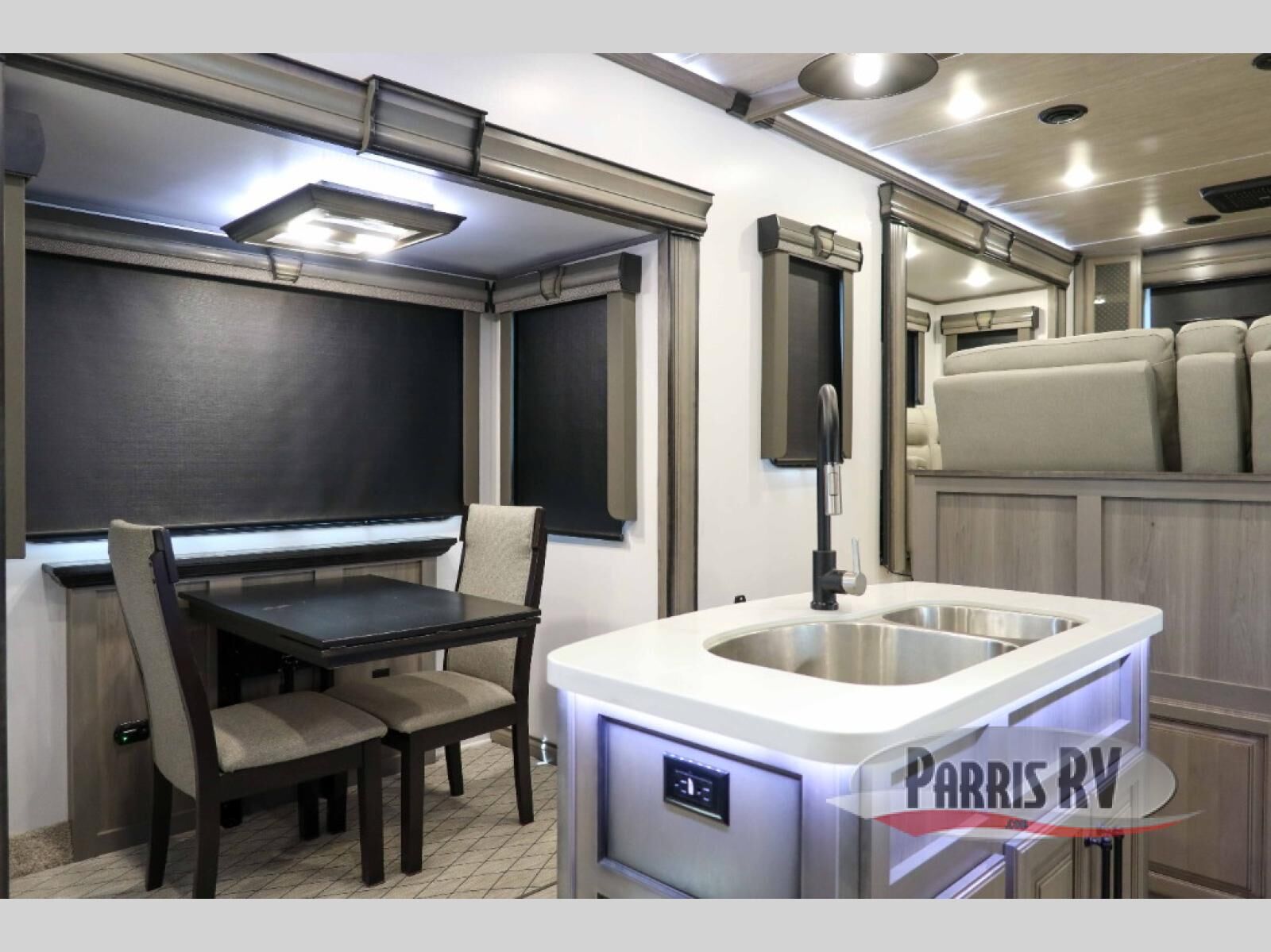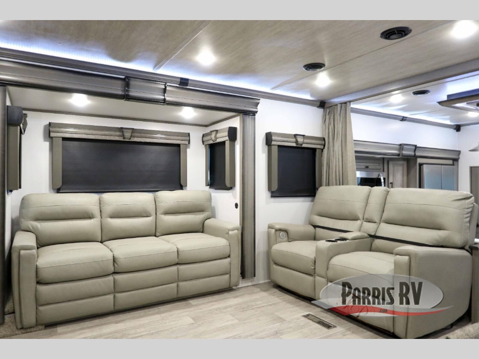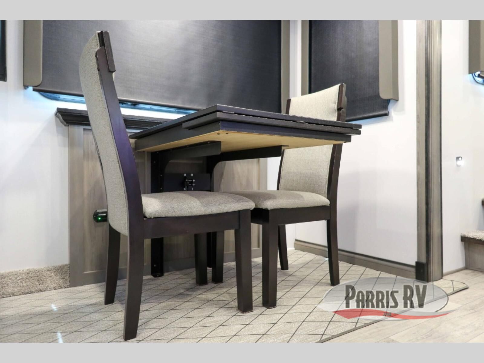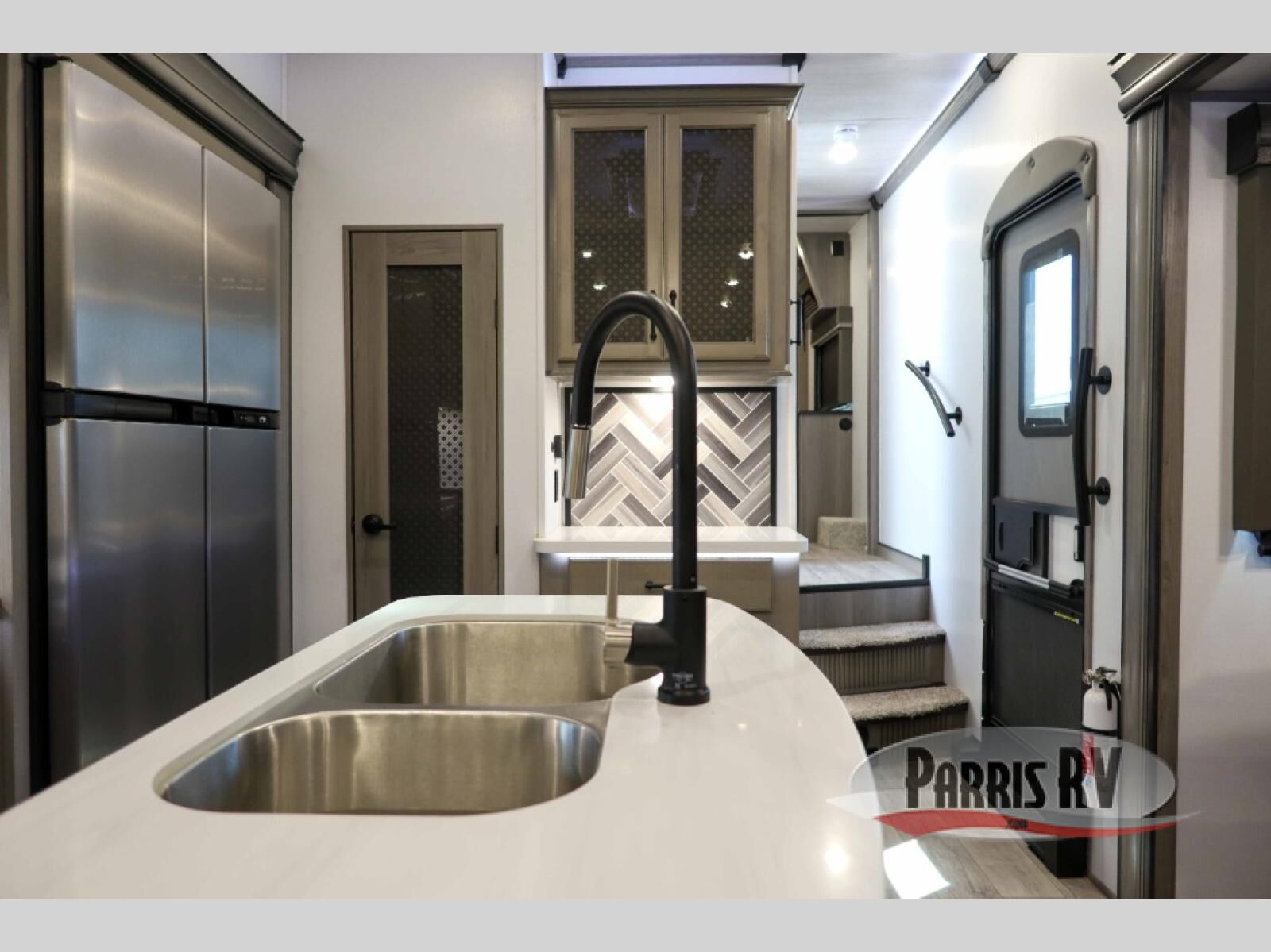 The coffee lover will enjoy camping in this fifth wheel with the coffee station in the kitchen! The kitchen also has an island, a large pantry, a glass top range with convection microwave and range hood that has a pull-down spice rack, a 18 cu. ft. residential refrigerator, and floor cabinets for your storage needs. Eat your meals and play card games at the free standing legless dinette with 110V outlets to charge your electronics. The separated living area has opposing hide-a-bed sofas and power Thomas Payne theater seating across from a rear entertainment center with a telescoping 50" LCD HDTV and a 5,000 BTU decorative fireplace heater with storage on either side. When you're ready to wind down your nights, head to the front private bedroom to enjoy a good night's rest on the king bed slide with storage underneath and there is a front closet with a clothing hamper and an area to add the optional stackable washer and dryer to have clean clothes for your longer trips!