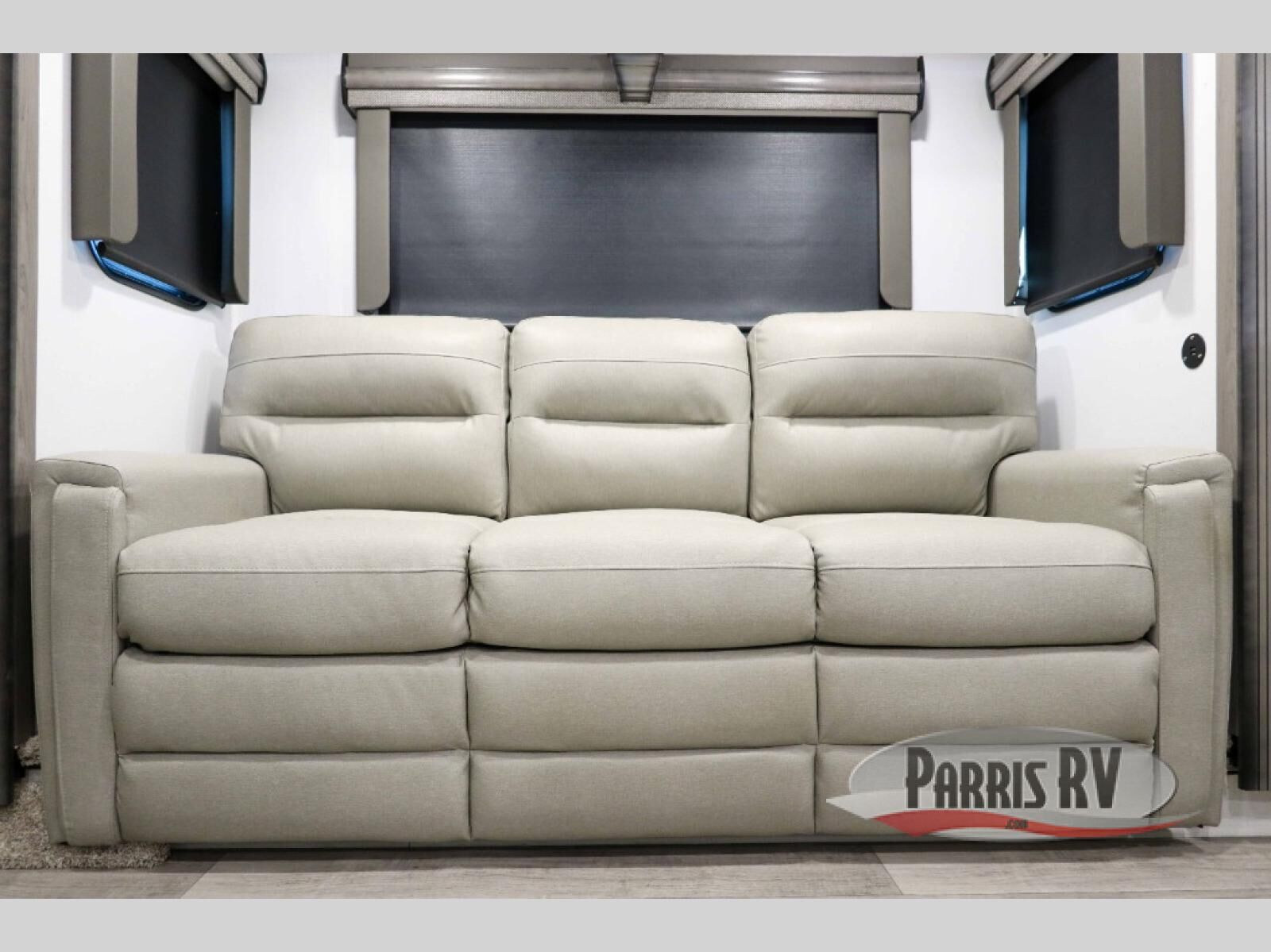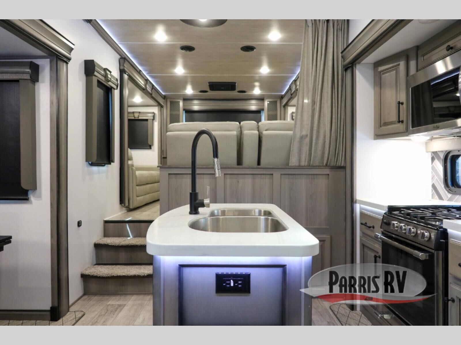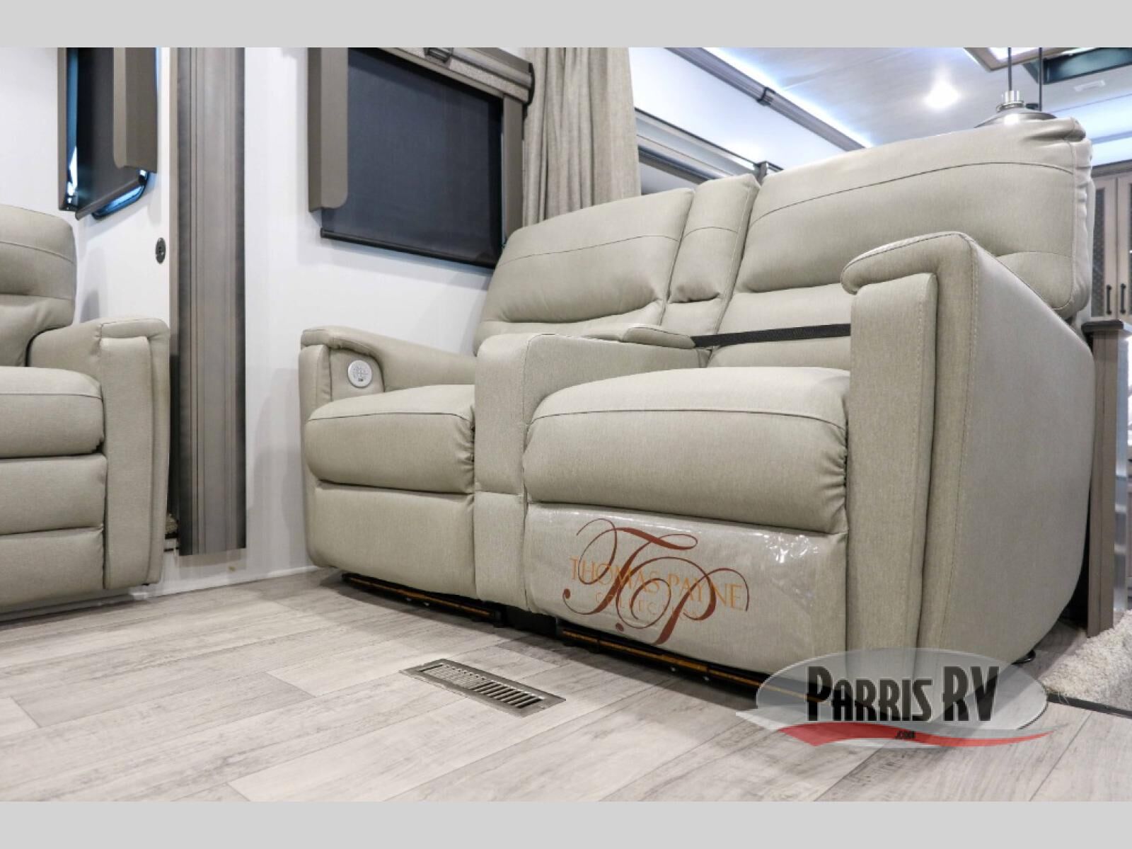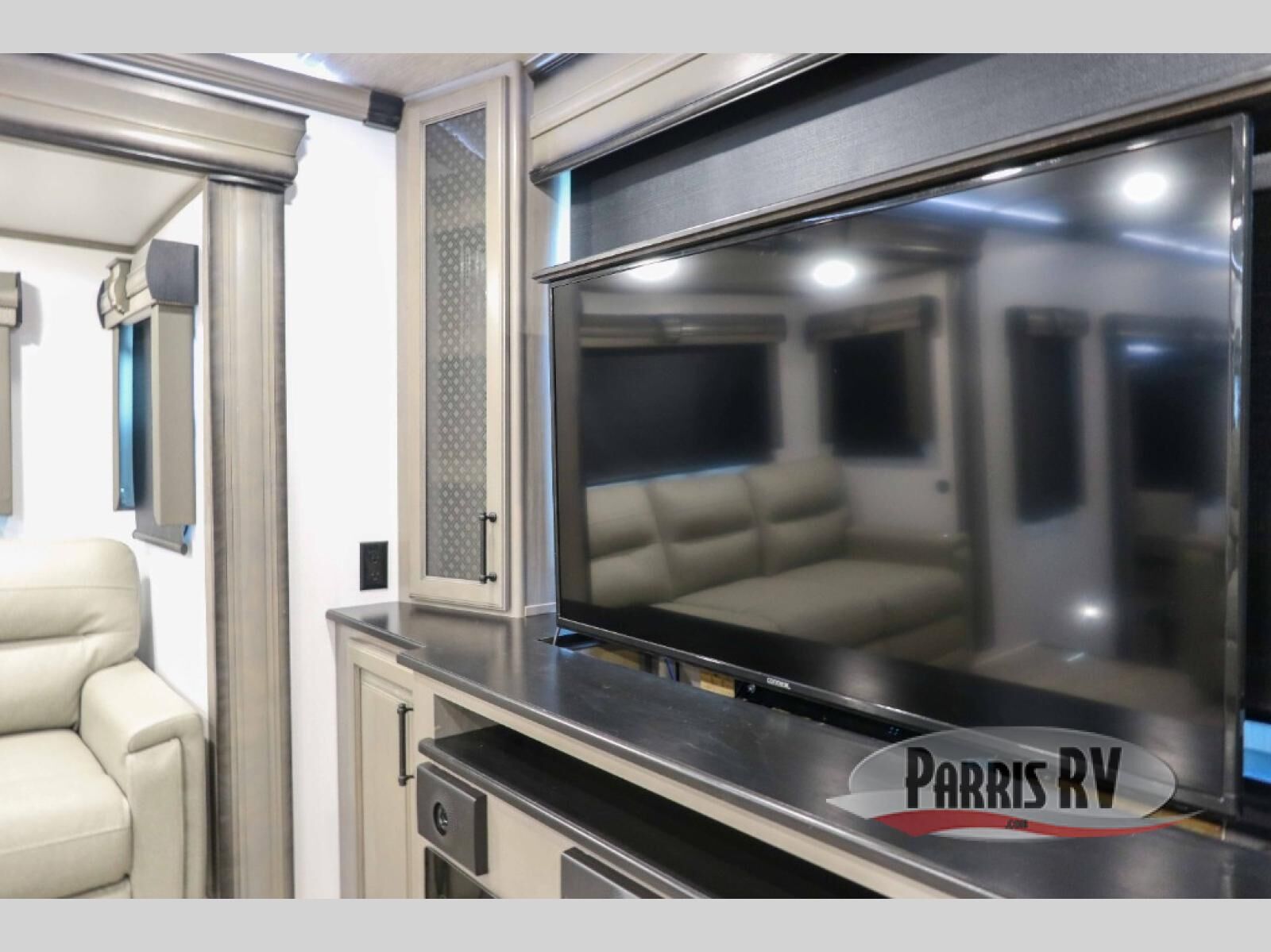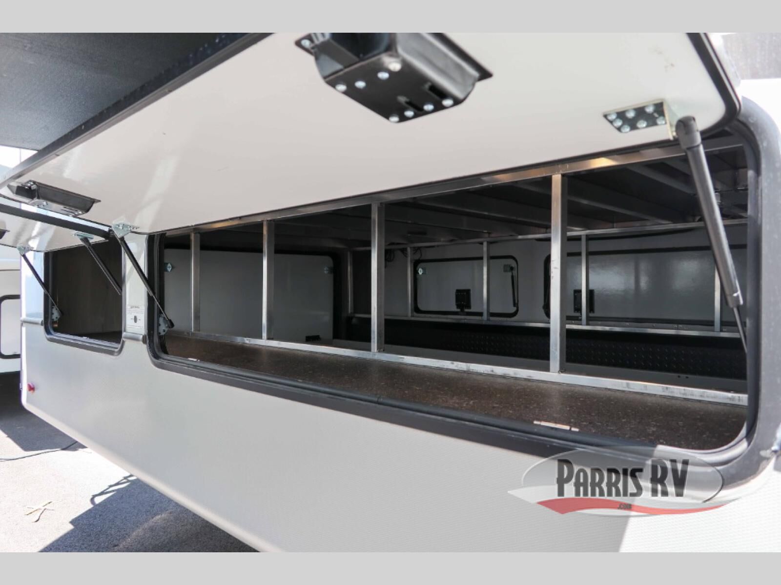 The coffee lover will enjoy camping in this fifth wheel with the coffee station in the kitchen! The kitchen also has an island, a large pantry, a glass top range with convection microwave and range hood that has a pull-down spice rack, a 18 cu. ft. residential refrigerator, and floor cabinets for your storage needs. Eat your meals and play card games at the free standing legless dinette with 110V outlets to charge your electronics. The separated living area has opposing hide-a-bed sofas and power Thomas Payne theater seating across from a rear entertainment center with a telescoping 50" LCD HDTV and a 5,000 BTU decorative fireplace heater with storage on either side. When you're ready to wind down your nights, head to the front private bedroom to enjoy a good night's rest on the king bed slide with storage underneath and there is a front closet with a clothing hamper and an area to add the optional stackable washer and dryer to have clean clothes for your longer trips!