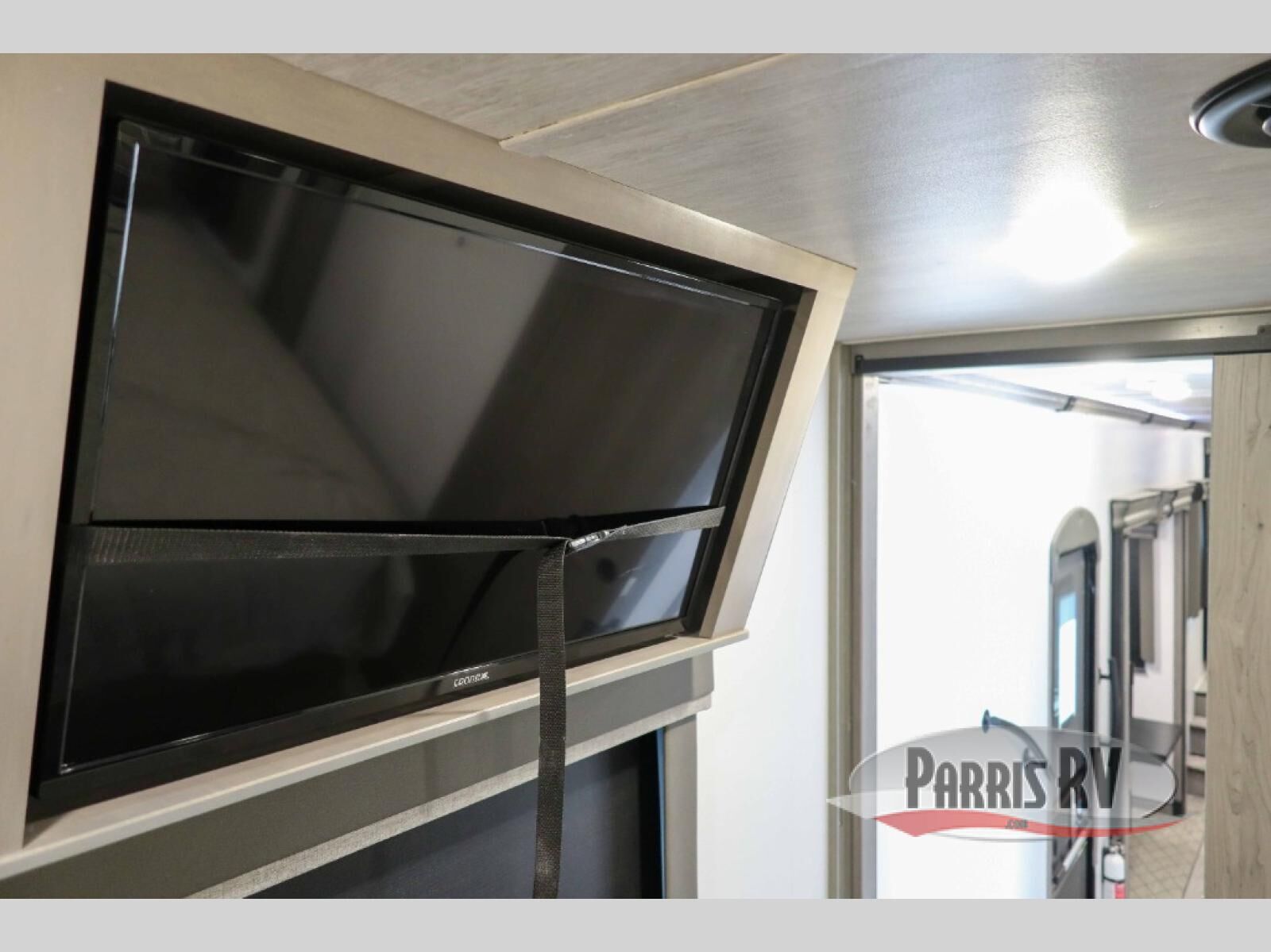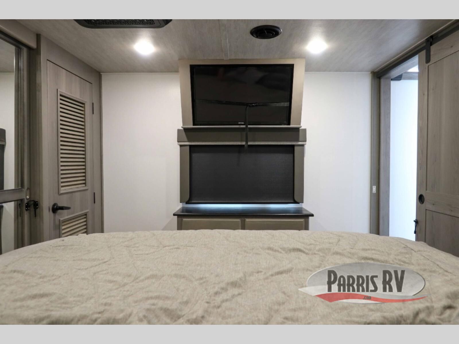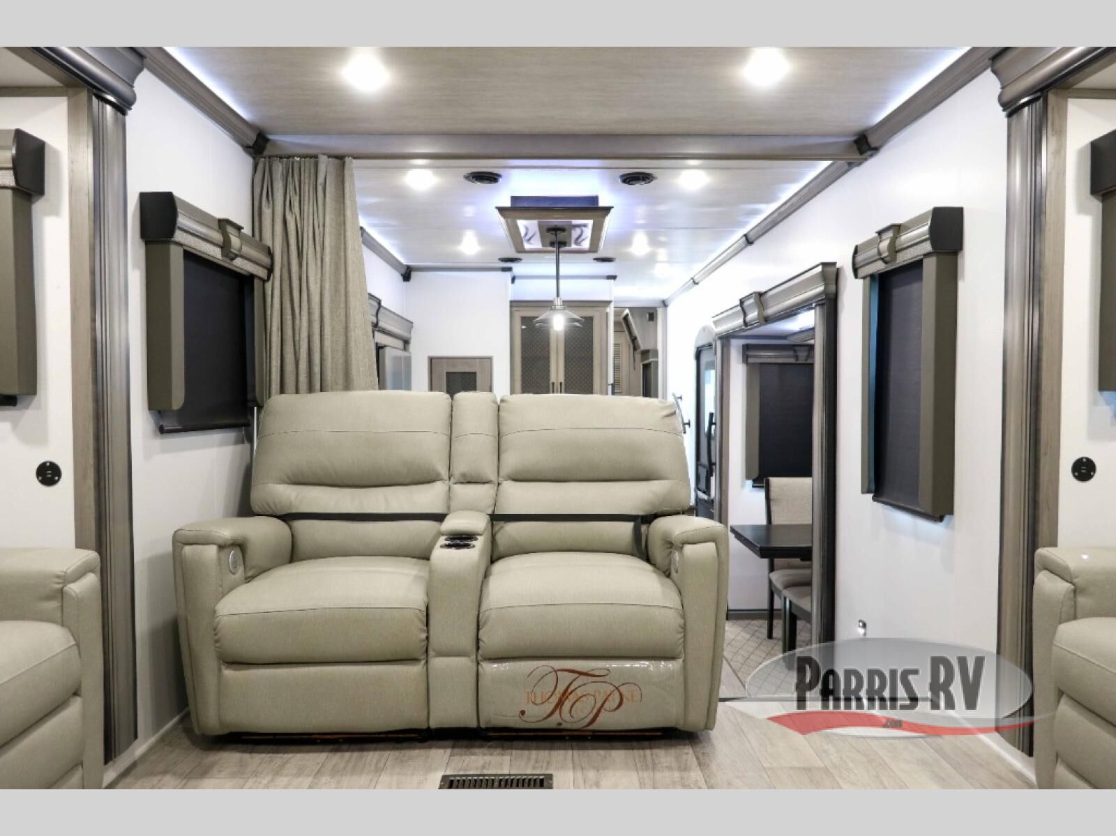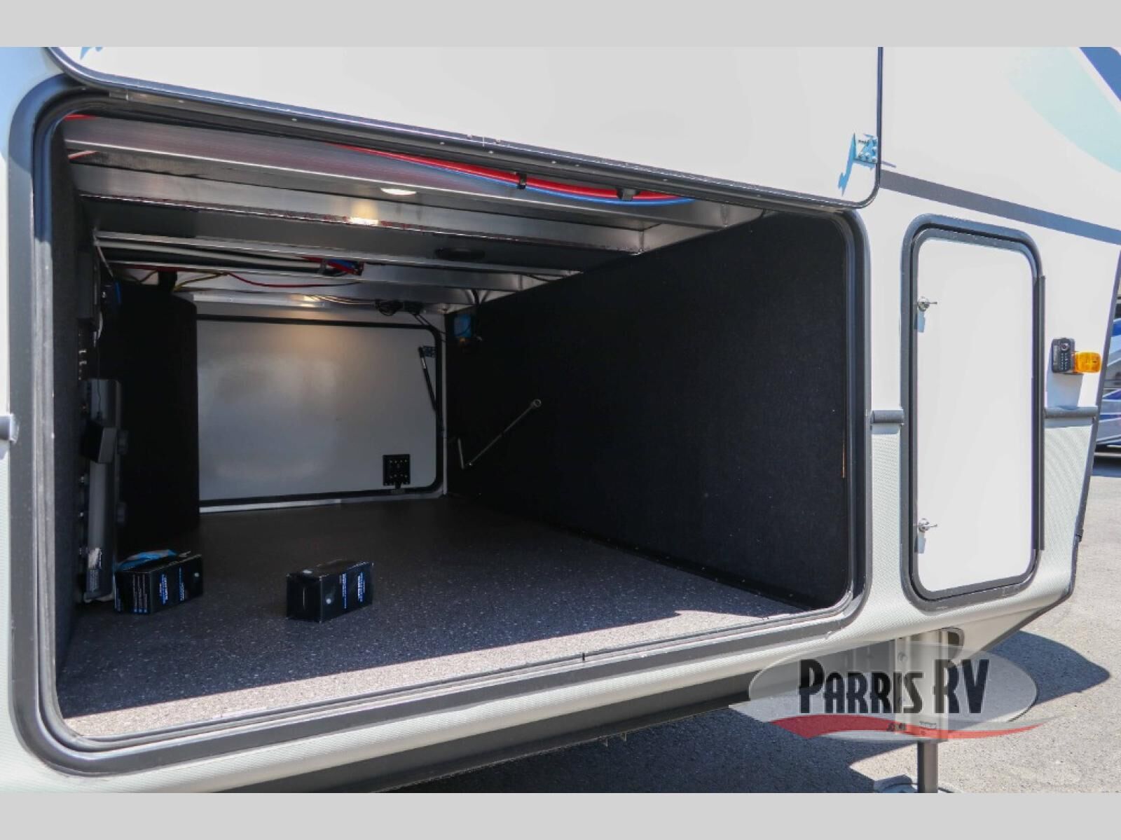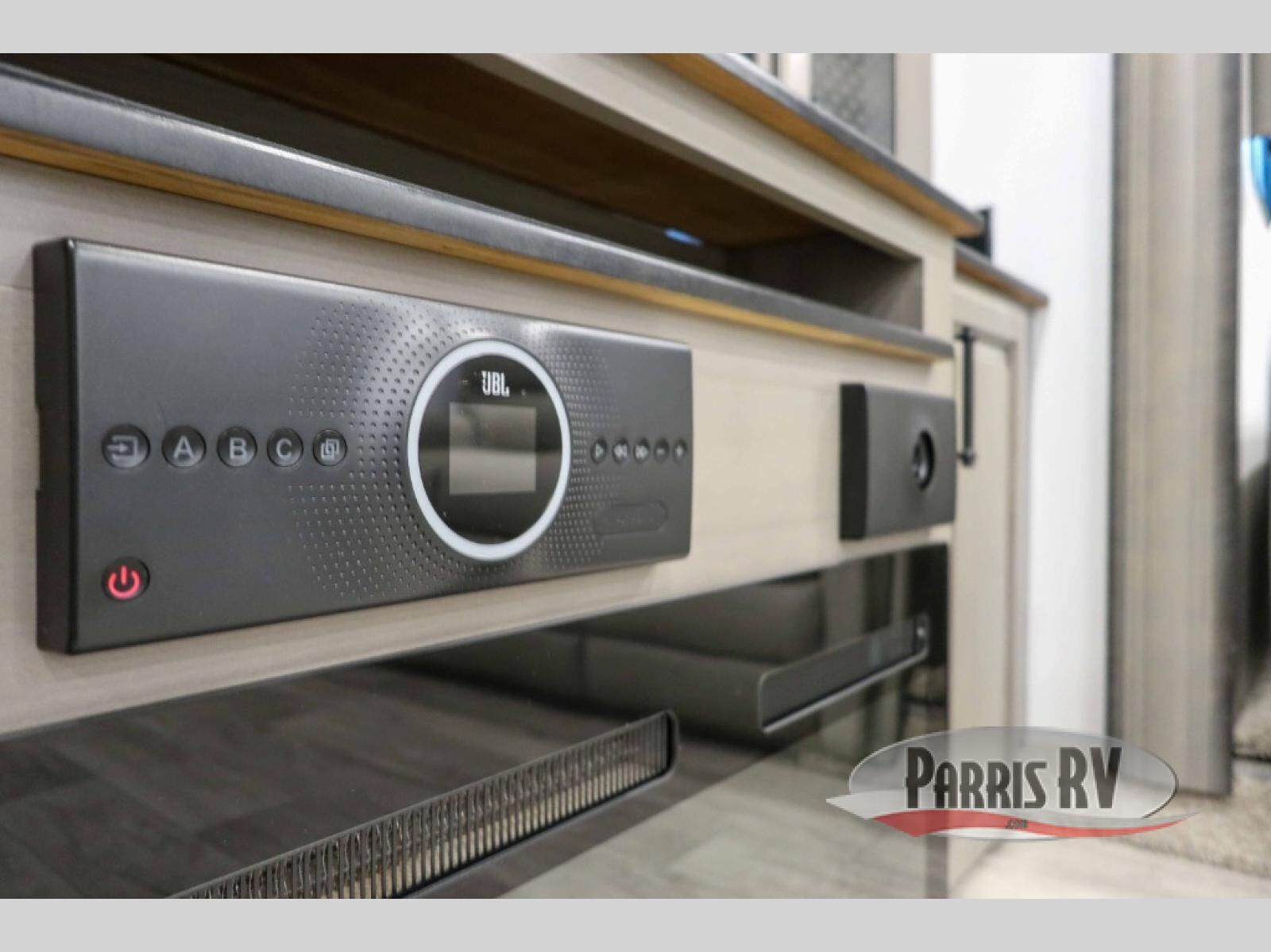 The coffee lover will enjoy camping in this fifth wheel with the coffee station in the kitchen! The kitchen also has an island, a large pantry, a glass top range with convection microwave and range hood that has a pull-down spice rack, a 18 cu. ft. residential refrigerator, and floor cabinets for your storage needs. Eat your meals and play card games at the free standing legless dinette with 110V outlets to charge your electronics. The separated living area has opposing hide-a-bed sofas and power Thomas Payne theater seating across from a rear entertainment center with a telescoping 50" LCD HDTV and a 5,000 BTU decorative fireplace heater with storage on either side. When you're ready to wind down your nights, head to the front private bedroom to enjoy a good night's rest on the king bed slide with storage underneath and there is a front closet with a clothing hamper and an area to add the optional stackable washer and dryer to have clean clothes for your longer trips!