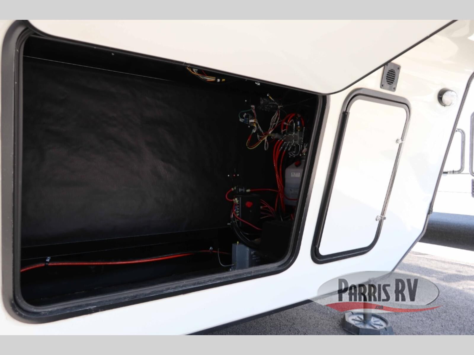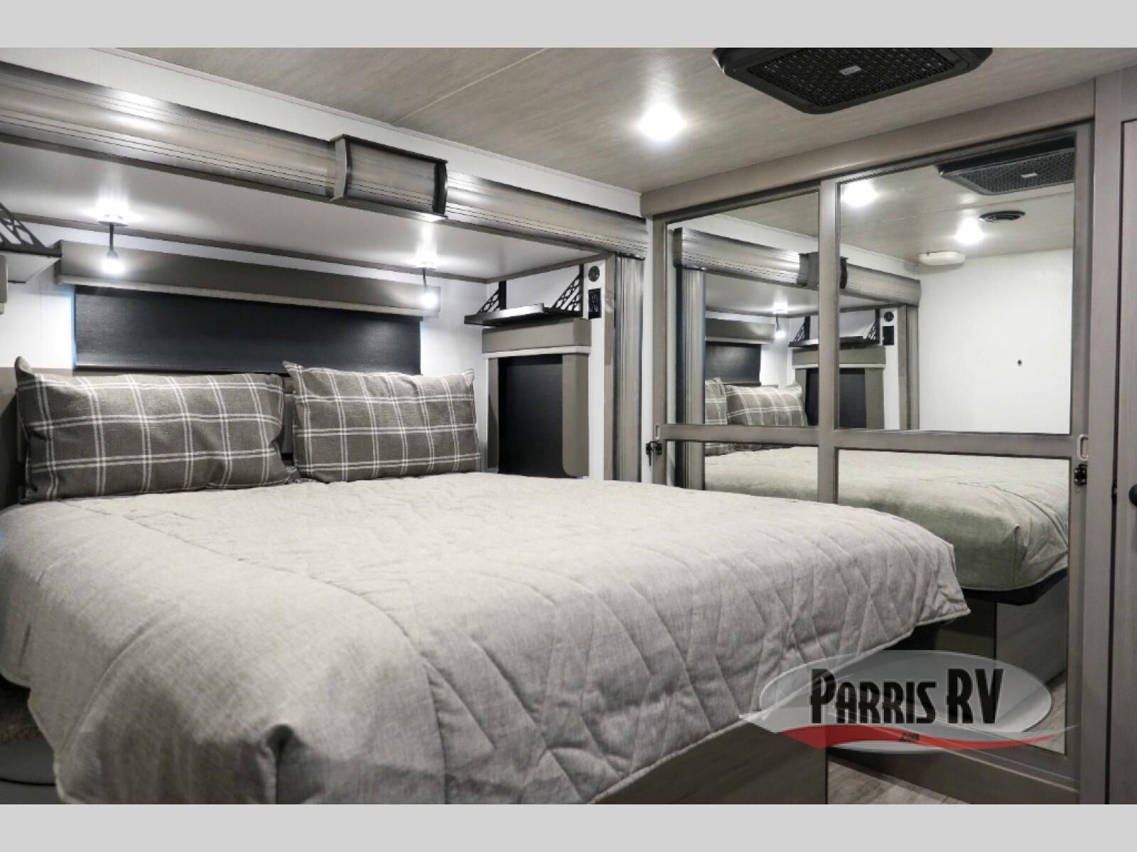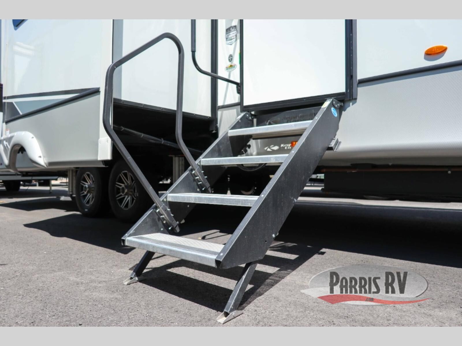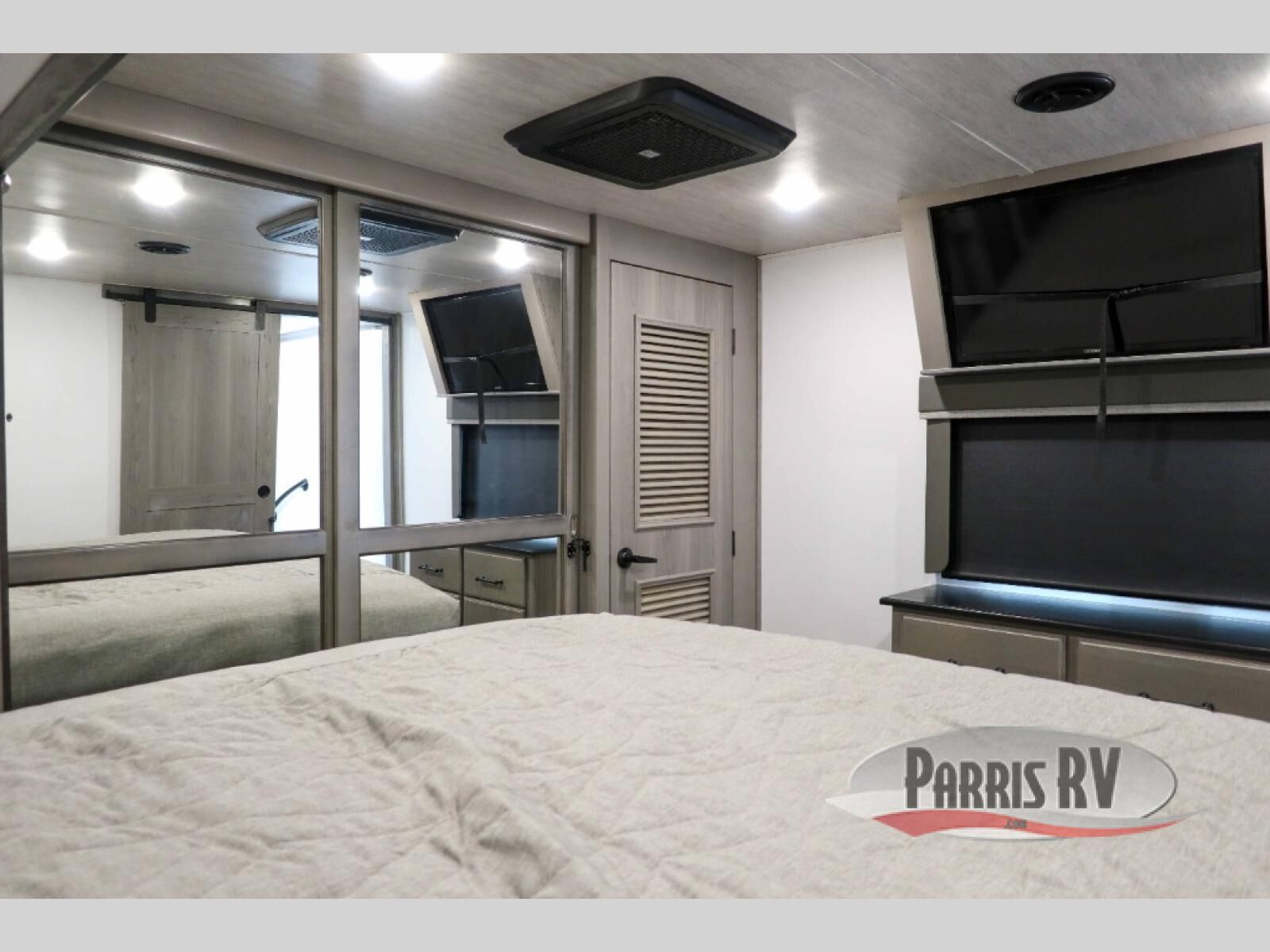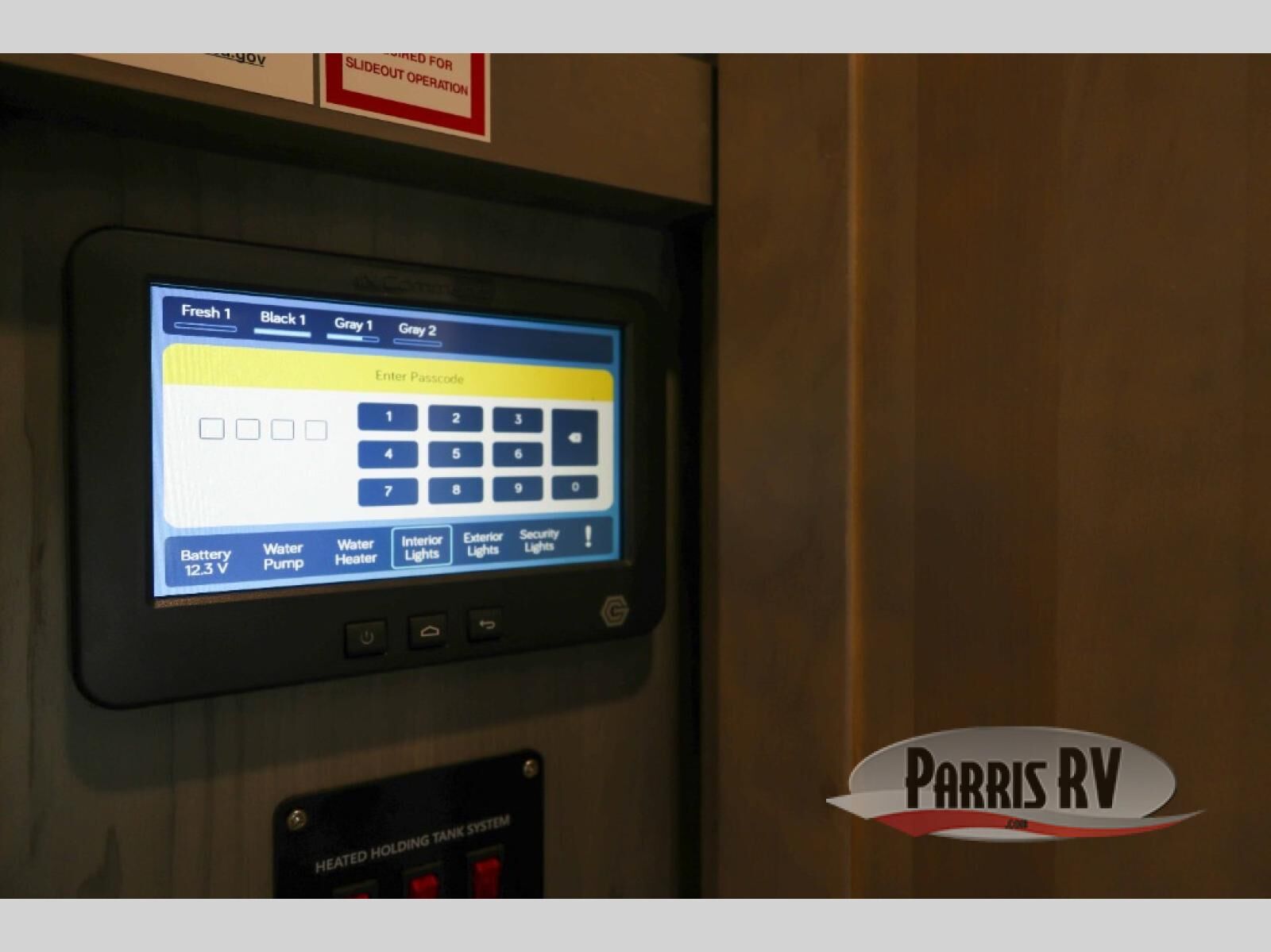 The coffee lover will enjoy camping in this fifth wheel with the coffee station in the kitchen! The kitchen also has an island, a large pantry, a glass top range with convection microwave and range hood that has a pull-down spice rack, a 18 cu. ft. residential refrigerator, and floor cabinets for your storage needs. Eat your meals and play card games at the free standing legless dinette with 110V outlets to charge your electronics. The separated living area has opposing hide-a-bed sofas and power Thomas Payne theater seating across from a rear entertainment center with a telescoping 50" LCD HDTV and a 5,000 BTU decorative fireplace heater with storage on either side. When you're ready to wind down your nights, head to the front private bedroom to enjoy a good night's rest on the king bed slide with storage underneath and there is a front closet with a clothing hamper and an area to add the optional stackable washer and dryer to have clean clothes for your longer trips!