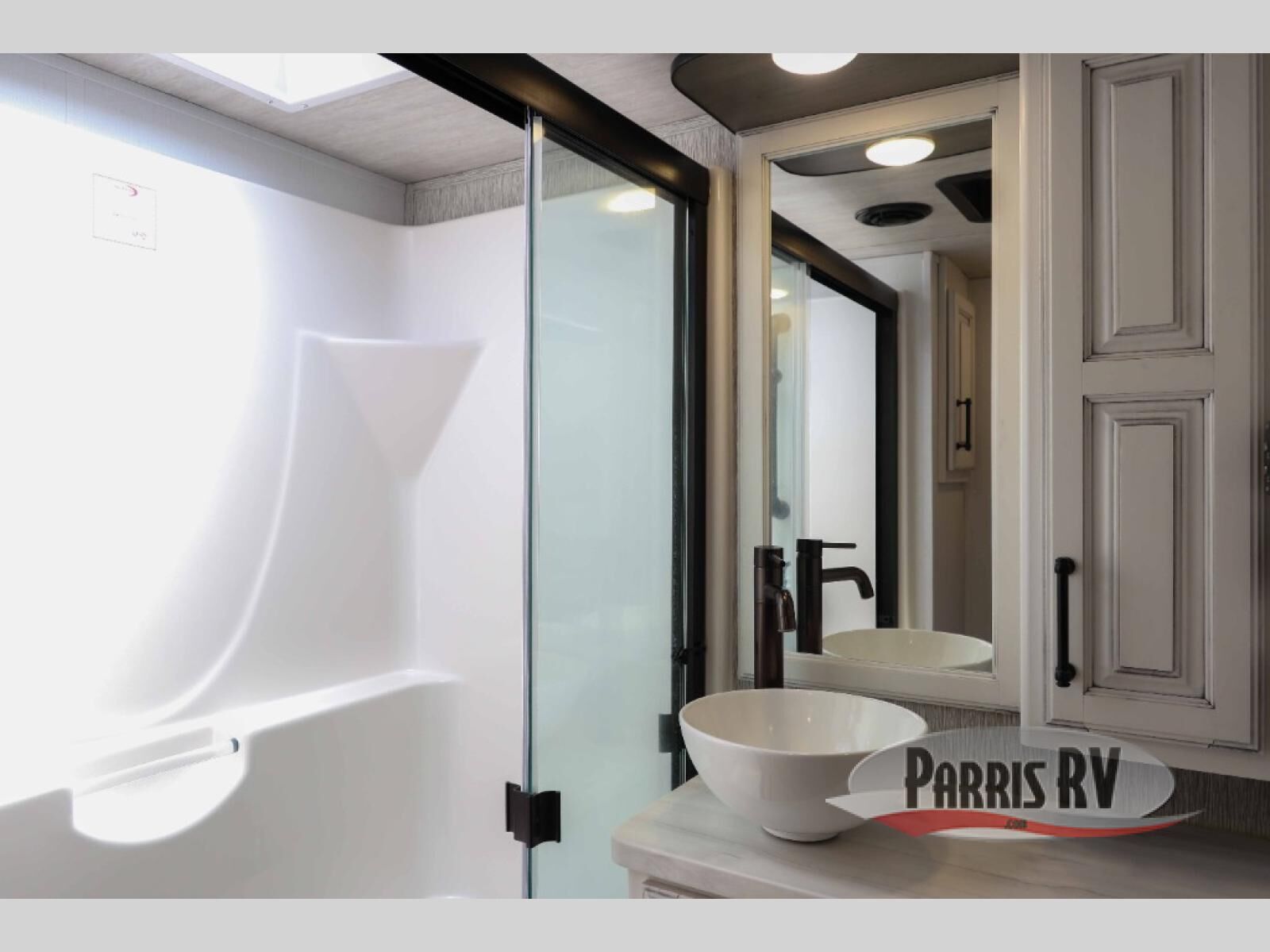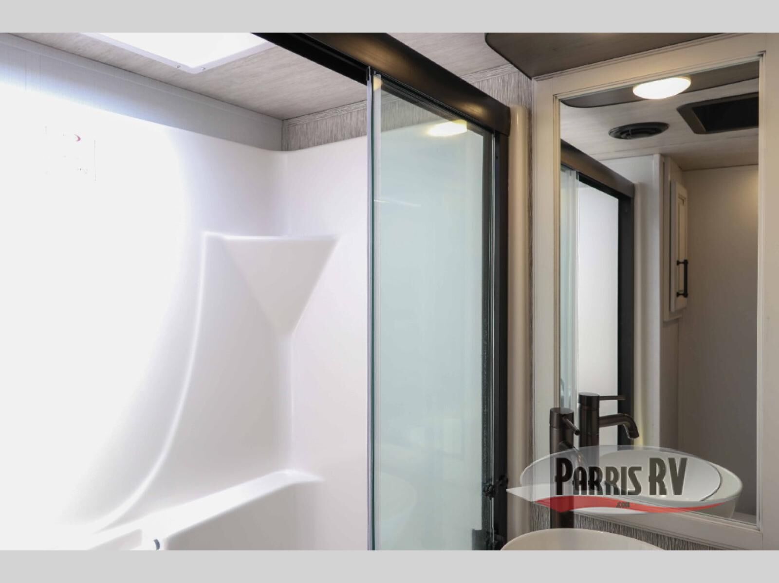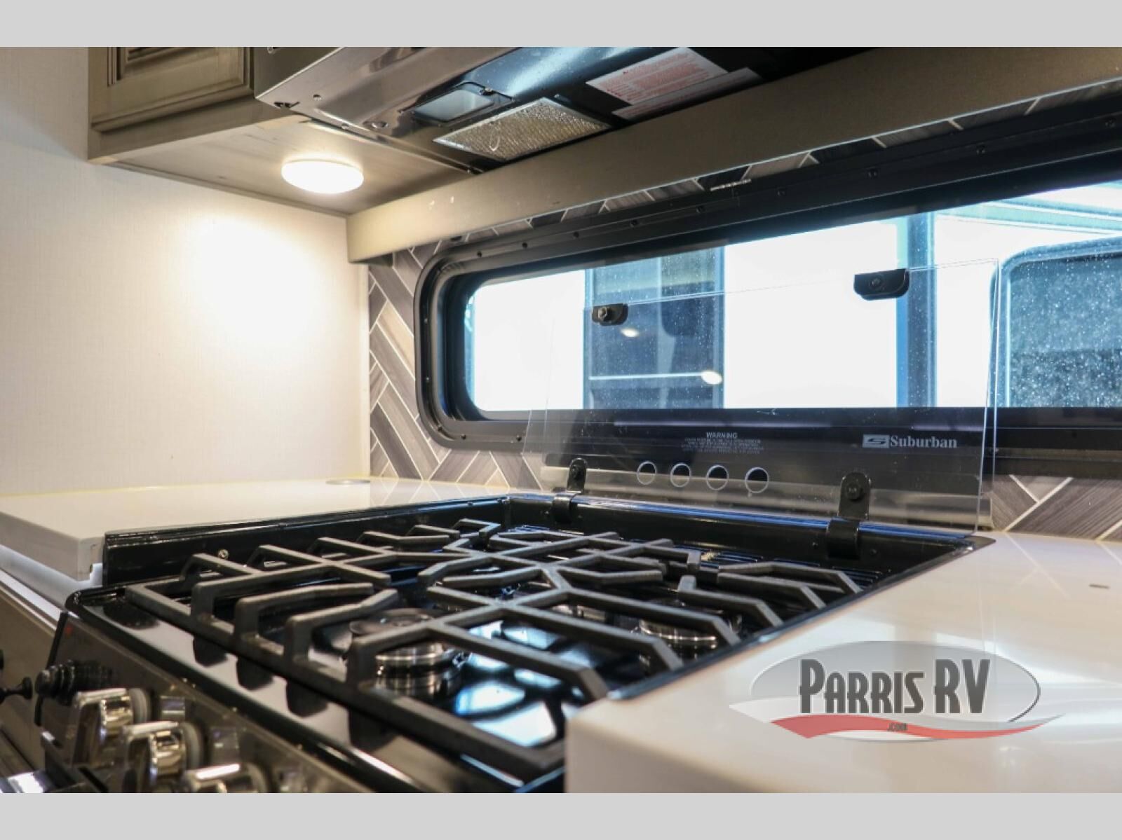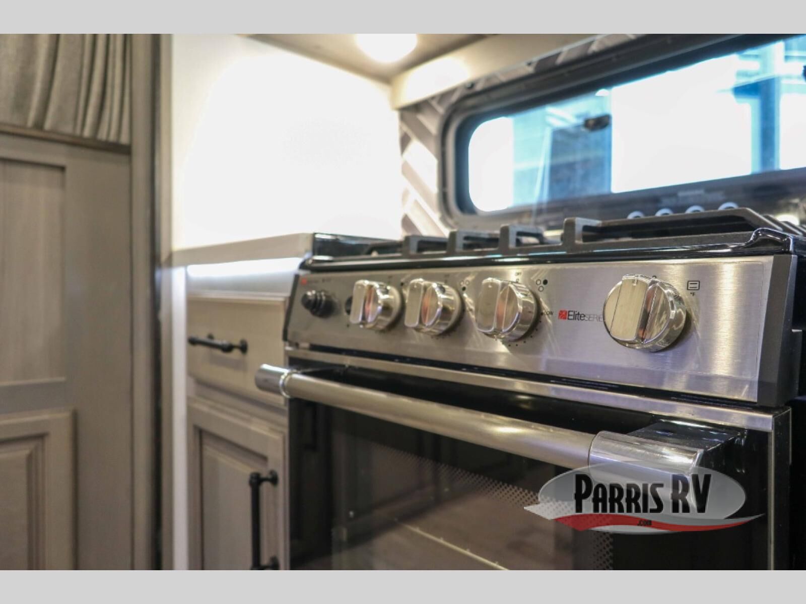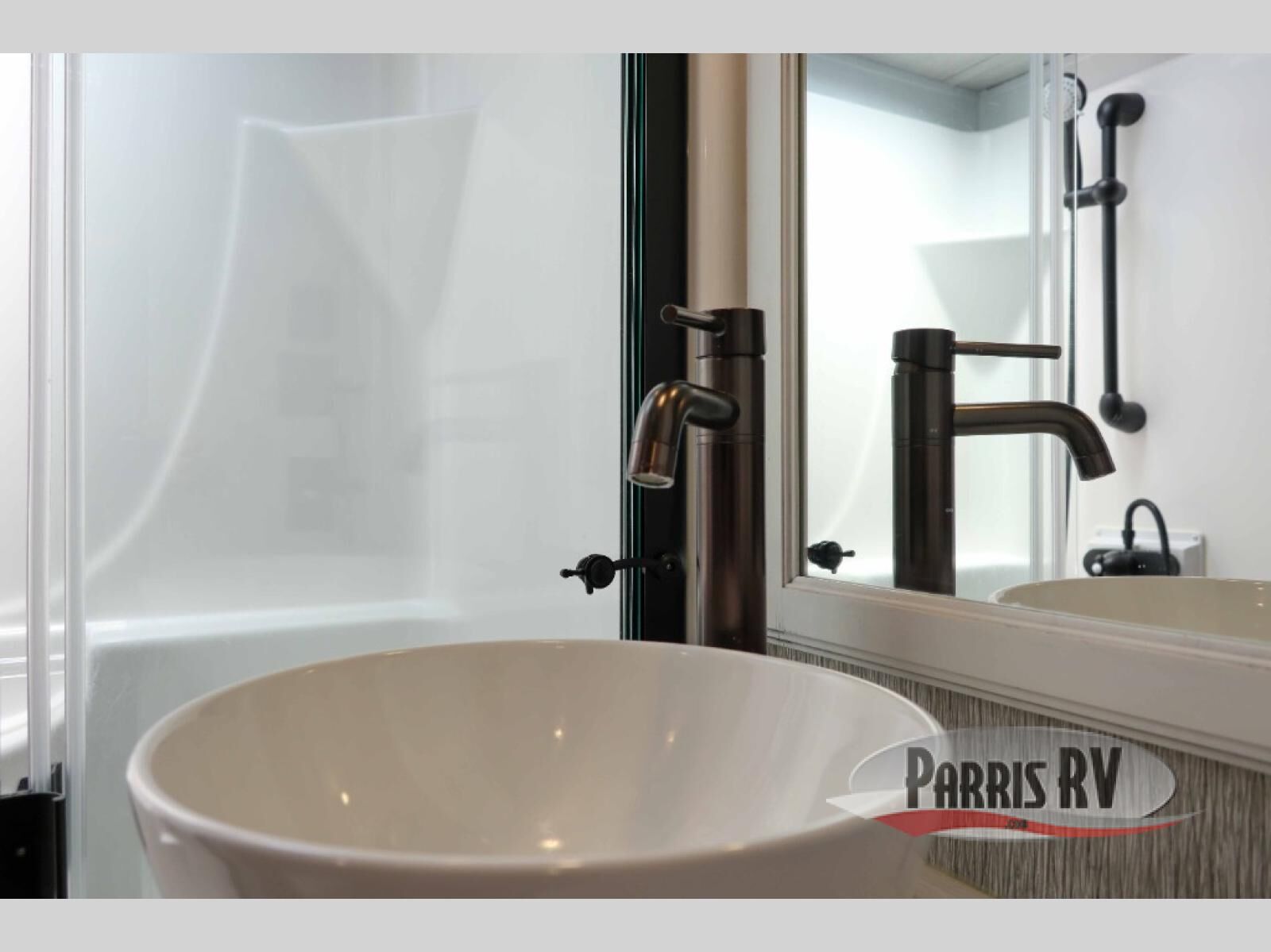 The coffee lover will enjoy camping in this fifth wheel with the coffee station in the kitchen! The kitchen also has an island, a large pantry, a glass top range with convection microwave and range hood that has a pull-down spice rack, a 18 cu. ft. residential refrigerator, and floor cabinets for your storage needs. Eat your meals and play card games at the free standing legless dinette with 110V outlets to charge your electronics. The separated living area has opposing hide-a-bed sofas and power Thomas Payne theater seating across from a rear entertainment center with a telescoping 50" LCD HDTV and a 5,000 BTU decorative fireplace heater with storage on either side. When you're ready to wind down your nights, head to the front private bedroom to enjoy a good night's rest on the king bed slide with storage underneath and there is a front closet with a clothing hamper and an area to add the optional stackable washer and dryer to have clean clothes for your longer trips!