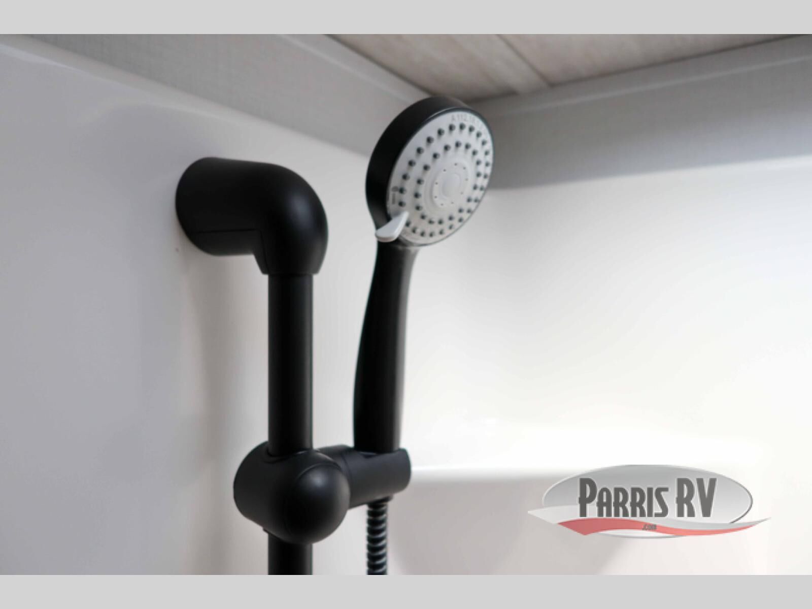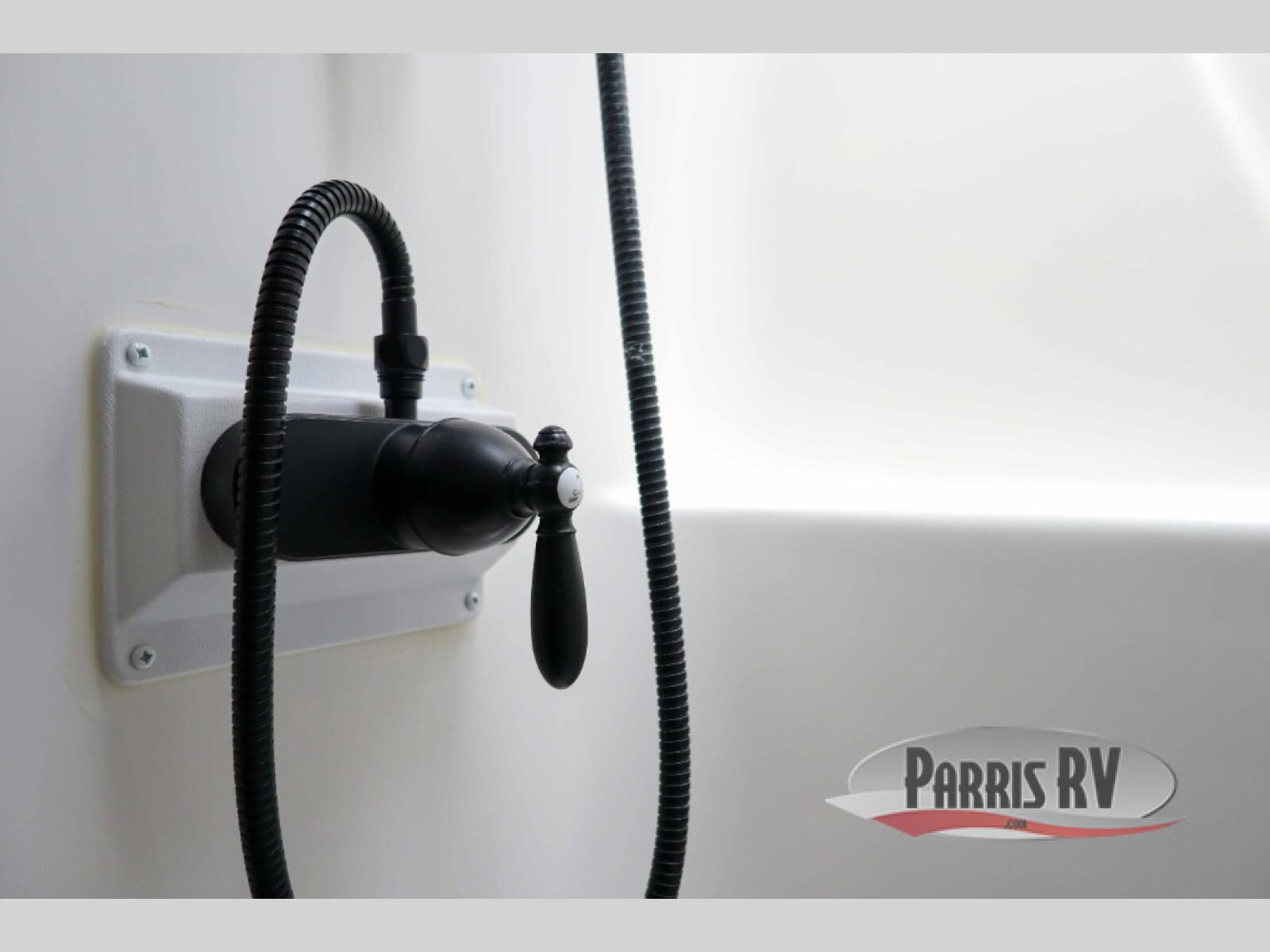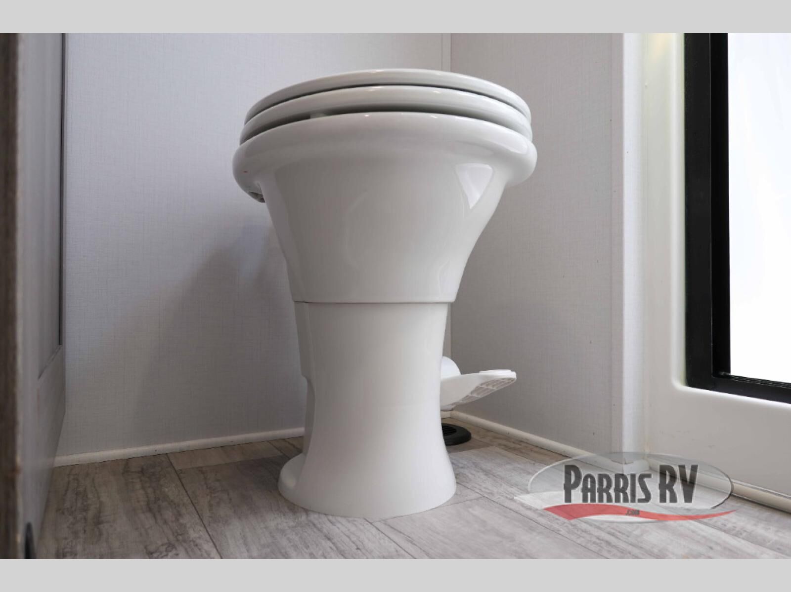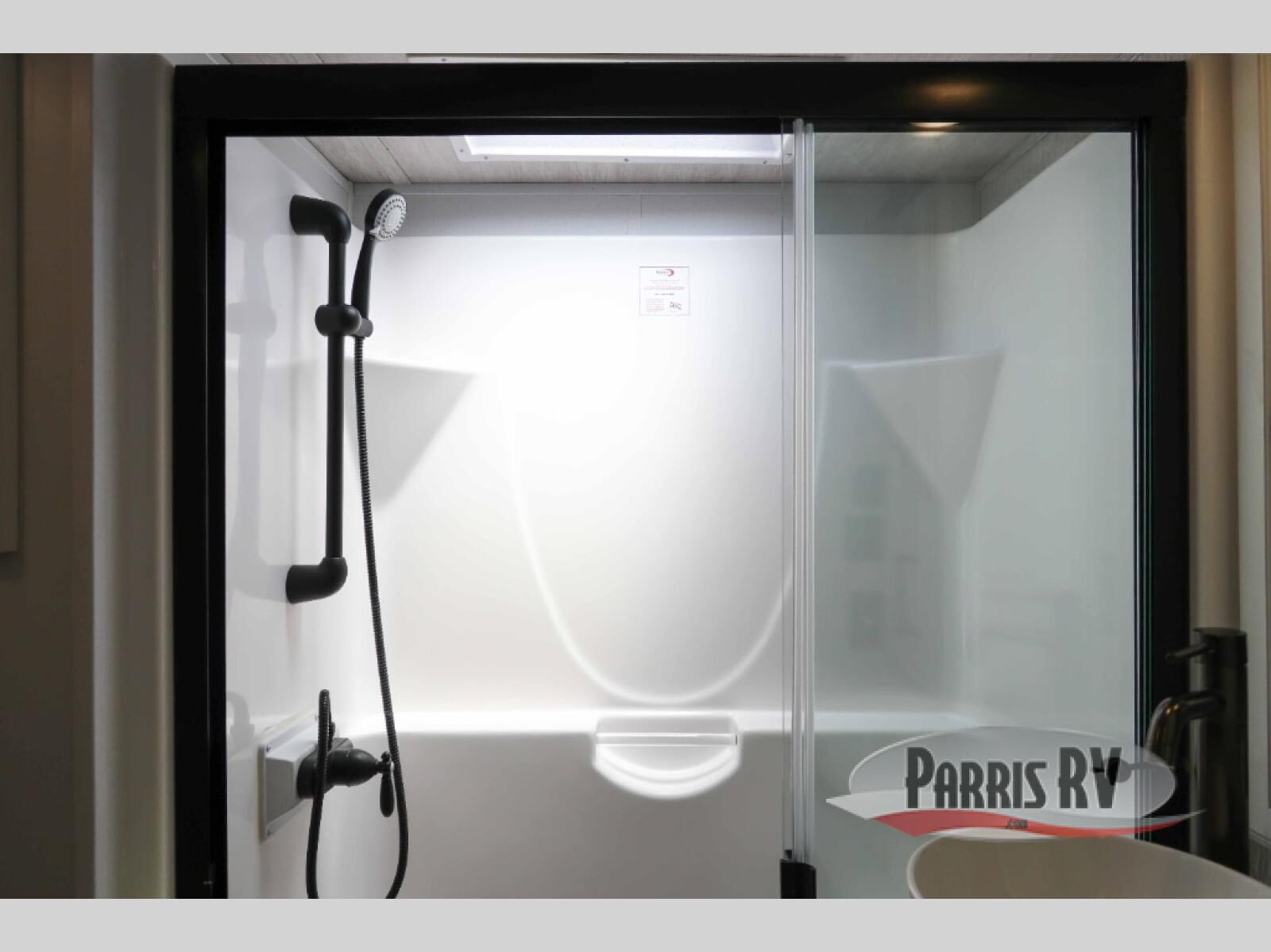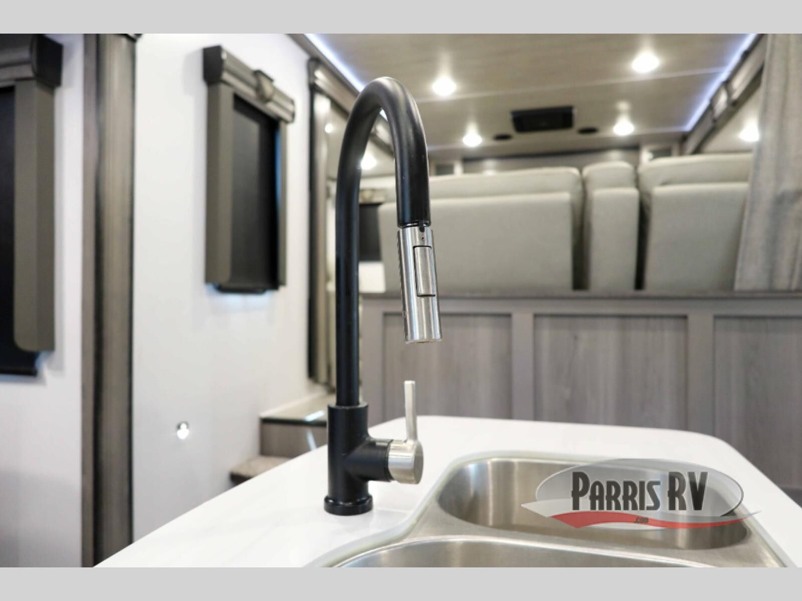 The coffee lover will enjoy camping in this fifth wheel with the coffee station in the kitchen! The kitchen also has an island, a large pantry, a glass top range with convection microwave and range hood that has a pull-down spice rack, a 18 cu. ft. residential refrigerator, and floor cabinets for your storage needs. Eat your meals and play card games at the free standing legless dinette with 110V outlets to charge your electronics. The separated living area has opposing hide-a-bed sofas and power Thomas Payne theater seating across from a rear entertainment center with a telescoping 50" LCD HDTV and a 5,000 BTU decorative fireplace heater with storage on either side. When you're ready to wind down your nights, head to the front private bedroom to enjoy a good night's rest on the king bed slide with storage underneath and there is a front closet with a clothing hamper and an area to add the optional stackable washer and dryer to have clean clothes for your longer trips!