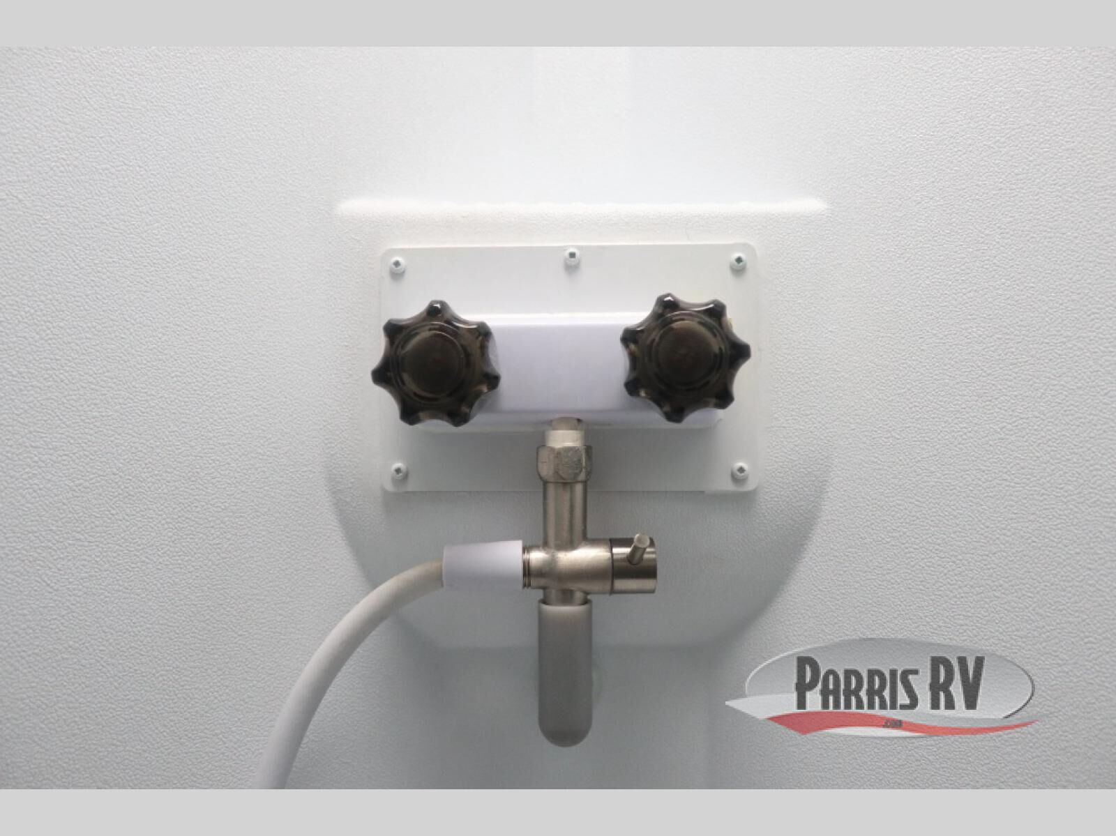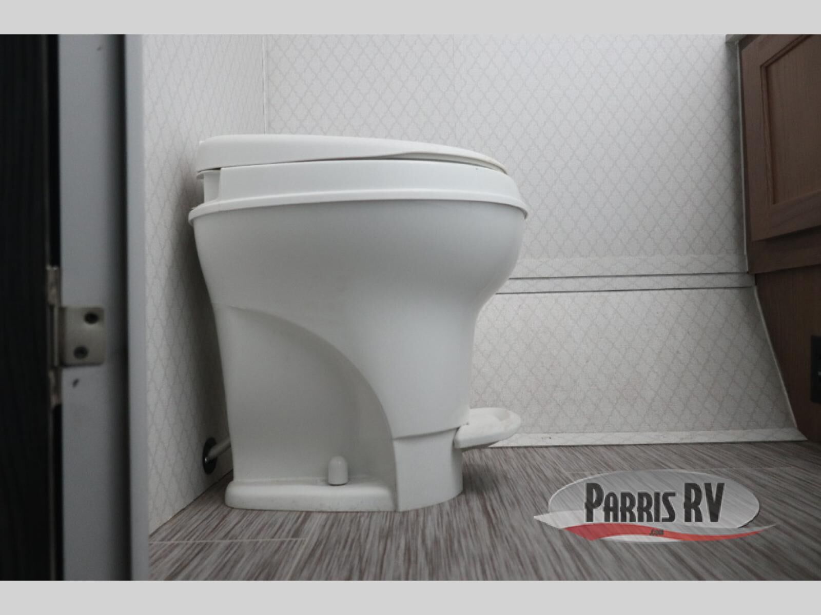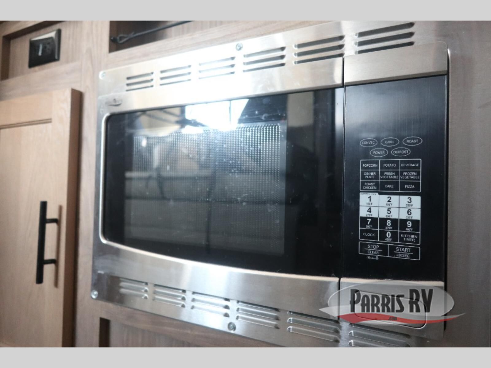 If you haven't experienced the versatility of a Murphy queen bed that can fold out when you need it at night and hide away during the day when you need the sofa, give it a try! You will also find a sofa on the single slide that pushes out to reveal more interior living space. The breakfast bar provides countertop space for dining or visiting with the cook. This can be the perfect couple's trailer, yet a child or guest can sleep on the sofa. Everyone can take turns getting cleaned up in the radius shower in the rear corner bathroom, and some campers can hang out outdoors under the 16' power awning that offers an outdoor living area once you add your camping chairs.