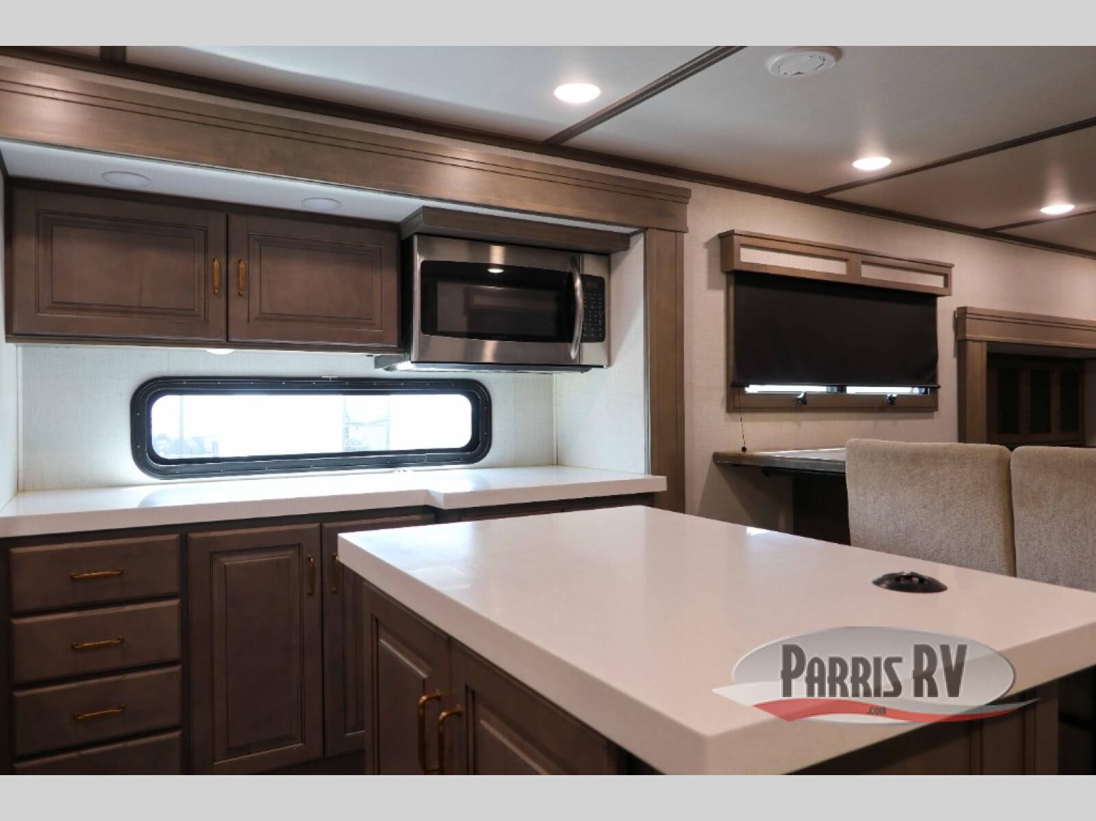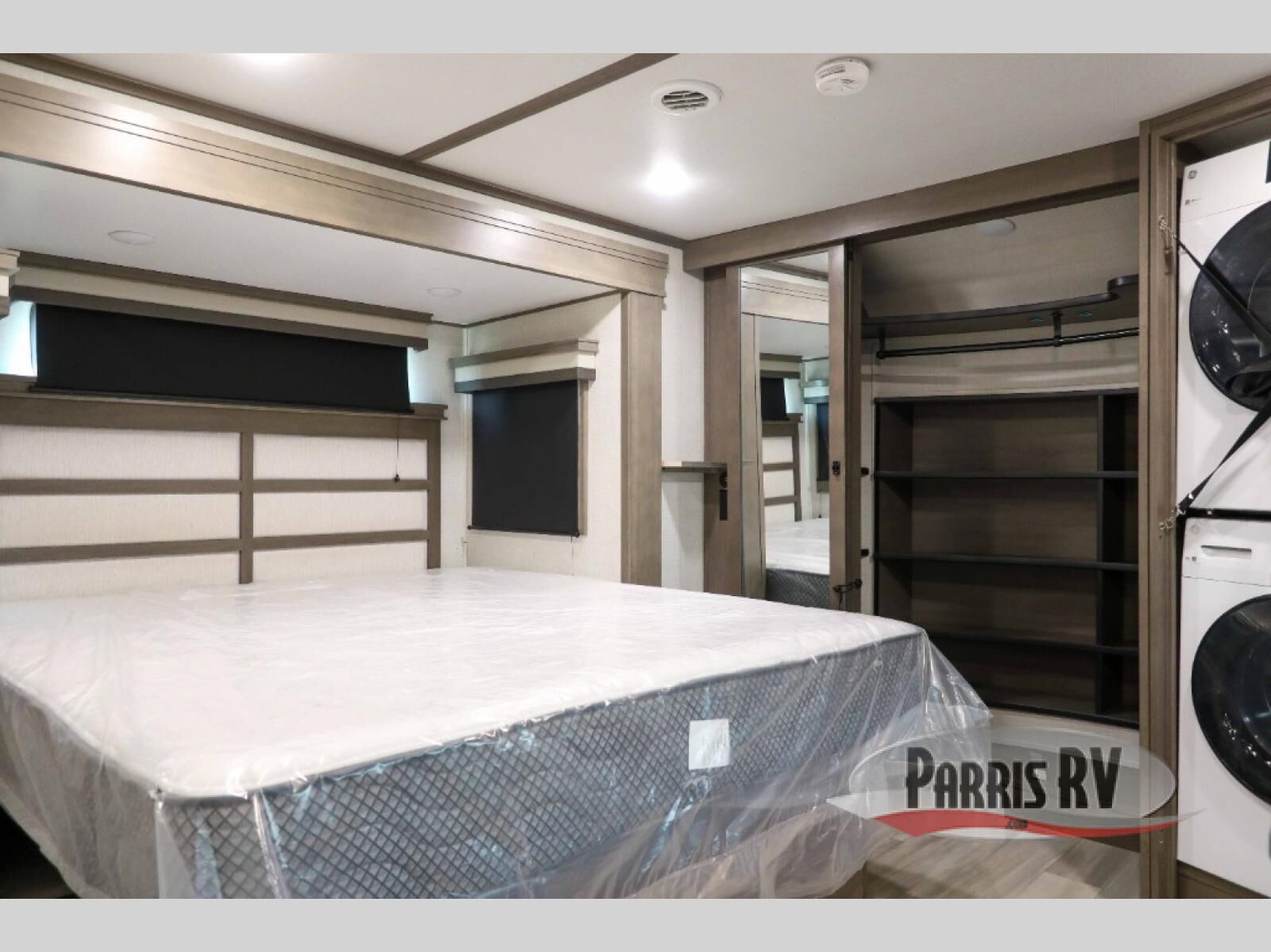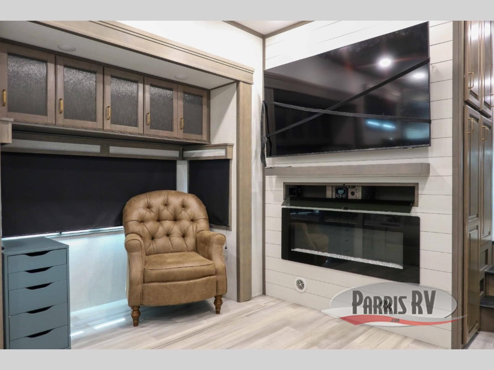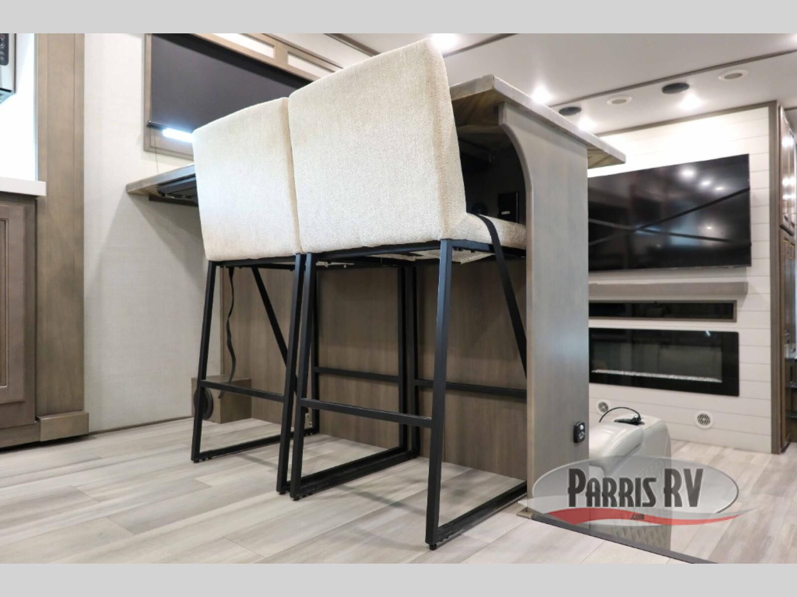 Enjoy each and every vacation, month-long trips, or even extended stays at an RV park in this spacious fifth wheel! The raise rear kitchen gives the cook plenty of room to whip up any type of meal using the stainless steel appliances including a 24" residential oven, an oversized pantry, and the raised bar top will provide you even more counter space on top of dining with two chairs that overlook the middle living area. Relaxing is made easy thanks to two tri-fold sofas and theatre seating while watching the big game on the LED Smart TV and enjoying the fireplace below. Dual sinks in the full bathroom allow two people to easily get ready at once, and the flip up teak seat in the shower is a nice convenience. At night, retire to your own queen bed which slides out to provide more floor space, and enjoy a show on the LED TV above the flip-top dresser once in bed.