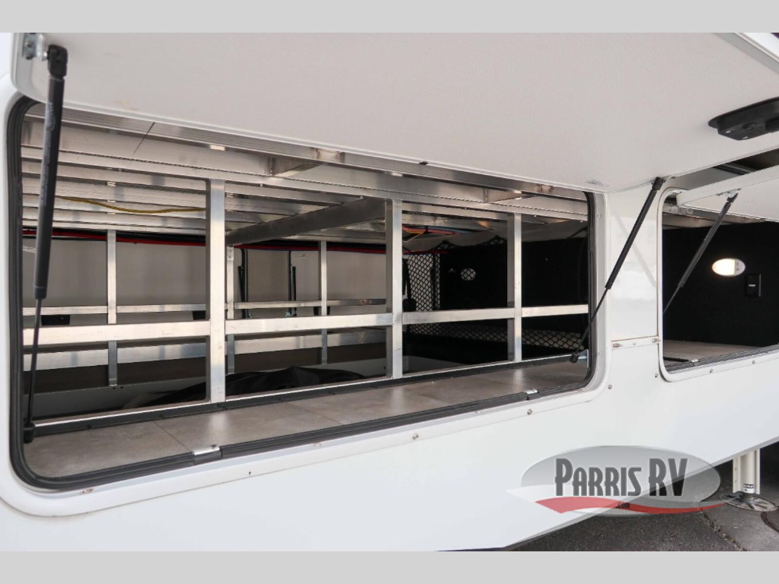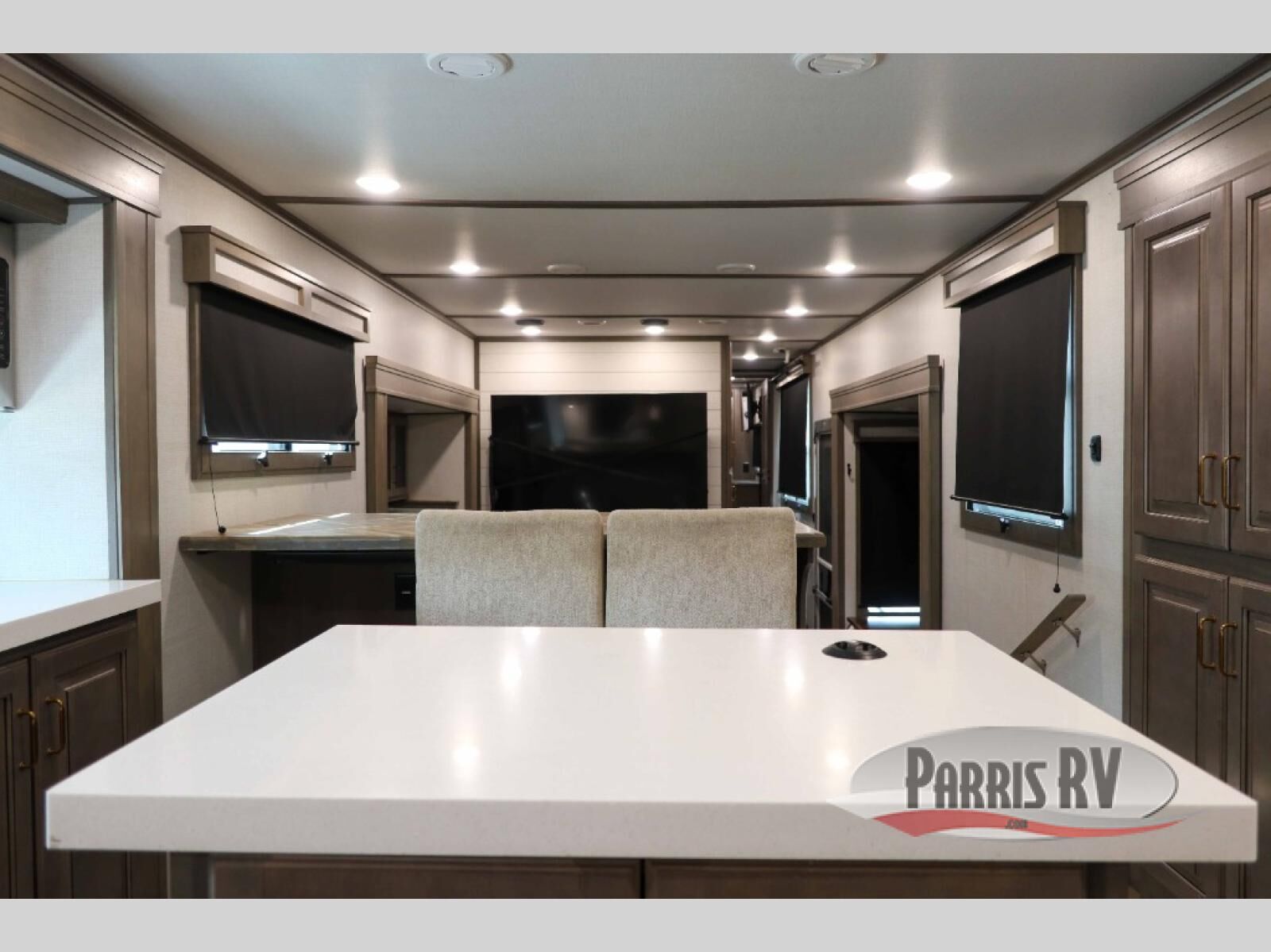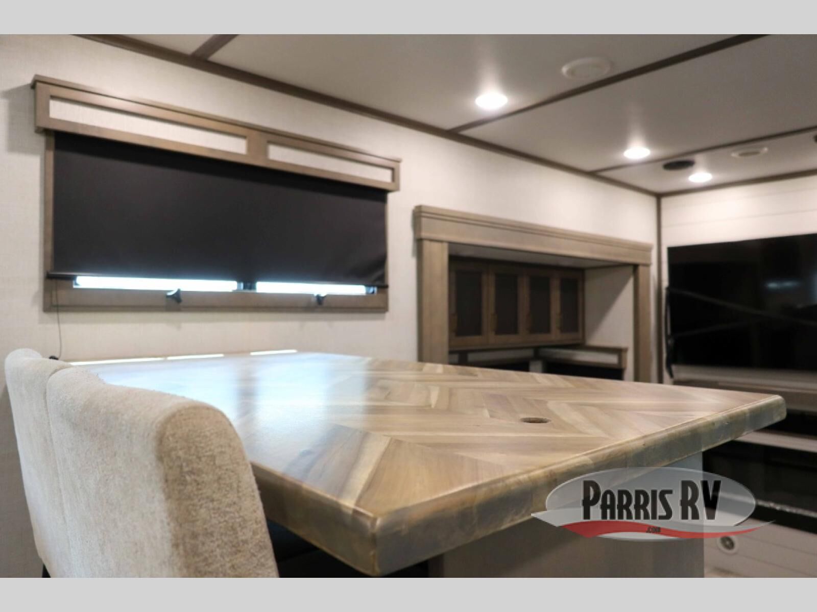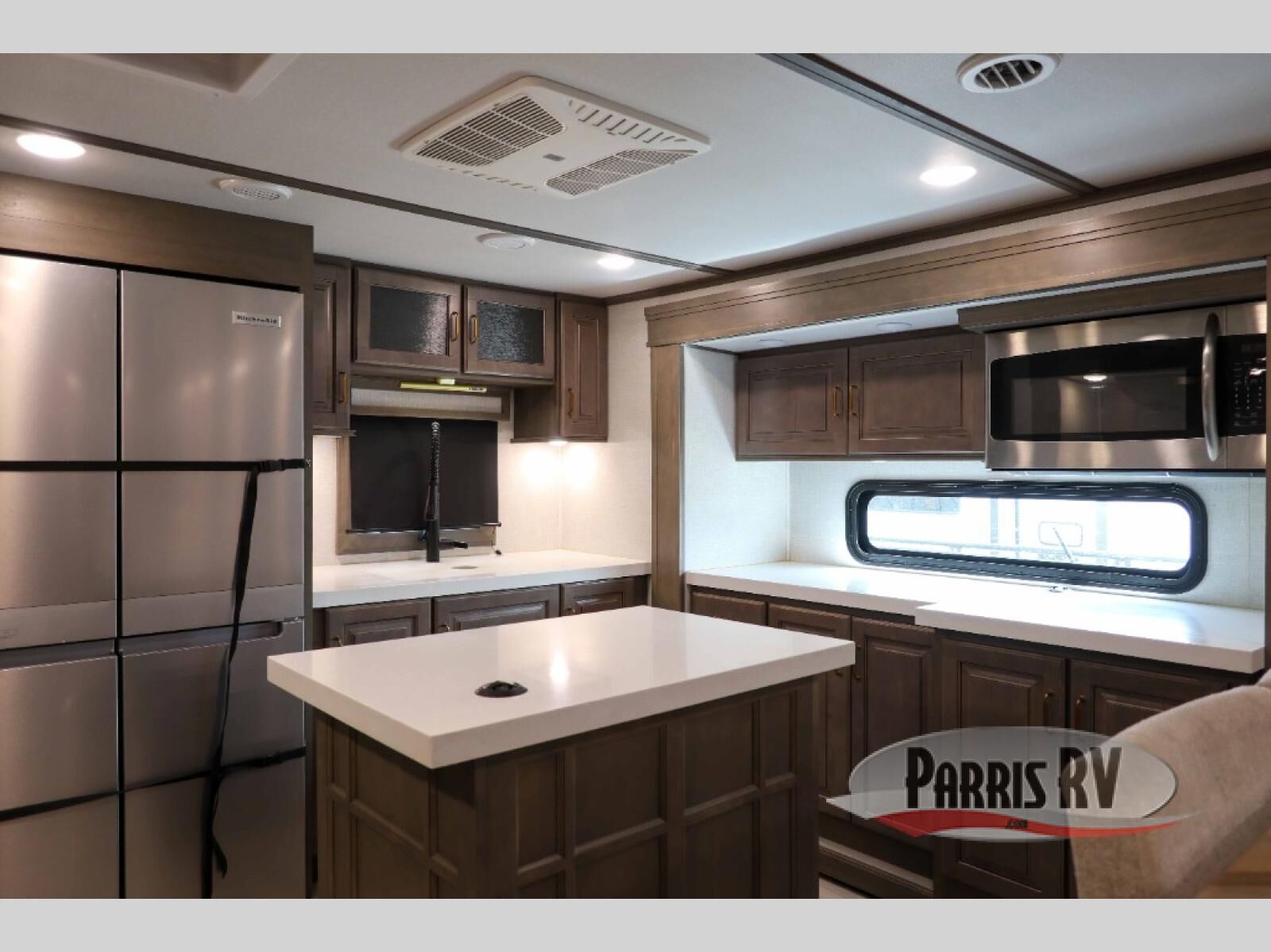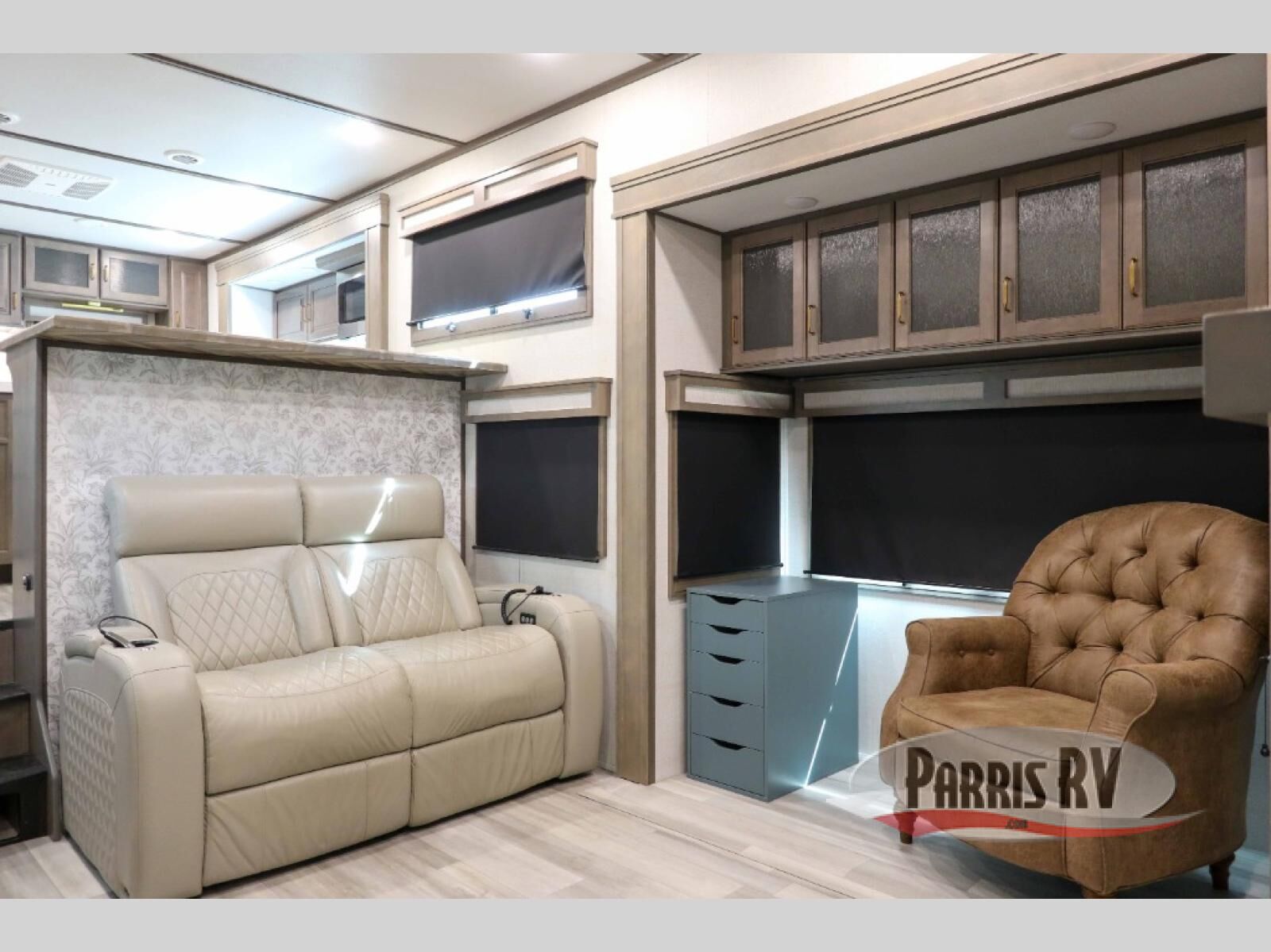 Enjoy each and every vacation, month-long trips, or even extended stays at an RV park in this spacious fifth wheel! The raise rear kitchen gives the cook plenty of room to whip up any type of meal using the stainless steel appliances including a 24" residential oven, an oversized pantry, and the raised bar top will provide you even more counter space on top of dining with two chairs that overlook the middle living area. Relaxing is made easy thanks to two tri-fold sofas and theatre seating while watching the big game on the LED Smart TV and enjoying the fireplace below. Dual sinks in the full bathroom allow two people to easily get ready at once, and the flip up teak seat in the shower is a nice convenience. At night, retire to your own queen bed which slides out to provide more floor space, and enjoy a show on the LED TV above the flip-top dresser once in bed.
