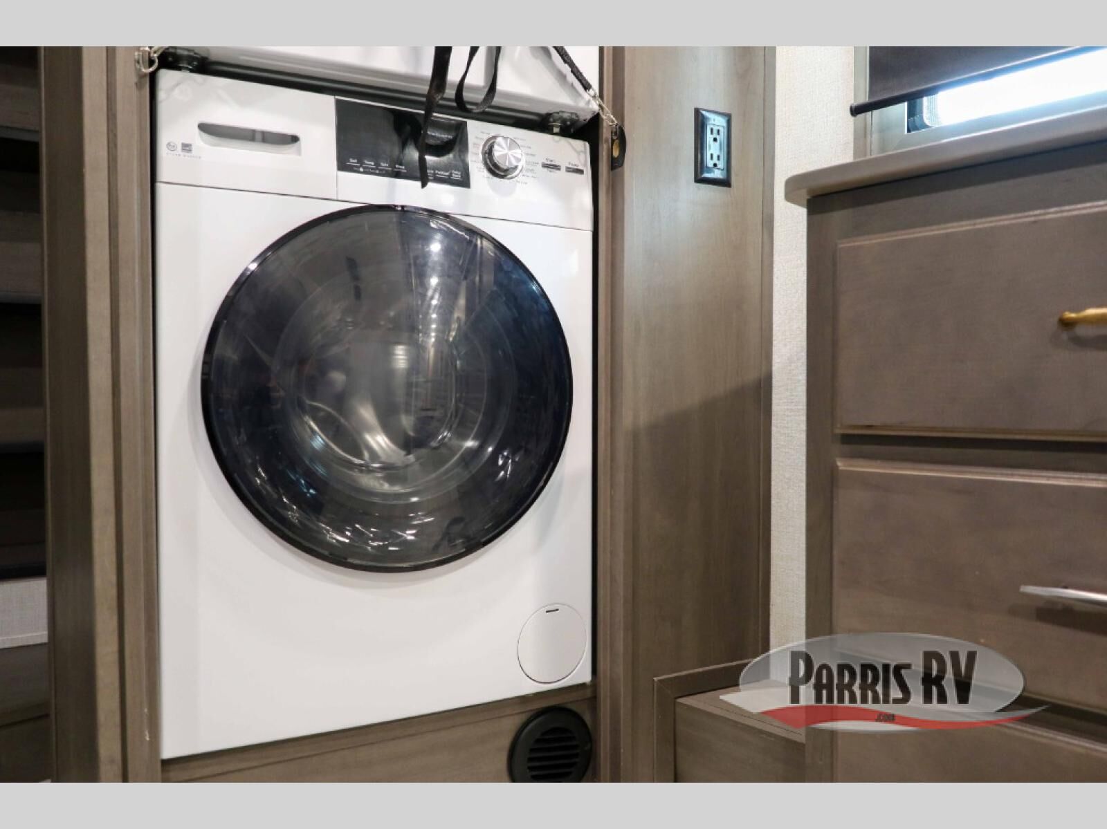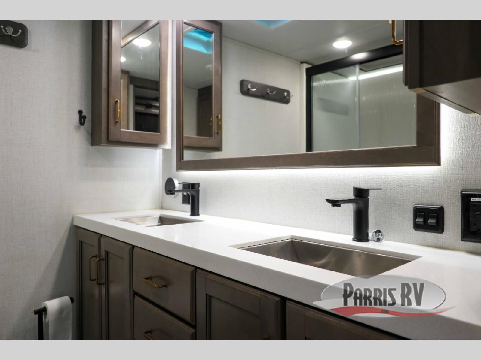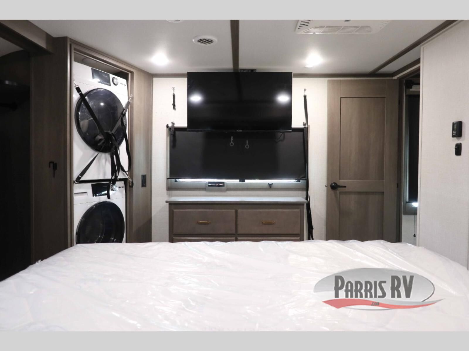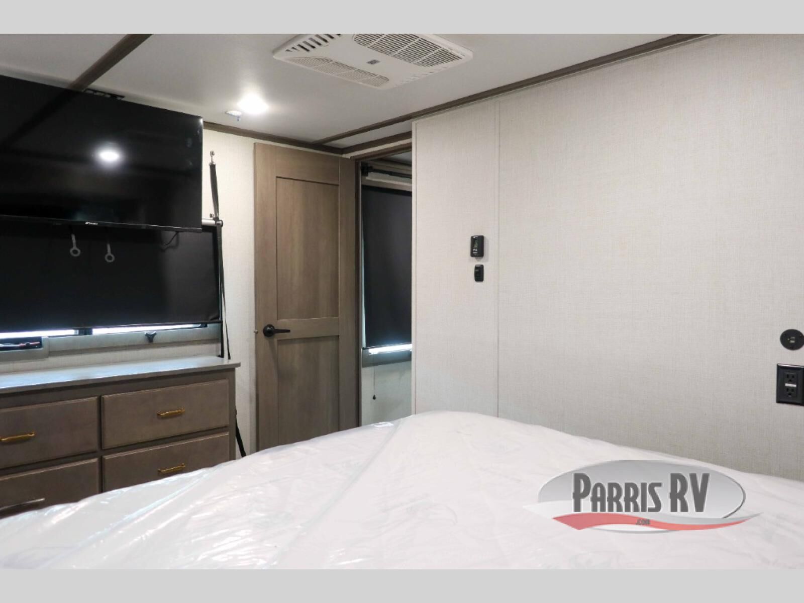 Enjoy each and every vacation, month-long trips, or even extended stays at an RV park in this spacious fifth wheel! The raise rear kitchen gives the cook plenty of room to whip up any type of meal using the stainless steel appliances including a 24" residential oven, an oversized pantry, and the raised bar top will provide you even more counter space on top of dining with two chairs that overlook the middle living area. Relaxing is made easy thanks to two tri-fold sofas and theatre seating while watching the big game on the LED Smart TV and enjoying the fireplace below. Dual sinks in the full bathroom allow two people to easily get ready at once, and the flip up teak seat in the shower is a nice convenience. At night, retire to your own queen bed which slides out to provide more floor space, and enjoy a show on the LED TV above the flip-top dresser once in bed.
