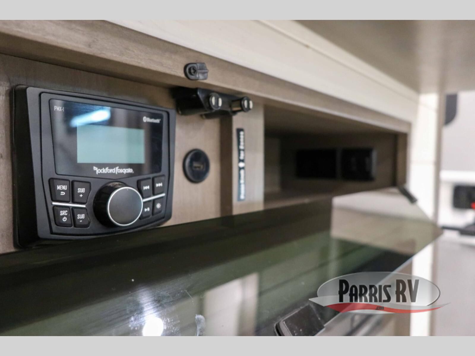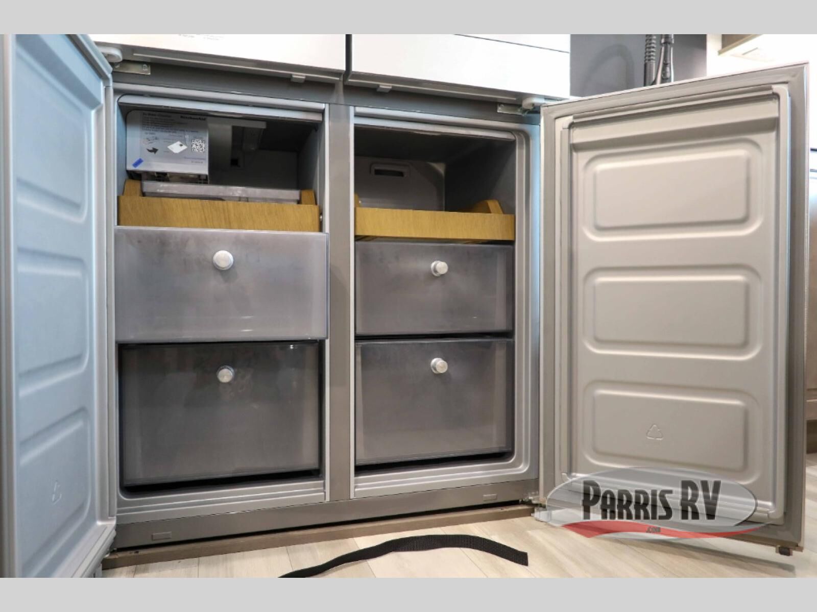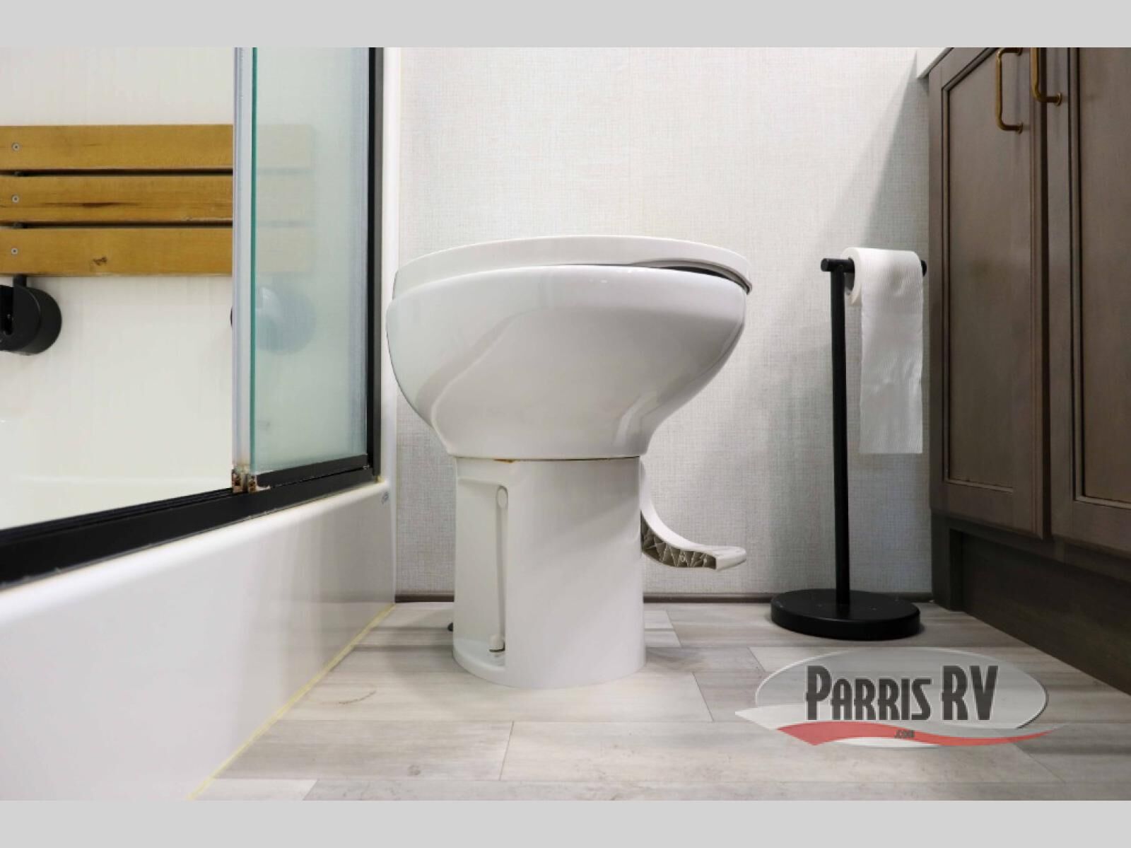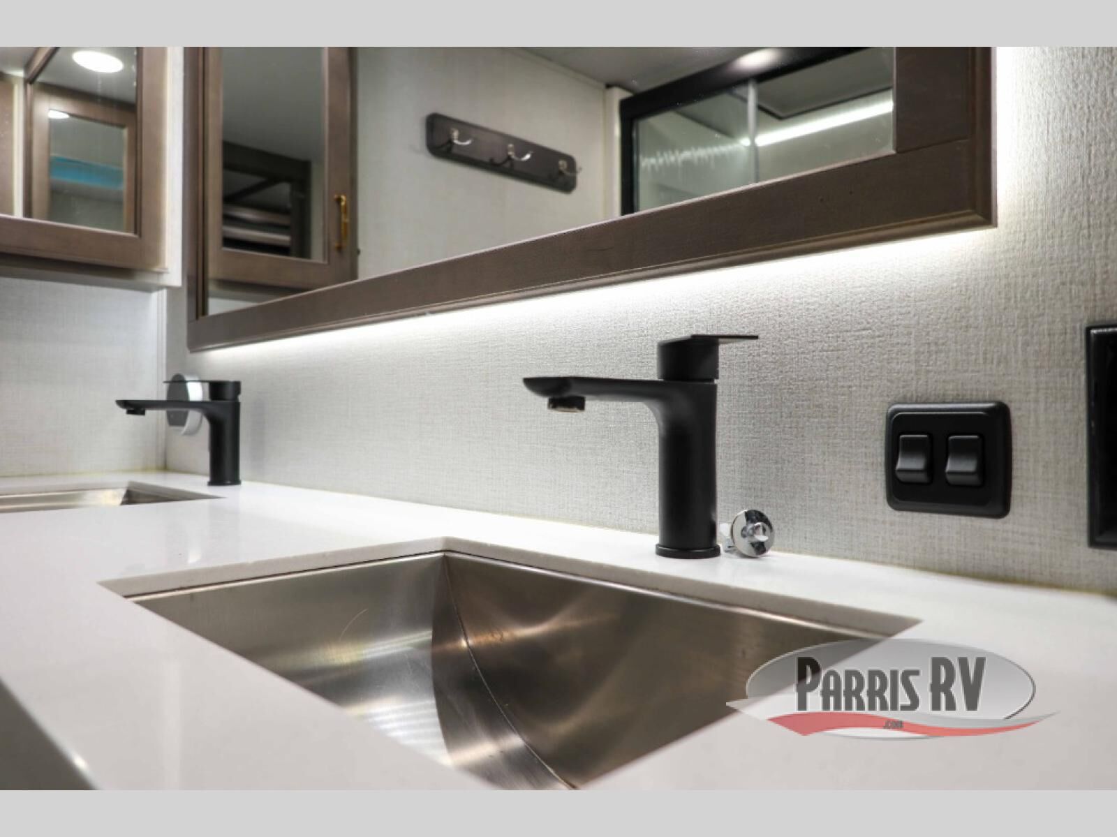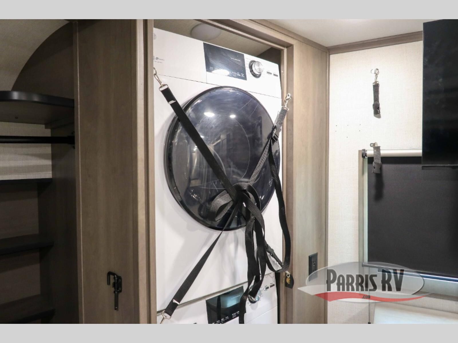 Enjoy each and every vacation, month-long trips, or even extended stays at an RV park in this spacious fifth wheel! The raise rear kitchen gives the cook plenty of room to whip up any type of meal using the stainless steel appliances including a 24" residential oven, an oversized pantry, and the raised bar top will provide you even more counter space on top of dining with two chairs that overlook the middle living area. Relaxing is made easy thanks to two tri-fold sofas and theatre seating while watching the big game on the LED Smart TV and enjoying the fireplace below. Dual sinks in the full bathroom allow two people to easily get ready at once, and the flip up teak seat in the shower is a nice convenience. At night, retire to your own queen bed which slides out to provide more floor space, and enjoy a show on the LED TV above the flip-top dresser once in bed.