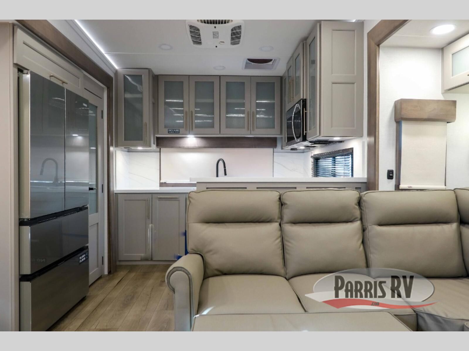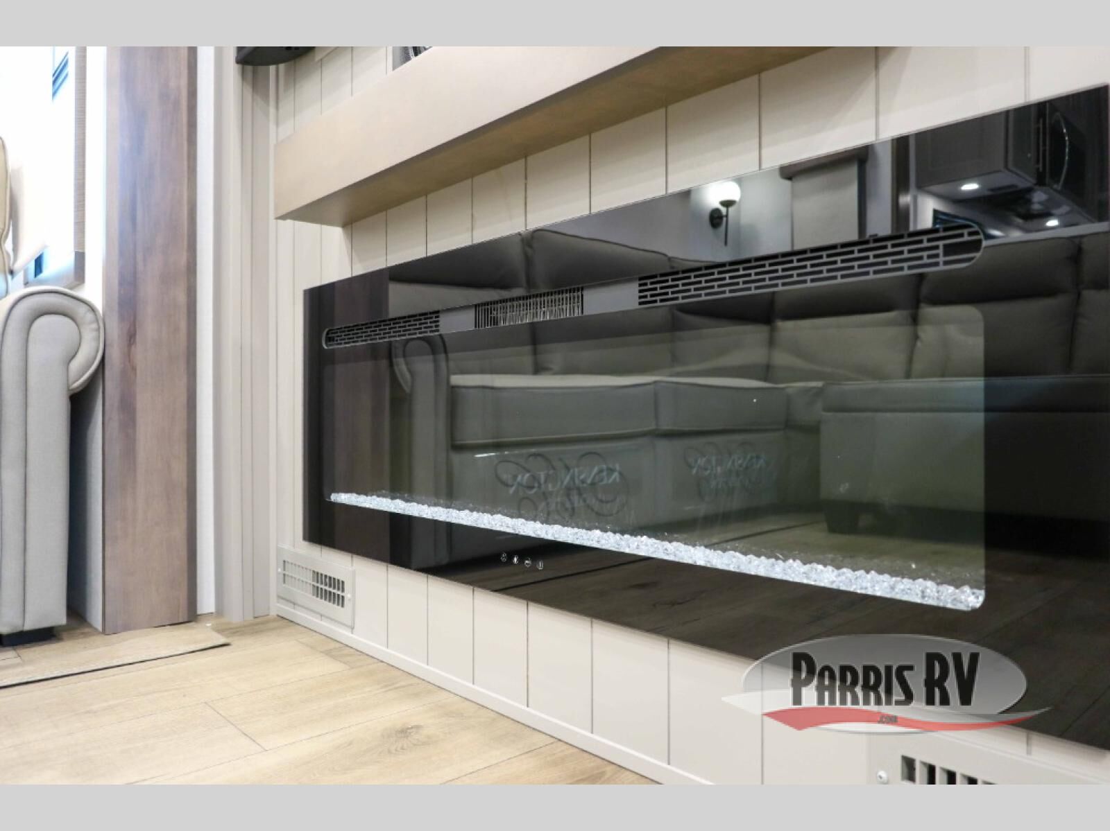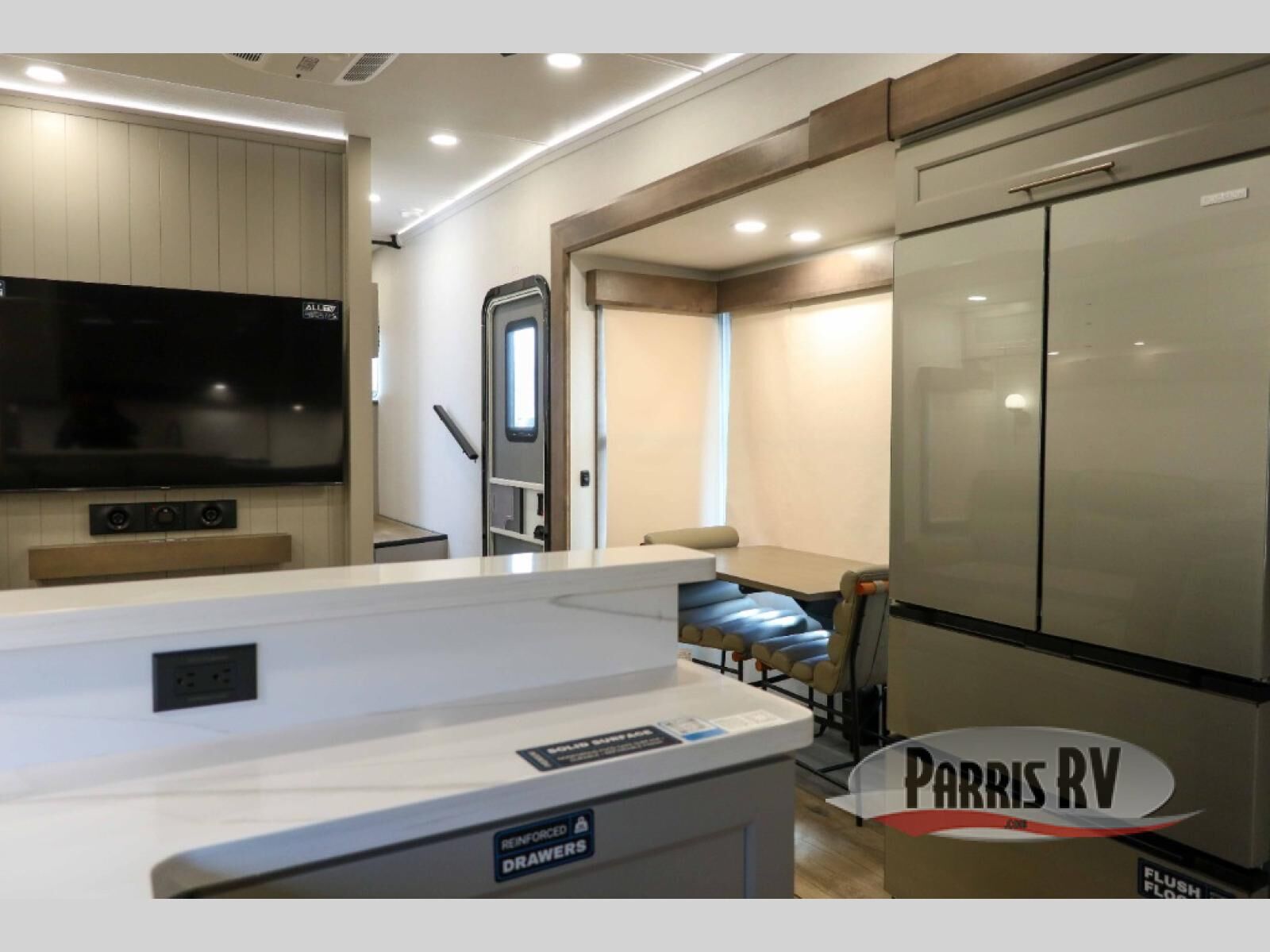 Escape the ordinary and experience the ultimate in luxury travel with this stunning fifth wheel! The rear kitchen is the heart of this fifth wheel, featuring a spacious pantry, 12V refrigerator, microwave, and overhead cabinets. Prepare delicious meals with ease and enjoy the convenience of a fully-equipped kitchen. Unwind in the spacious living area, featuring a plush trifold sofa, L-shape sofa, and a dual recliner love seat. Gather around the turntable dinette or relax in front of the stunning 65" TV. The full bathroom provides a serene space for personal care, while the front bedroom is a peaceful retreat with a comfortable queen bed and a flip-top dresser. Enjoy your favorite shows on the smart TV, perfect for relaxing after a day of adventure.