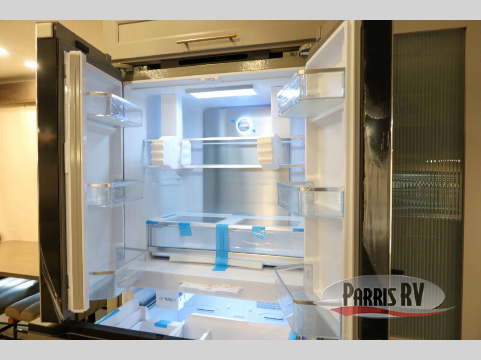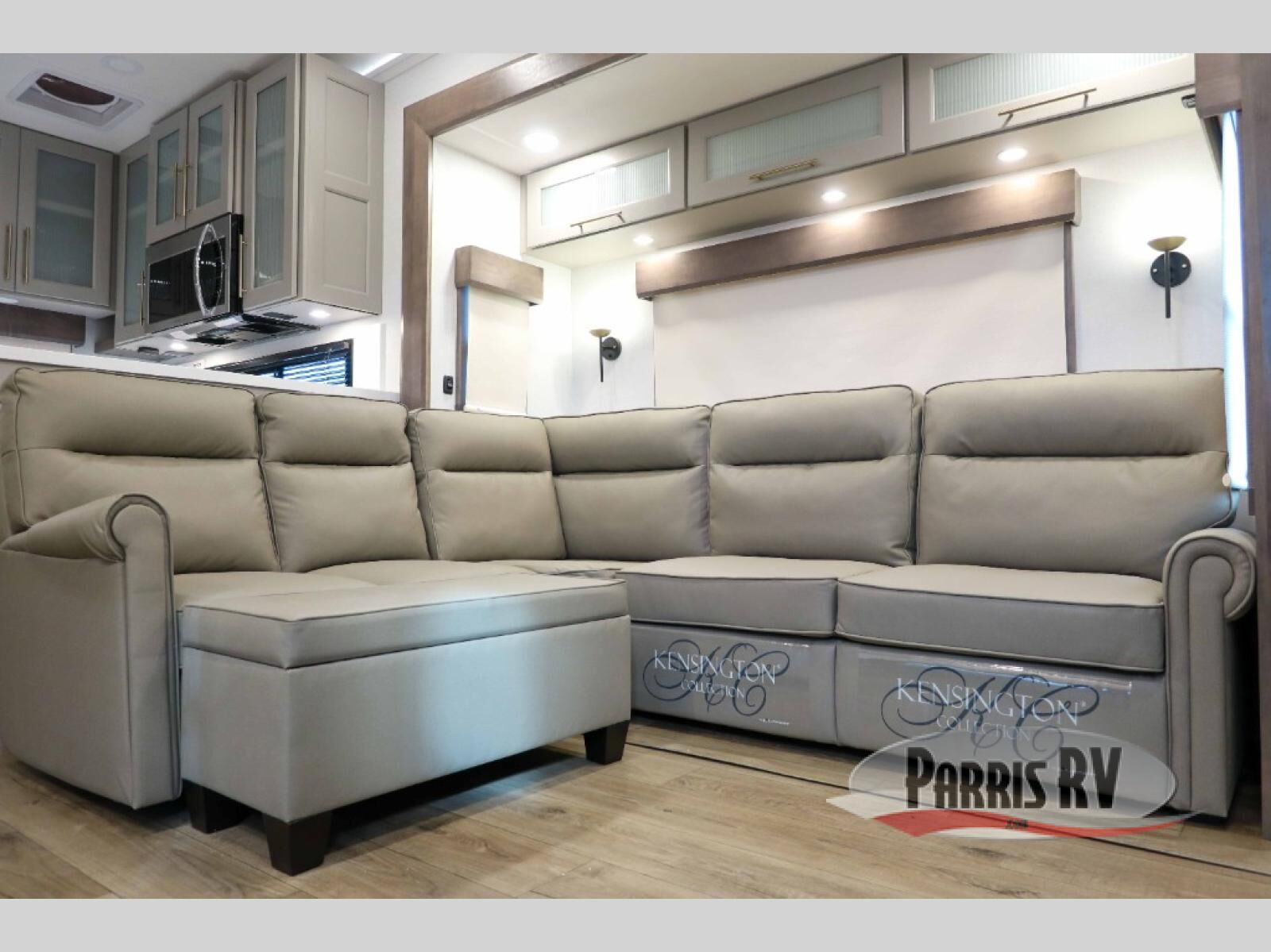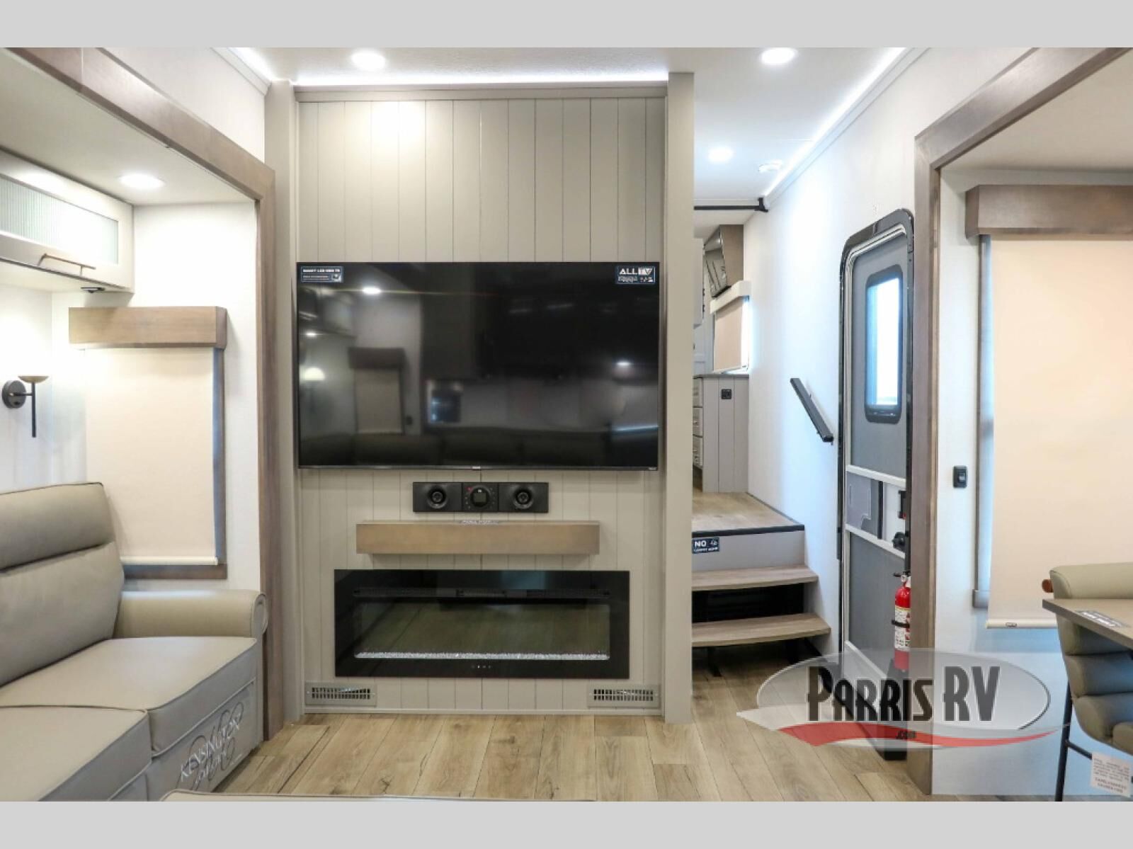 Escape the ordinary and experience the ultimate in luxury travel with this stunning fifth wheel! The rear kitchen is the heart of this fifth wheel, featuring a spacious pantry, 12V refrigerator, microwave, and overhead cabinets. Prepare delicious meals with ease and enjoy the convenience of a fully-equipped kitchen. Unwind in the spacious living area, featuring a plush trifold sofa, L-shape sofa, and a dual recliner love seat. Gather around the turntable dinette or relax in front of the stunning 65" TV. The full bathroom provides a serene space for personal care, while the front bedroom is a peaceful retreat with a comfortable queen bed and a flip-top dresser. Enjoy your favorite shows on the smart TV, perfect for relaxing after a day of adventure.