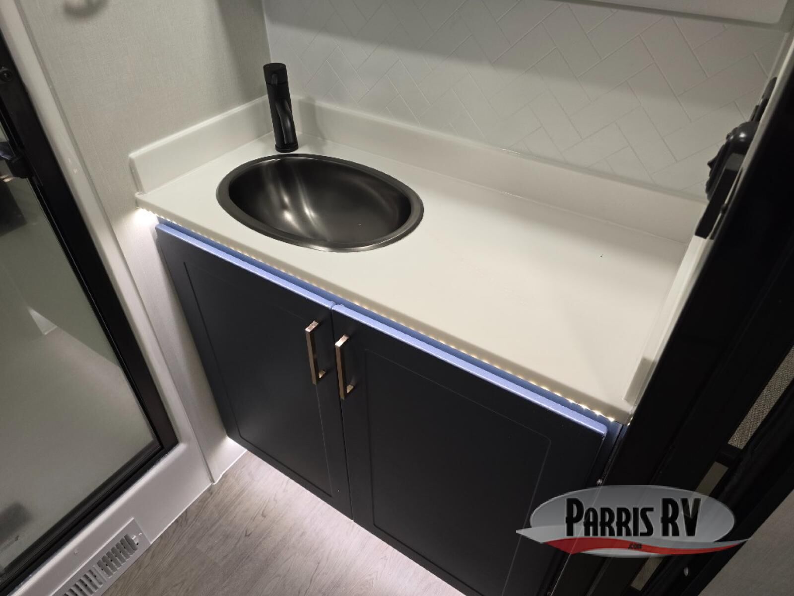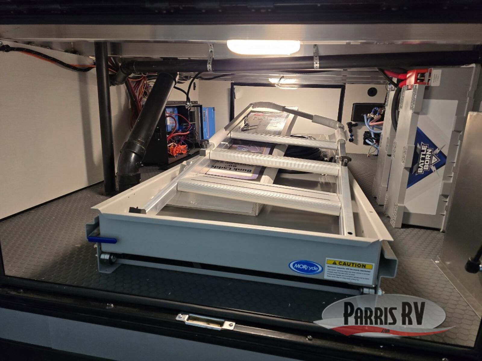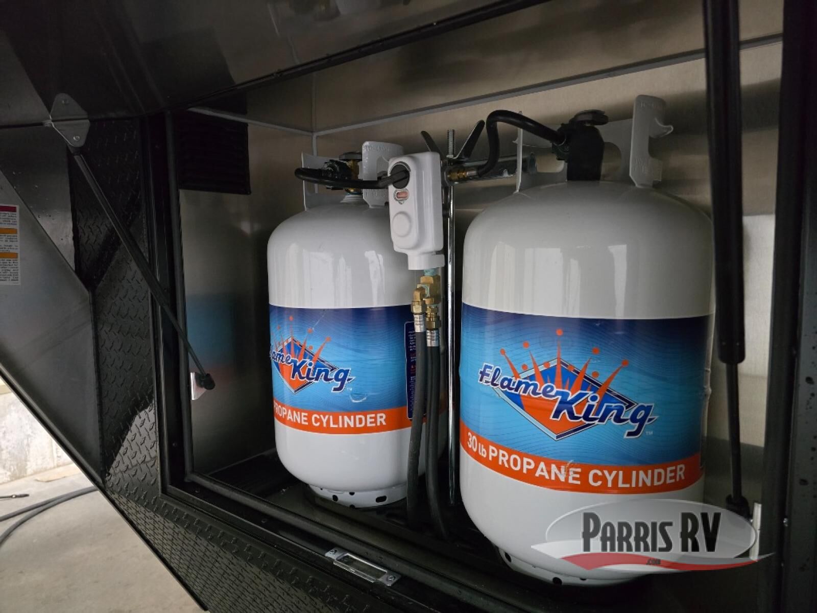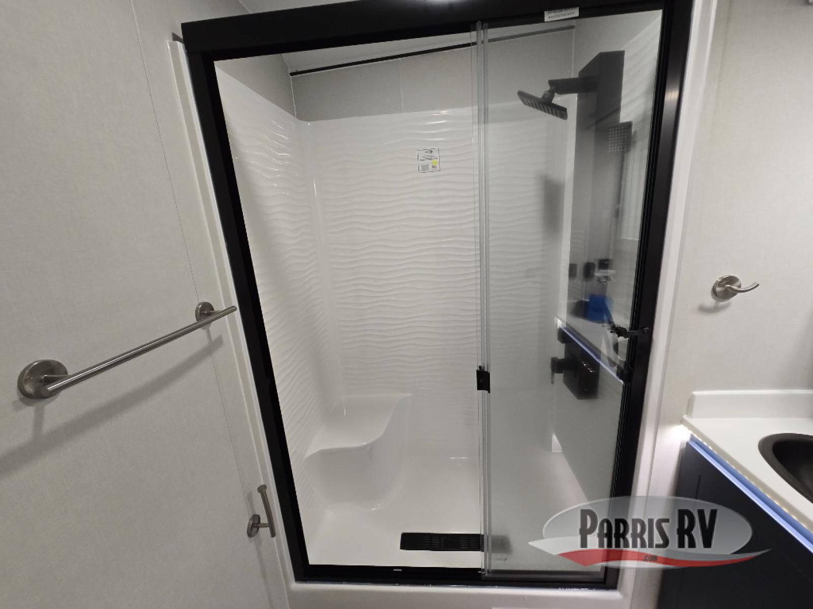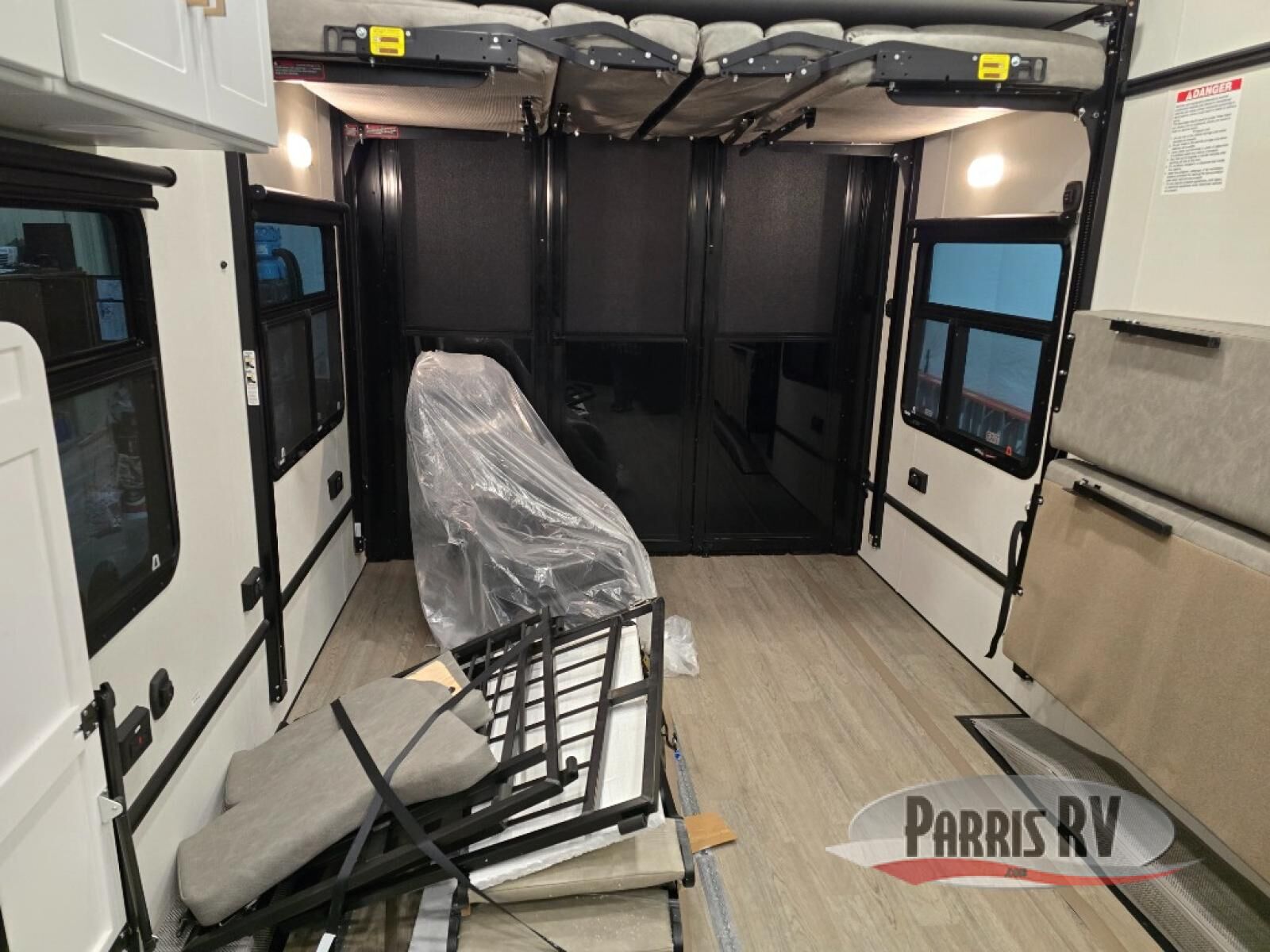 Start a new adventure in this spacious toy hauler that can sleep 2-10 depending on the options you choose to add! Once your toys are unloaded using the cableless rear ramp door, you can head out on a trail or two. You'll find a residential queen bed with storage in the front bedroom, along with storage space for your things and TV prep if you want to add a television. The full bath includes a spa/jet shower fixture that is sure to be nice after a day of riding the trails, and there is a glass shower door for added luxury. Head to the kitchen where you can whip up a meal for your crew on the LP three burner cooktop or in the convection microwave, and you can dine at the dinette with four chairs. If you'd like to get some fresh air, take your plate outdoors to sit under the power awning with a light strip!