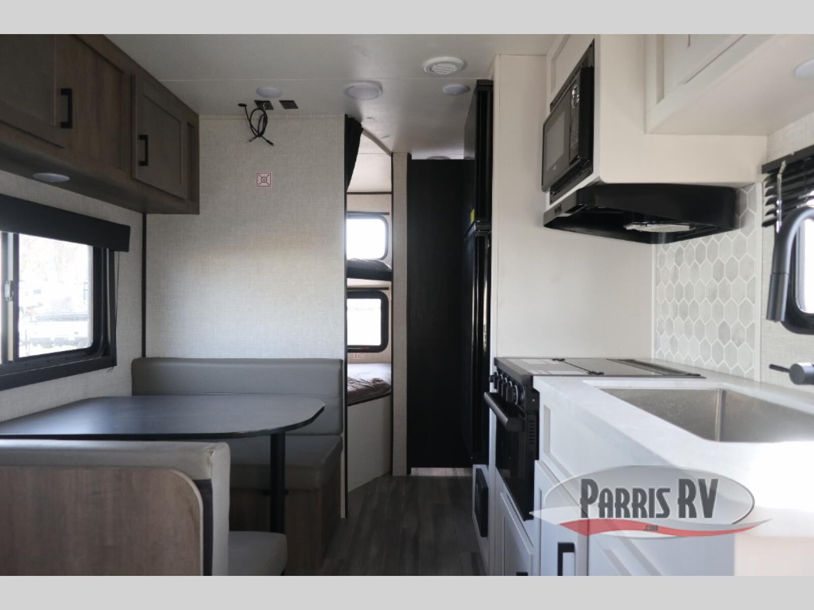 This dual-axle travel trailer can sleep eight people each night, so invite your family or friends along. You will enjoy the front private bedroom up front with dual wardrobes to keep your clothes tidy, and an easy lift bed with storage. While the chef of your group is preparing lunch on the three burner cooktop, everyone else can visit on the jack-knife sofa or play a game at the booth dinette. You will also find a large 18' power awning with LED lights outdoors which is where you may usually find everyone. The private tub/shower and toilet is right next to the double-size bunks for convenience, and the sink is just outside of this room so two people can freshen up at once.