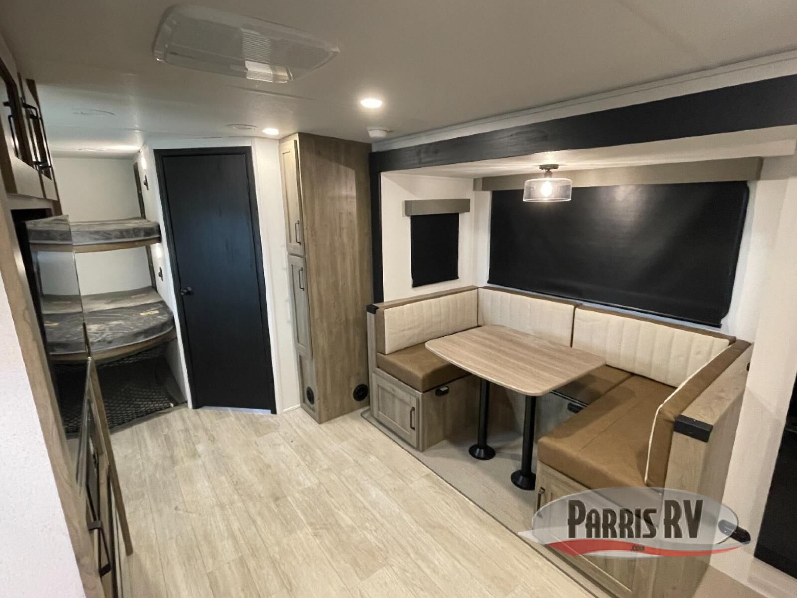 Your friends and family will love camping with you in this trailer that offers sleeping space for eight with the queen bed, the double-size bunks and the U-shaped dinette once it is easily set up for sleeping space. The cook will love the full kitchen with its cooktop, microwave, electric refrigerator plus hidden pantry behind the entertainment center. A full bath with a 30" x 36" shower will let you freshen up each day, and you'll love having your own space in the front private bedroom!