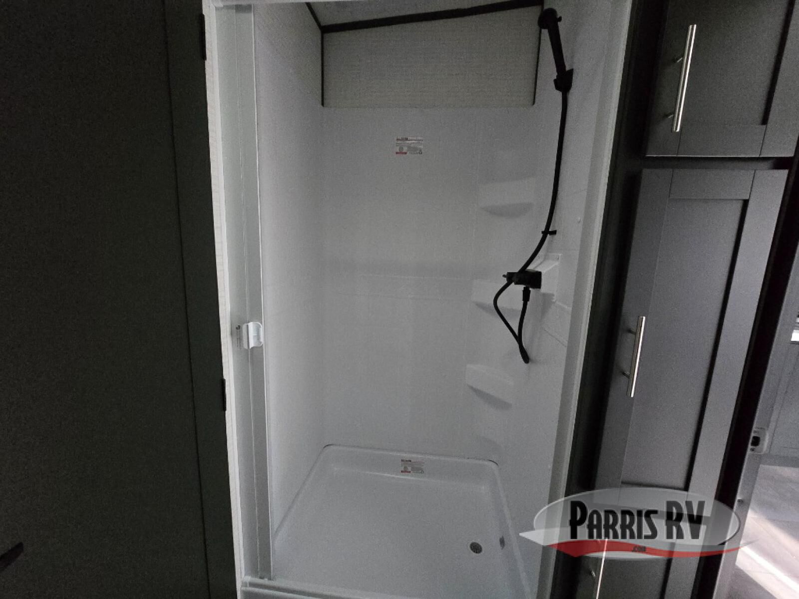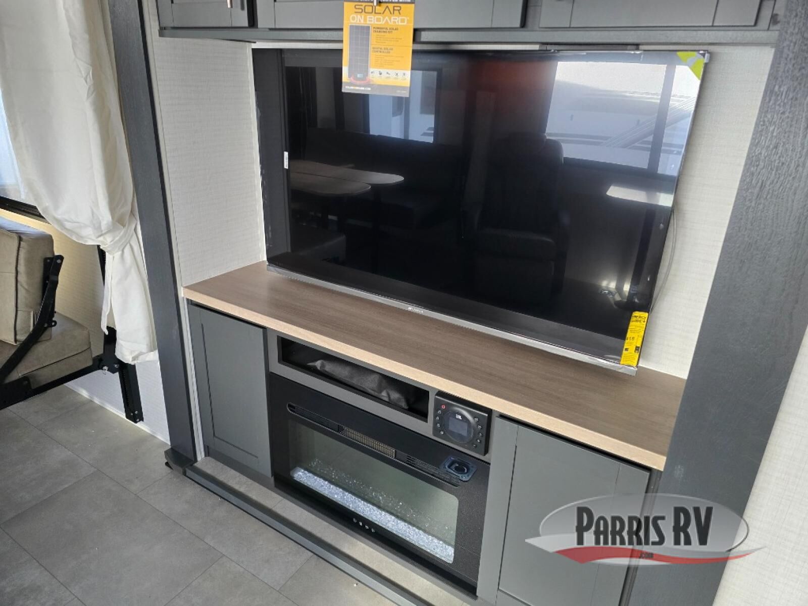 Are you looking for a travel trailer that can haul your favorite riding toys and still provide at-home comforts? This toy hauler is the one with 15' 1" total garage space, a front master bedroom with a king bed and dresser slide out, and a walk-through bath! The main living area also includes many comforts, like the dual lounge chairs, entertainment center slide out with a fireplace, and full kitchen. Your guests will find their beds on the electric pass-thru dinette or the drop-down electric bed!