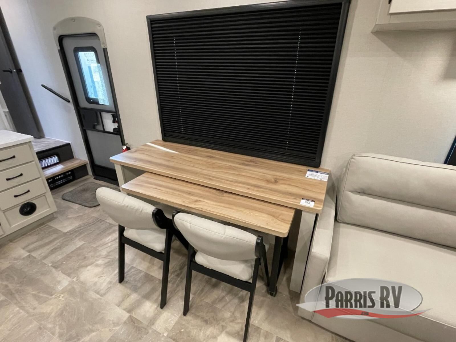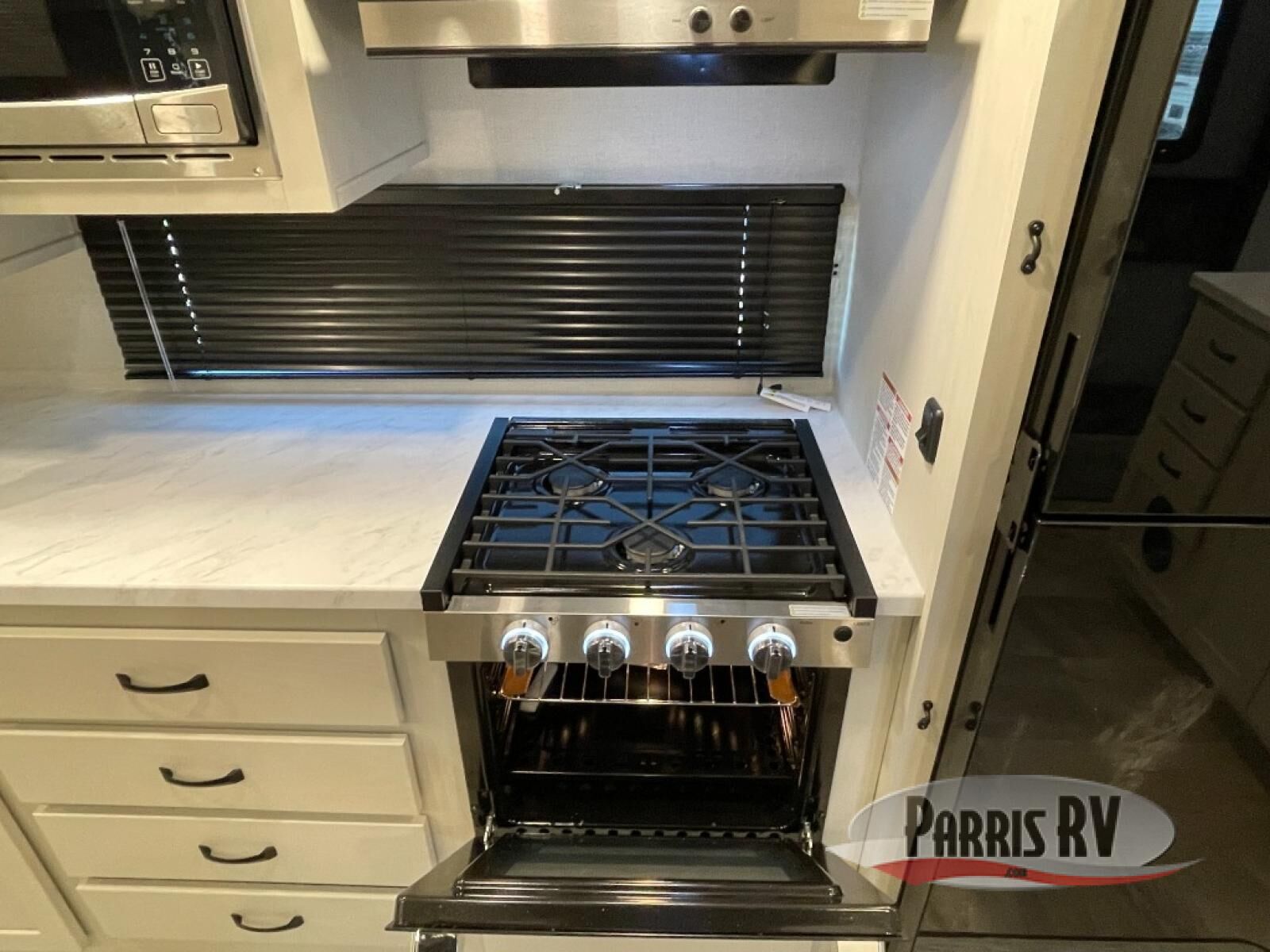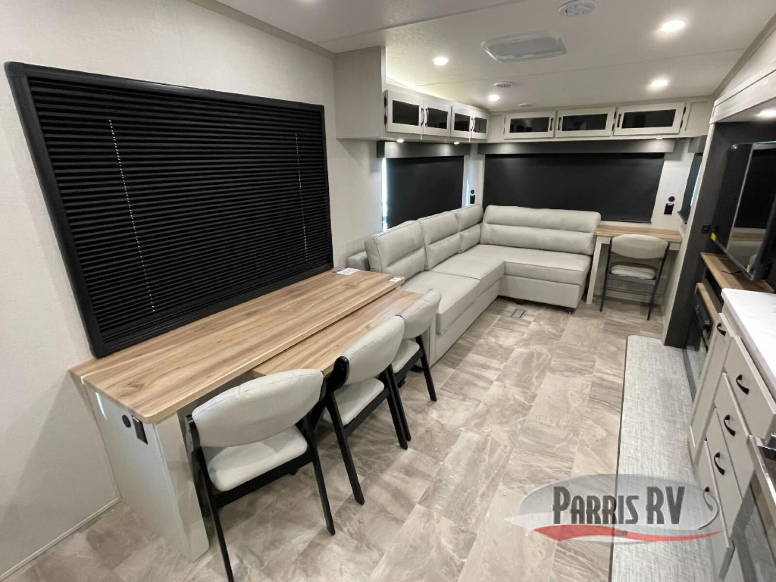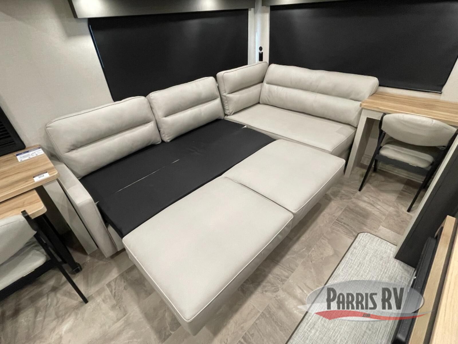 At the front of this unit, you'll find the inviting bedroom featuring a comfortable queen bed, perfect for relaxing after a day of adventure. On either side of the bed, convenient nightstands provide space for your essentials, while a slide-out houses a spacious wardrobe and linen closet, giving you plenty of room to store clothing and personal items. For added convenience, the bathroom offers dual entrances, one from the bedroom and another from the hallway, and includes a 34" x 34" radius shower plus a high-rise porcelain toilet with a foot flush. Moving toward the center and rear, the open living and kitchen area boasts a large slide-out that holds the entertainment center and a hidden swing-out pantry for storing dry goods. Here you'll also find stainless steel appliances, including a 10 cu. ft. refrigerator, a 21" stainless steel oven with a residential-size cooktop, and a microwave ensuring you can cook in comfort wherever you roam. Across from the kitchen sits the multi-functional slide/swivel table near a table-height fixed bar that opens to the outdoors, complete with a flip-up atrium-style window that creates a unique bar area. At the rear, the cozy J-Lounge with a hide-a-bed sofa offers versatile seating and an additional sleeping space, making this layout as functional as it is comfortable.