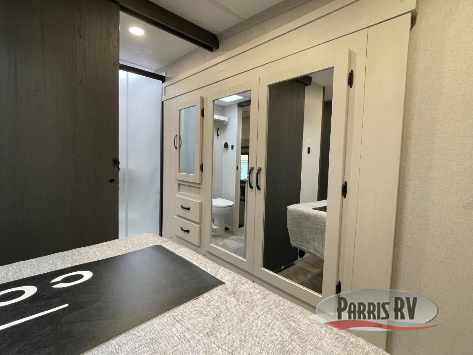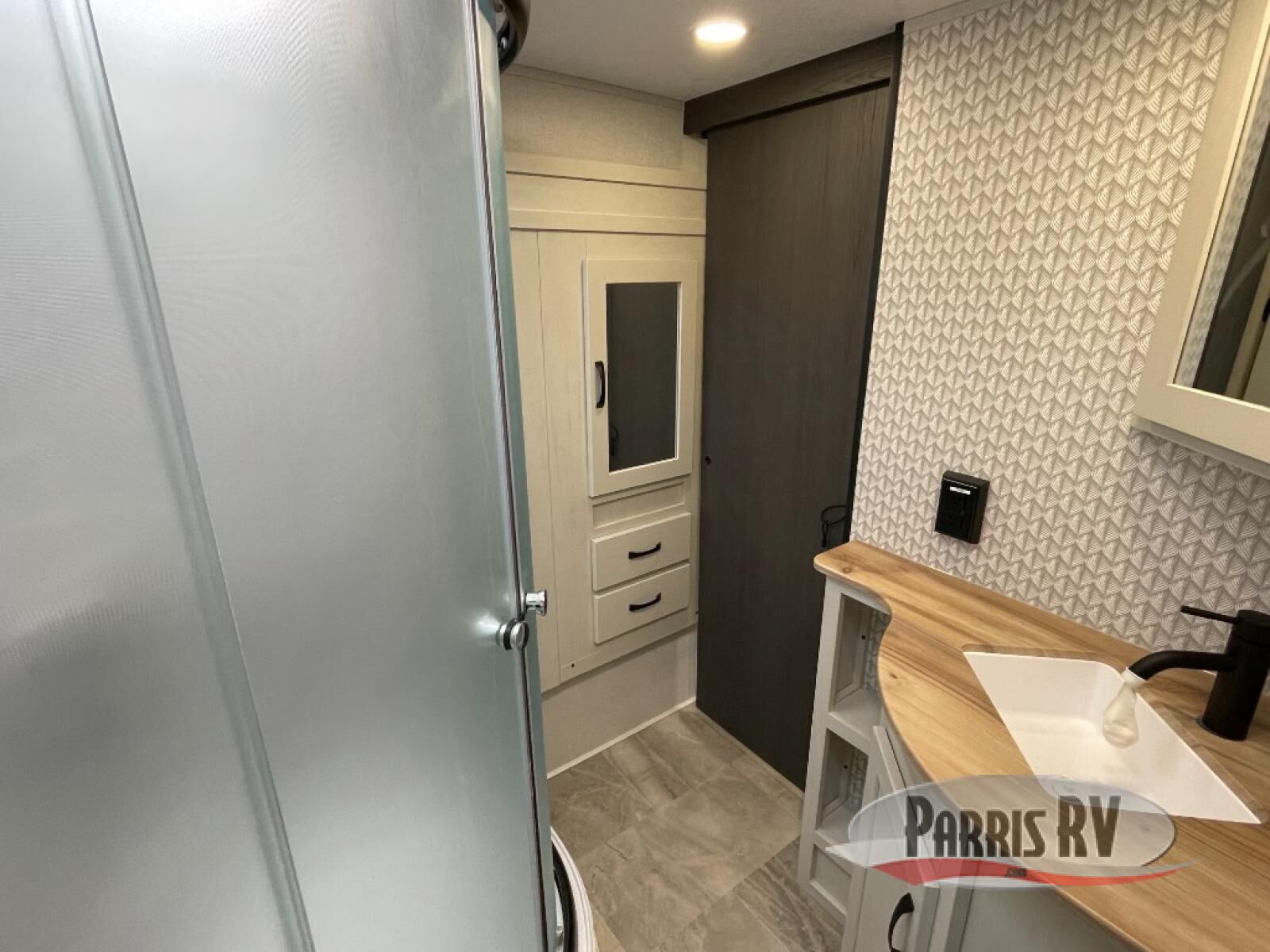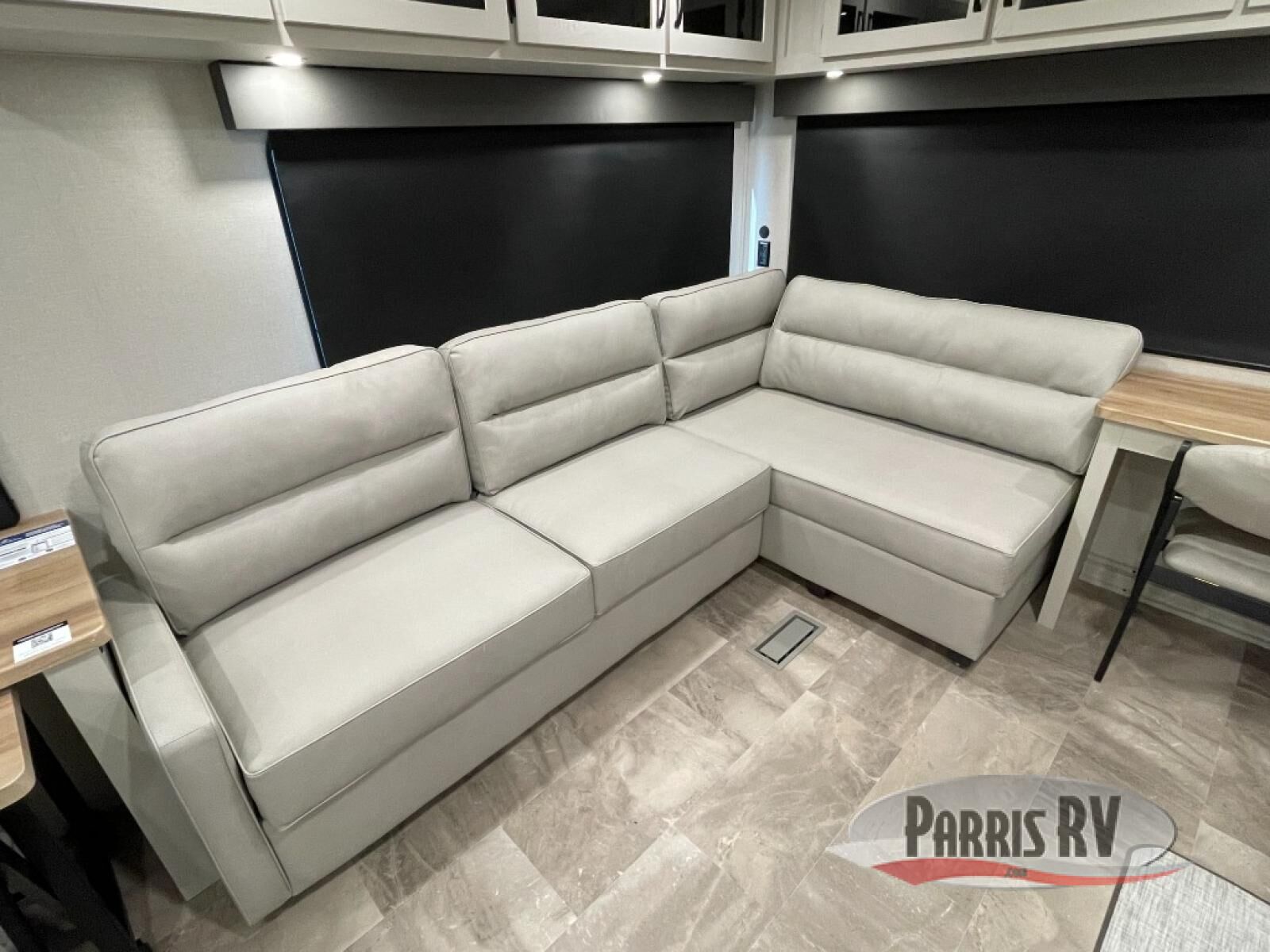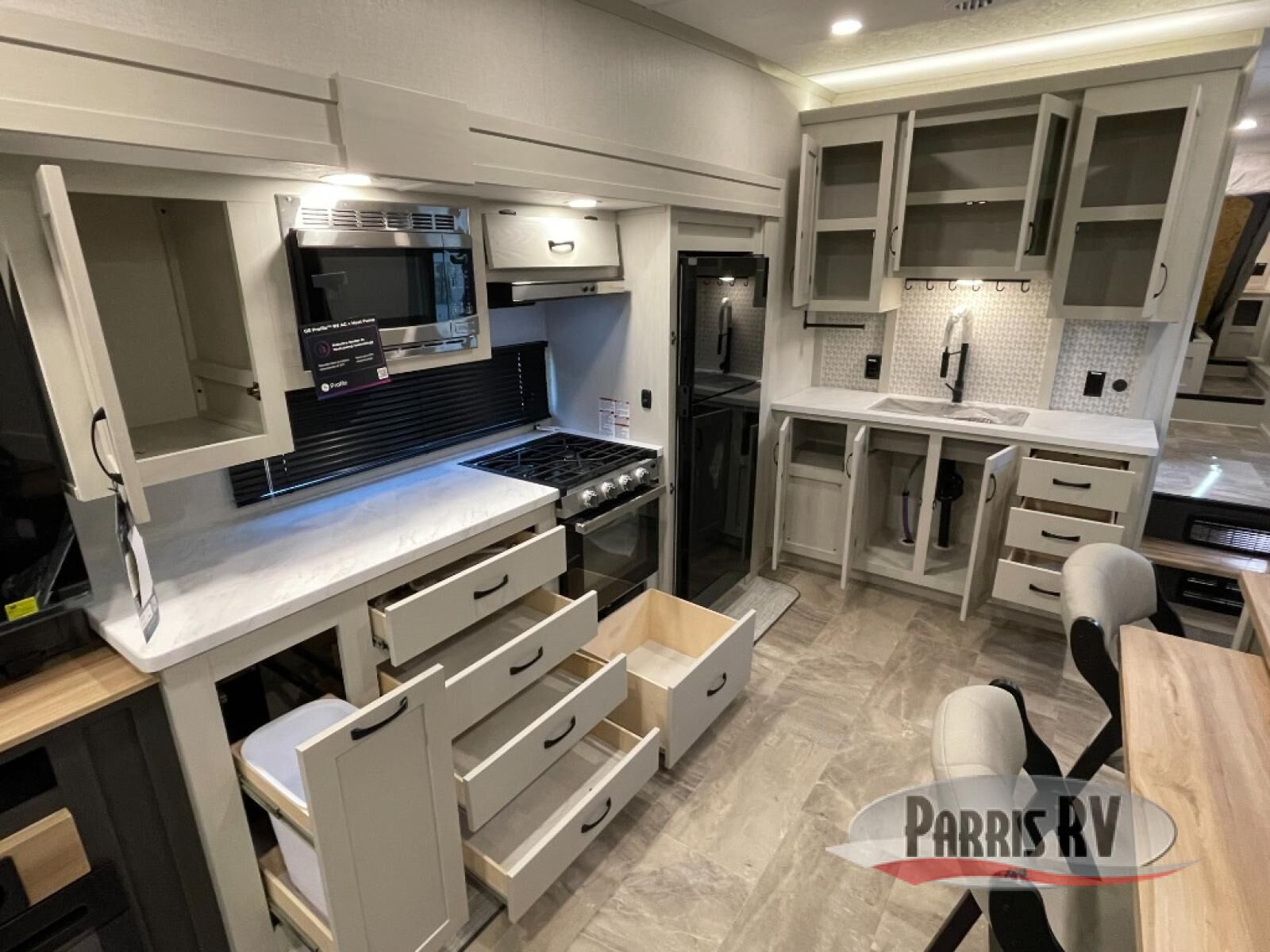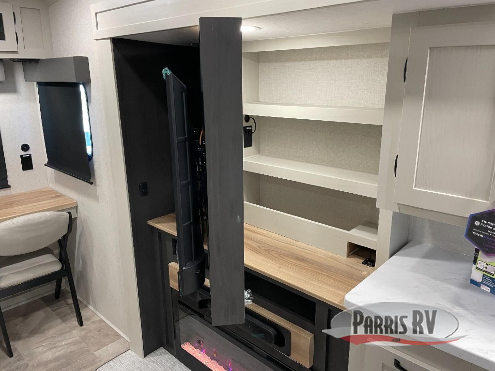 At the front of this unit, you'll find the inviting bedroom featuring a comfortable queen bed, perfect for relaxing after a day of adventure. On either side of the bed, convenient nightstands provide space for your essentials, while a slide-out houses a spacious wardrobe and linen closet, giving you plenty of room to store clothing and personal items. For added convenience, the bathroom offers dual entrances, one from the bedroom and another from the hallway, and includes a 34" x 34" radius shower plus a high-rise porcelain toilet with a foot flush. Moving toward the center and rear, the open living and kitchen area boasts a large slide-out that holds the entertainment center and a hidden swing-out pantry for storing dry goods. Here you'll also find stainless steel appliances, including a 10 cu. ft. refrigerator, a 21" stainless steel oven with a residential-size cooktop, and a microwave ensuring you can cook in comfort wherever you roam. Across from the kitchen sits the multi-functional slide/swivel table near a table-height fixed bar that opens to the outdoors, complete with a flip-up atrium-style window that creates a unique bar area. At the rear, the cozy J-Lounge with a hide-a-bed sofa offers versatile seating and an additional sleeping space, making this layout as functional as it is comfortable.