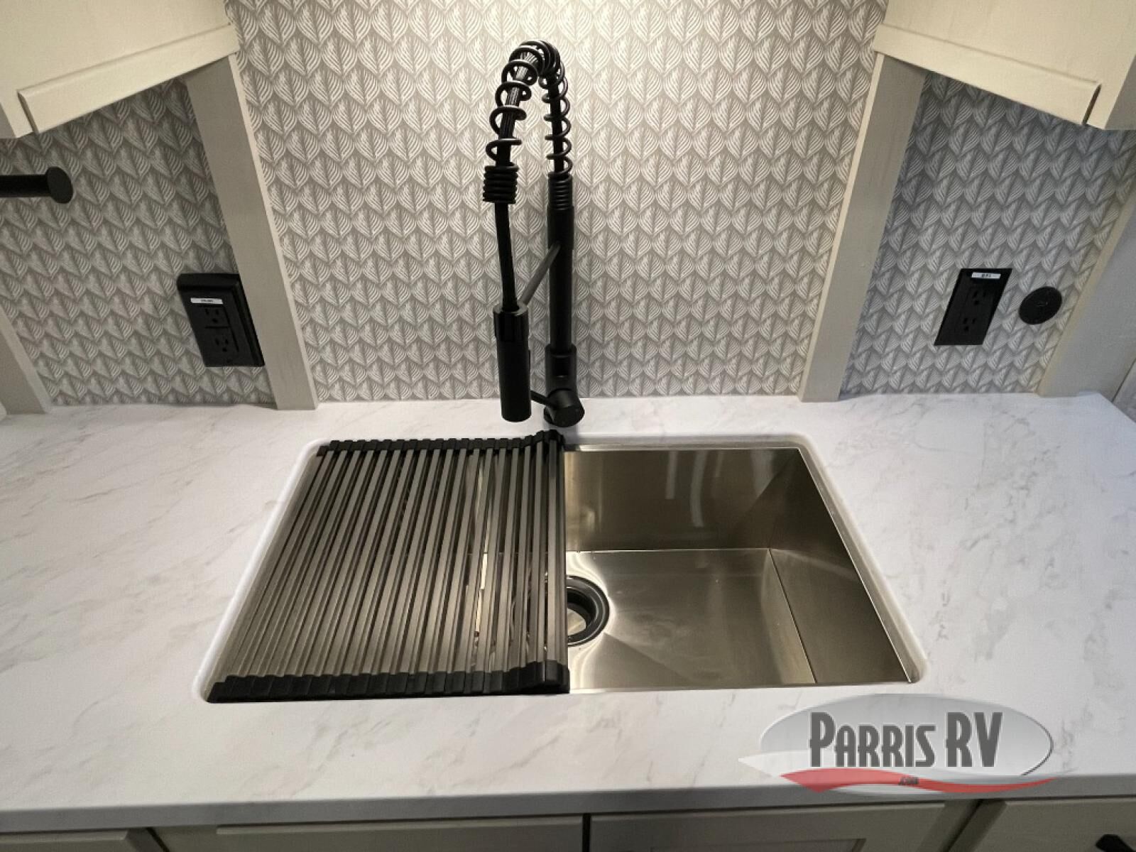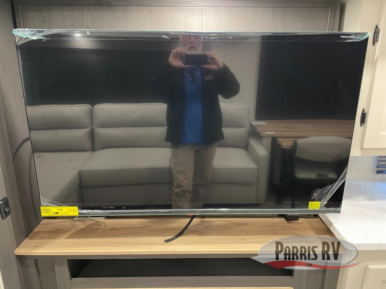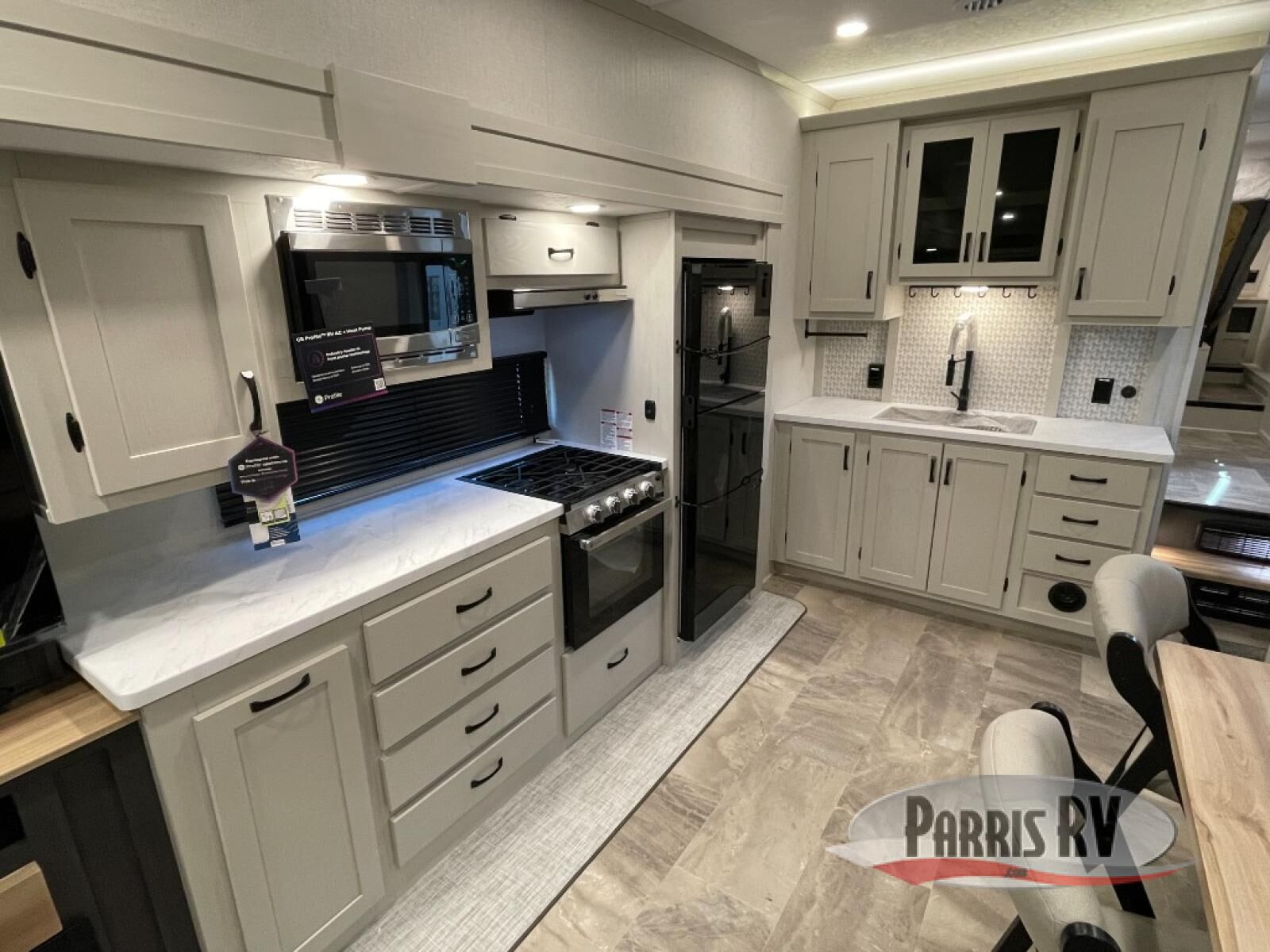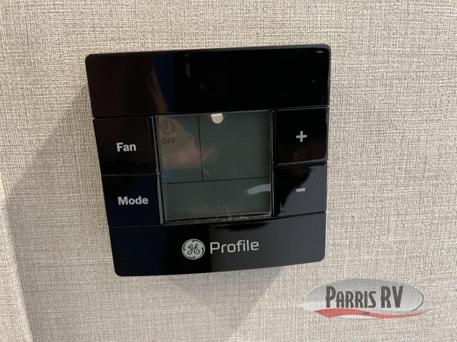 At the front of this unit, you'll find the inviting bedroom featuring a comfortable queen bed, perfect for relaxing after a day of adventure. On either side of the bed, convenient nightstands provide space for your essentials, while a slide-out houses a spacious wardrobe and linen closet, giving you plenty of room to store clothing and personal items. For added convenience, the bathroom offers dual entrances, one from the bedroom and another from the hallway, and includes a 34" x 34" radius shower plus a high-rise porcelain toilet with a foot flush. Moving toward the center and rear, the open living and kitchen area boasts a large slide-out that holds the entertainment center and a hidden swing-out pantry for storing dry goods. Here you'll also find stainless steel appliances, including a 10 cu. ft. refrigerator, a 21" stainless steel oven with a residential-size cooktop, and a microwave ensuring you can cook in comfort wherever you roam. Across from the kitchen sits the multi-functional slide/swivel table near a table-height fixed bar that opens to the outdoors, complete with a flip-up atrium-style window that creates a unique bar area. At the rear, the cozy J-Lounge with a hide-a-bed sofa offers versatile seating and an additional sleeping space, making this layout as functional as it is comfortable.