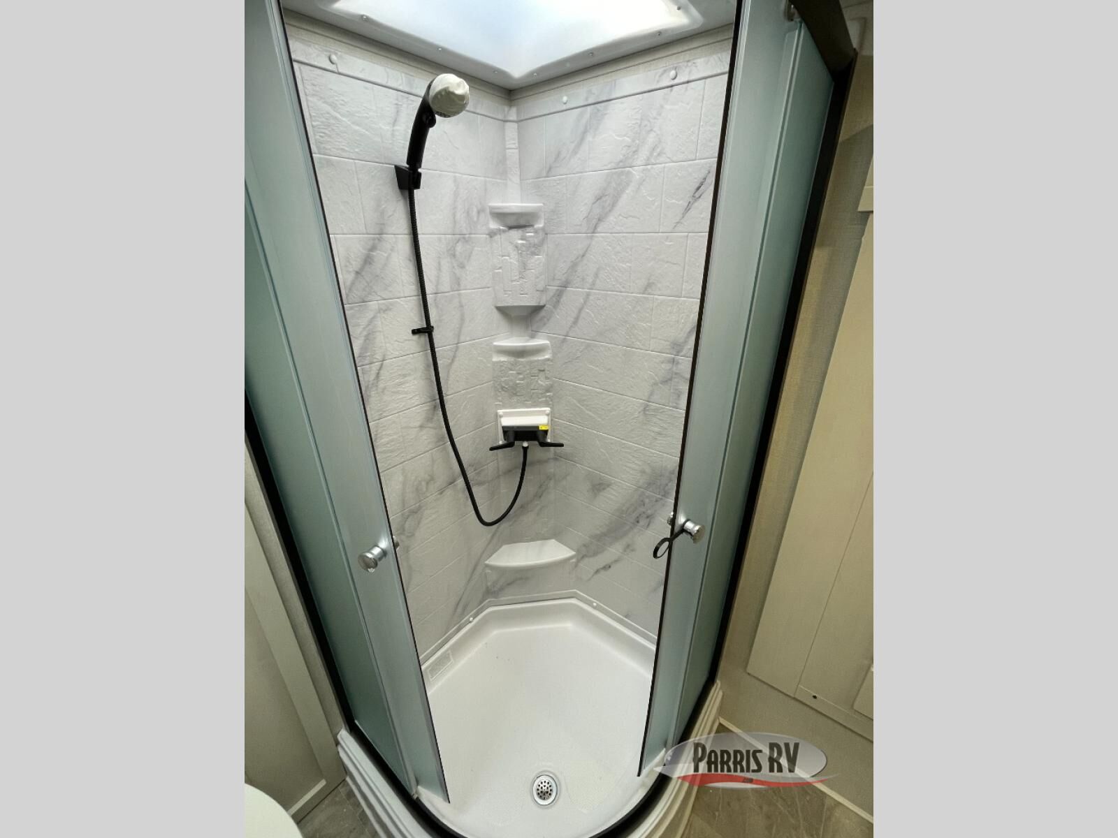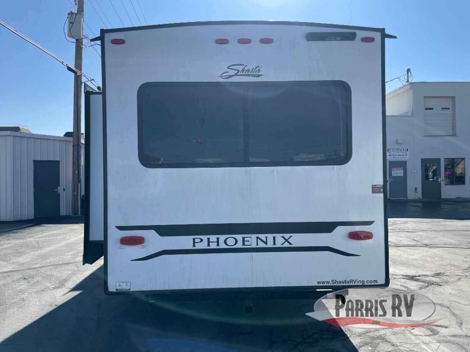 Stand out from all the others with one of these Shasta RVs Phoenix Lite fifth wheels! They are constructed with Weather Shield+ technology, dual-sided Azdel composite sidewall panels, and Tri-Tex powder coated frame technology that is ultra weather resistant. There are also electric front jacks and electric rear stabilizer jacks, an electric awning with LED light strip and one hand pitch adjustment, and a roof mounted solar panel within the Solar Source+ Package. The interior includes USB charging ports, slow rise blackout roller night shades, and a large transom window in the kitchen. You will also enjoy the upgraded GE 13,500 BTU dual ducted main A/C to keep you comfortable throughout your fifth wheel, plus an upgraded 60K BTU on-demand water heater for endless hot showers!