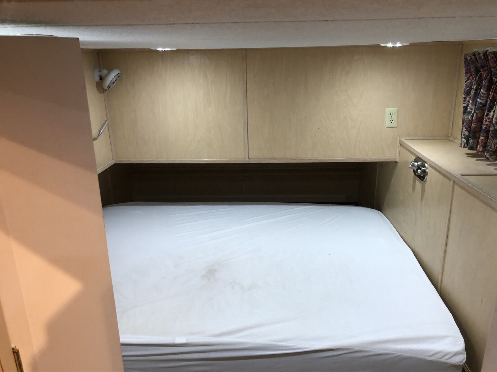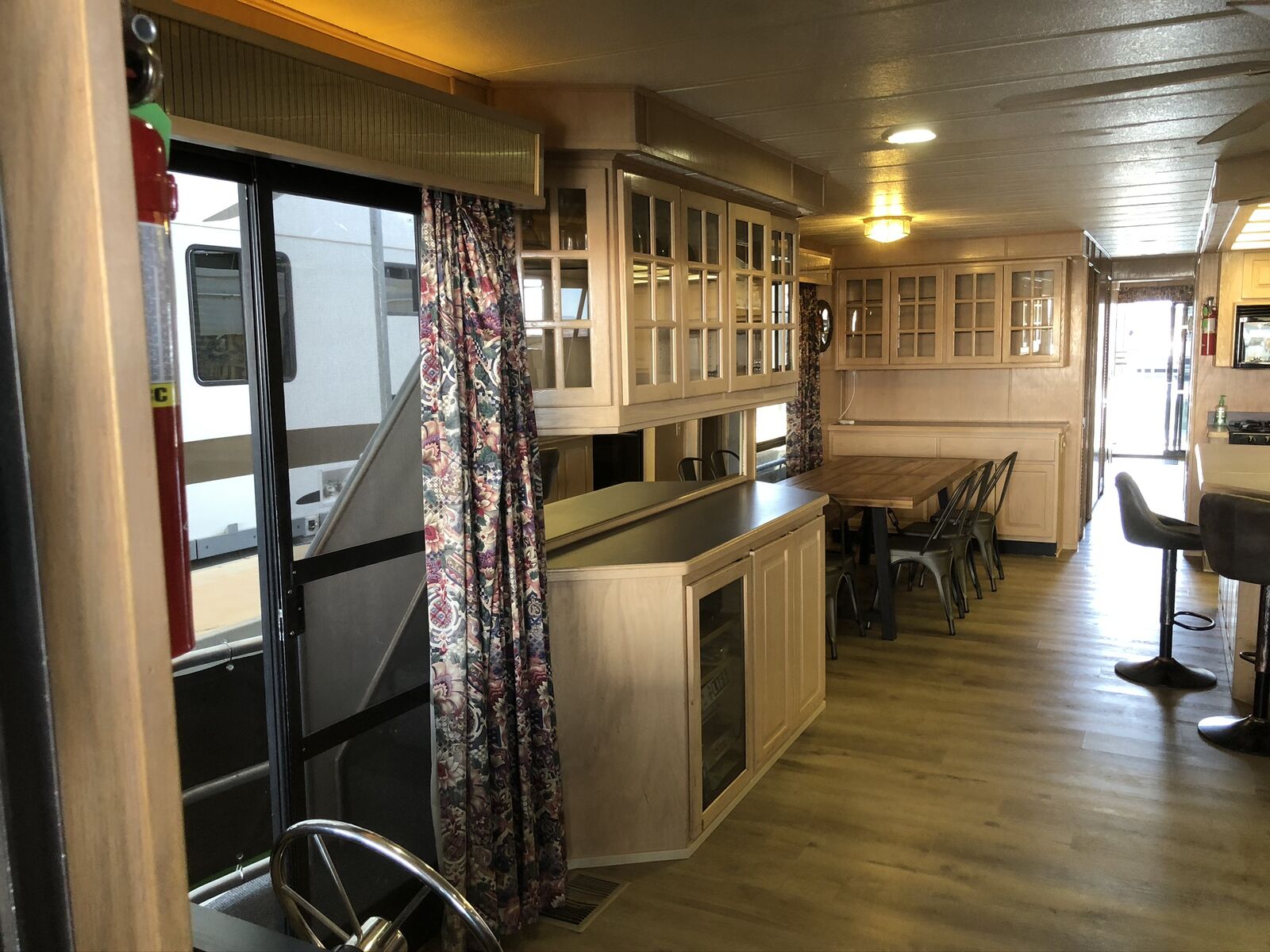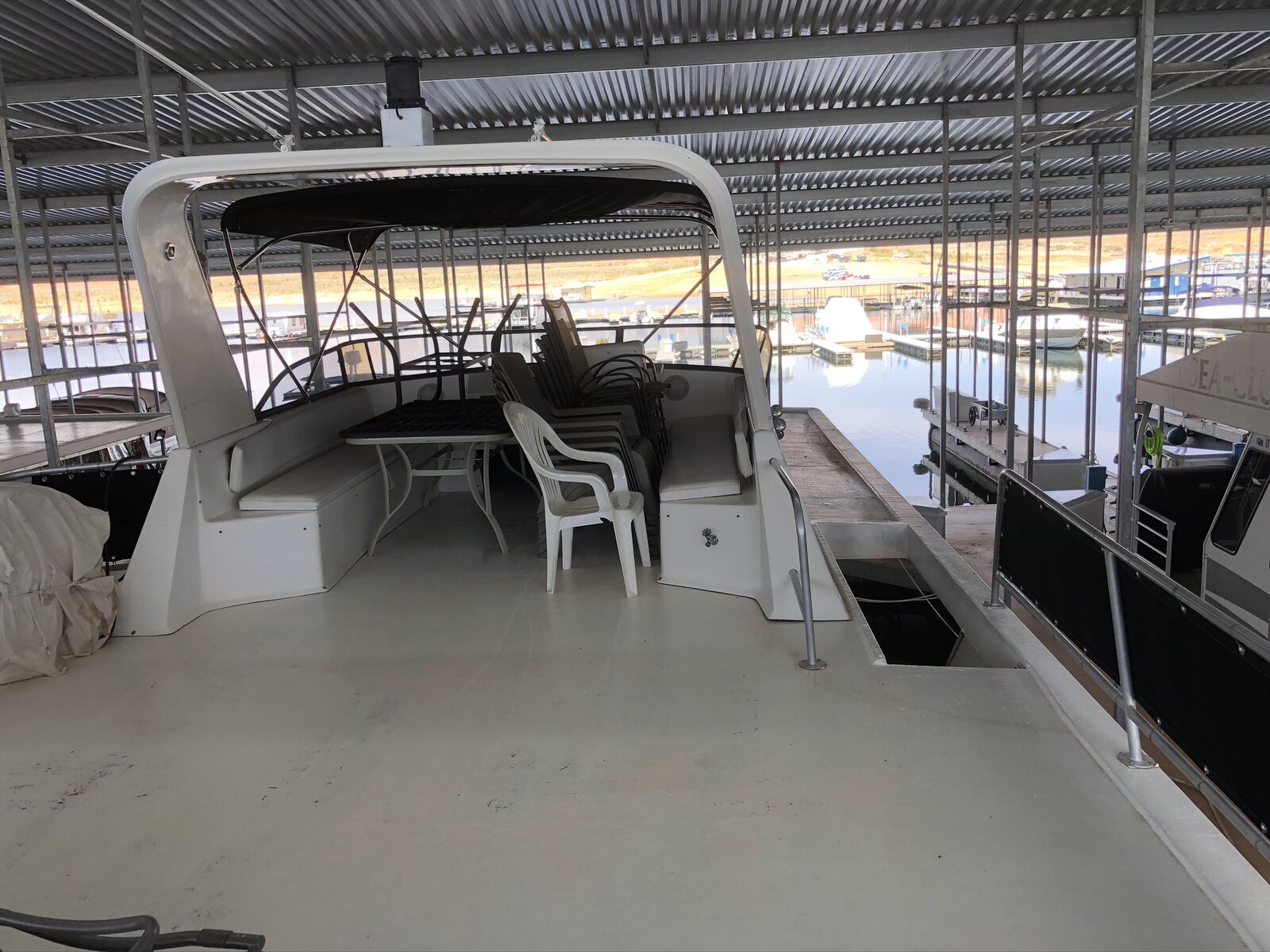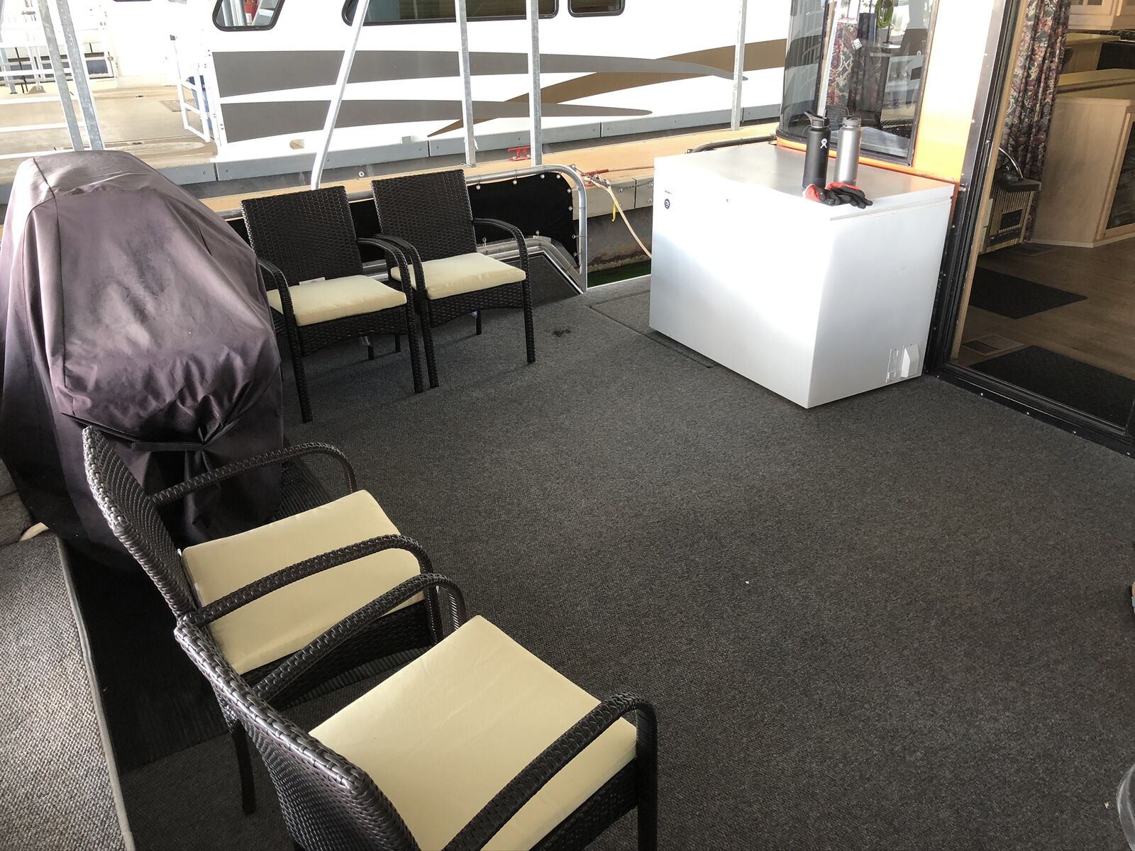Accommodations One master suite with King bed and three private suites with Queen beds Queen Sofa-Sleeper in Front Salon Deluxe Accommodations for 10 (Sleeping Accommodations for 18 Adults using upper deck pads) Two full bathrooms each with head and shower Complete Galley with Service for 12 including Coffee maker/Toaster/Blender Custom Cabinets and Tile Flooring in Galley Full-Size Range & Oven Microwave, Dishwasher & Trash Compactor operating full time off inverted battery system Full size Refrigerator/Freezer with Ice-Maker in Galley installed in 2006 operating full time off inverted battery system Full-Size Chest Freezer on Front Deck operating full time off inverted battery system Ice Maker Custom Designed Interior with Complete Furnishings with Custom Drapery and Tinted Windows Full LVT Inside Cabin Central Air Conditioning CD Stereo System with 6 CD Exchanger and speakers with control throughout the boat and on the upper deck. Custom Entertainment Center with 27 TV Upper Deck Stationary Canopy with Dimable Rope Lighting Upper & Lower Safety Rails & Canvas Rear Deck Slippery Slide with Water Pump Jet-Ski Davit & Hoist with 950 lb capacity Outdoor Patio & Deck Furnishings with Tables/Chairs/Lounge Chairs on upper deck Front Deck Bar-B-Que Grill, Tank & Accessories Full 3 foot Extended Swim Platform Swim Ladder & Boarding Ramps Internally wired 12 volt Carbon Monoxide Detection System Below Deck Storage 12 Solar panels to charge batteries