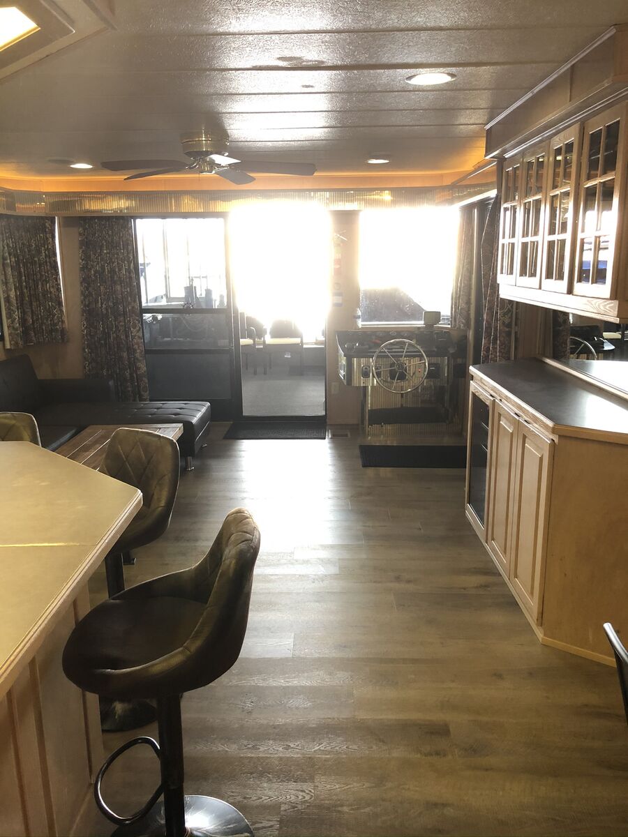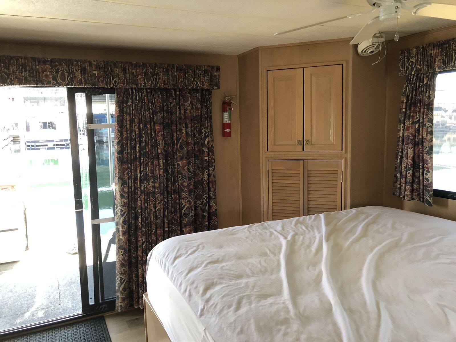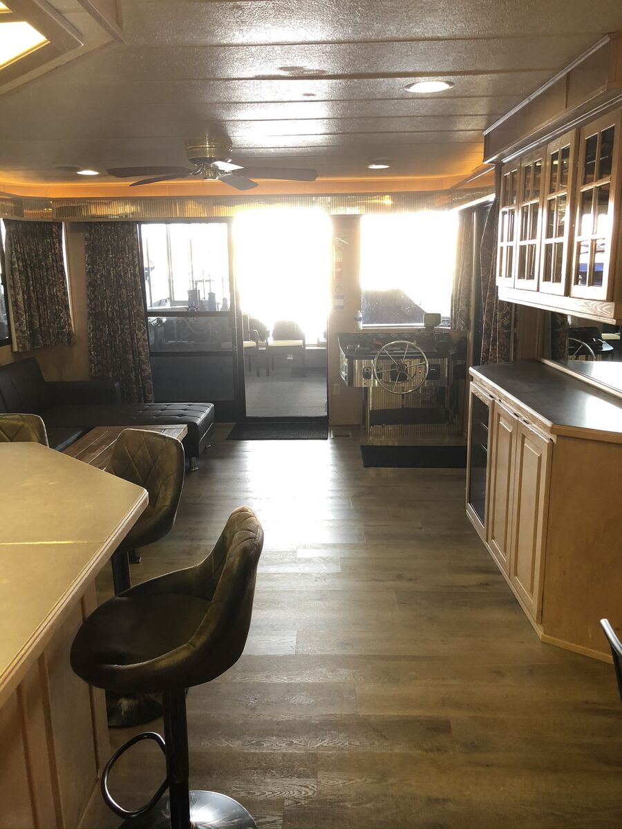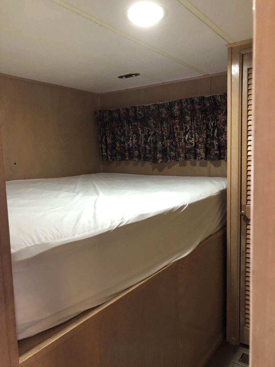 Accommodations One master suite with King bed and three private suites with Queen beds Queen Sofa-Sleeper in Front Salon Deluxe Accommodations for 10 (Sleeping Accommodations for 18 Adults using upper deck pads) Two full bathrooms each with head and shower Complete Galley with Service for 12 including Coffee maker/Toaster/Blender Custom Cabinets and Tile Flooring in Galley Full-Size Range & Oven Microwave, Dishwasher & Trash Compactor operating full time off inverted battery system Full size Refrigerator/Freezer with Ice-Maker in Galley installed in 2006 operating full time off inverted battery system Full-Size Chest Freezer on Front Deck operating full time off inverted battery system Ice Maker Custom Designed Interior with Complete Furnishings with Custom Drapery and Tinted Windows Full LVT Inside Cabin Central Air Conditioning CD Stereo System with 6 CD Exchanger and speakers with control throughout the boat and on the upper deck. Custom Entertainment Center with 27 TV Upper Deck Stationary Canopy with Dimable Rope Lighting Upper & Lower Safety Rails & Canvas Rear Deck Slippery Slide with Water Pump Jet-Ski Davit & Hoist with 950 lb capacity Outdoor Patio & Deck Furnishings with Tables/Chairs/Lounge Chairs on upper deck Front Deck Bar-B-Que Grill, Tank & Accessories Full 3 foot Extended Swim Platform Swim Ladder & Boarding Ramps Internally wired 12 volt Carbon Monoxide Detection System Below Deck Storage 12 Solar panels to charge batteries
