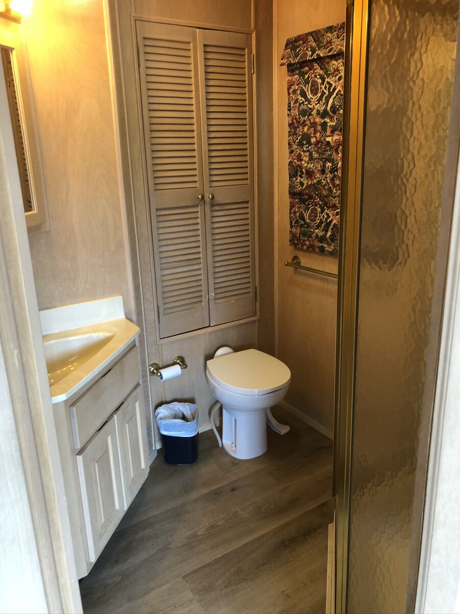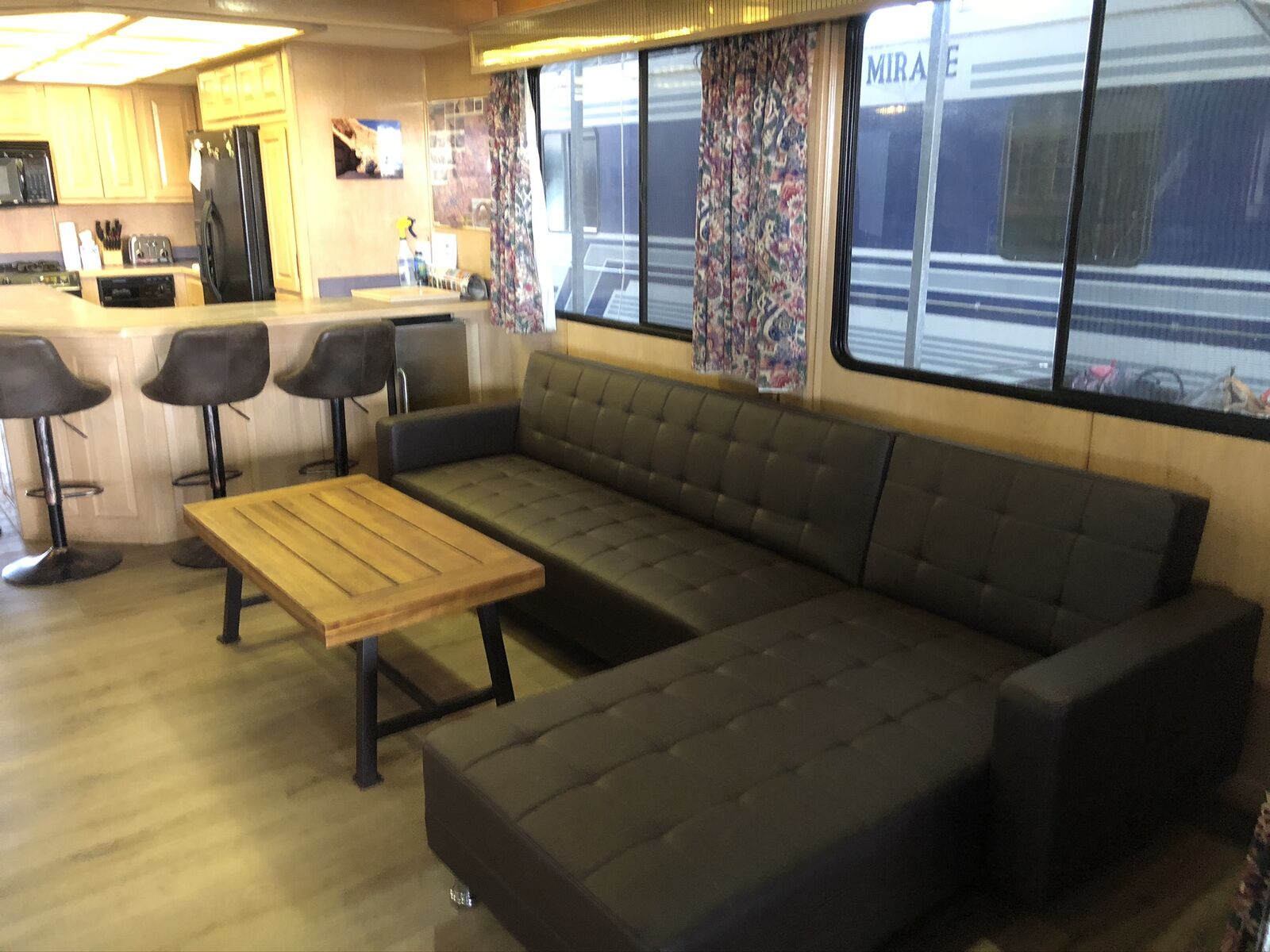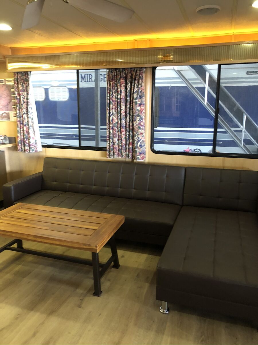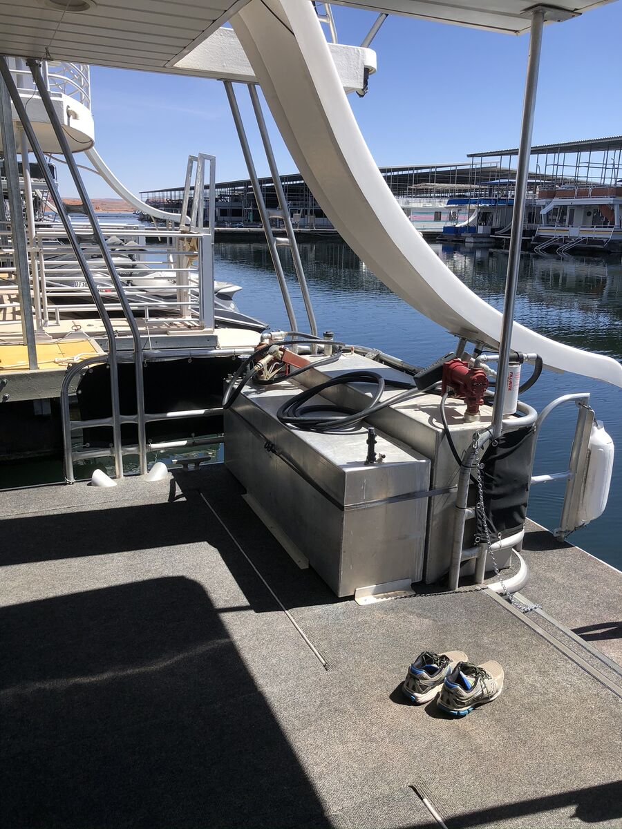 Accommodations One master suite with King bed and three private suites with Queen beds Queen Sofa-Sleeper in Front Salon Deluxe Accommodations for 10 (Sleeping Accommodations for 18 Adults using upper deck pads) Two full bathrooms each with head and shower Complete Galley with Service for 12 including Coffee maker/Toaster/Blender Custom Cabinets and Tile Flooring in Galley Full-Size Range & Oven Microwave, Dishwasher & Trash Compactor operating full time off inverted battery system Full size Refrigerator/Freezer with Ice-Maker in Galley installed in 2006 operating full time off inverted battery system Full-Size Chest Freezer on Front Deck operating full time off inverted battery system Ice Maker Custom Designed Interior with Complete Furnishings with Custom Drapery and Tinted Windows Full LVT Inside Cabin Central Air Conditioning CD Stereo System with 6 CD Exchanger and speakers with control throughout the boat and on the upper deck. Custom Entertainment Center with 27 TV Upper Deck Stationary Canopy with Dimable Rope Lighting Upper & Lower Safety Rails & Canvas Rear Deck Slippery Slide with Water Pump Jet-Ski Davit & Hoist with 950 lb capacity Outdoor Patio & Deck Furnishings with Tables/Chairs/Lounge Chairs on upper deck Front Deck Bar-B-Que Grill, Tank & Accessories Full 3 foot Extended Swim Platform Swim Ladder & Boarding Ramps Internally wired 12 volt Carbon Monoxide Detection System Below Deck Storage 12 Solar panels to charge batteries