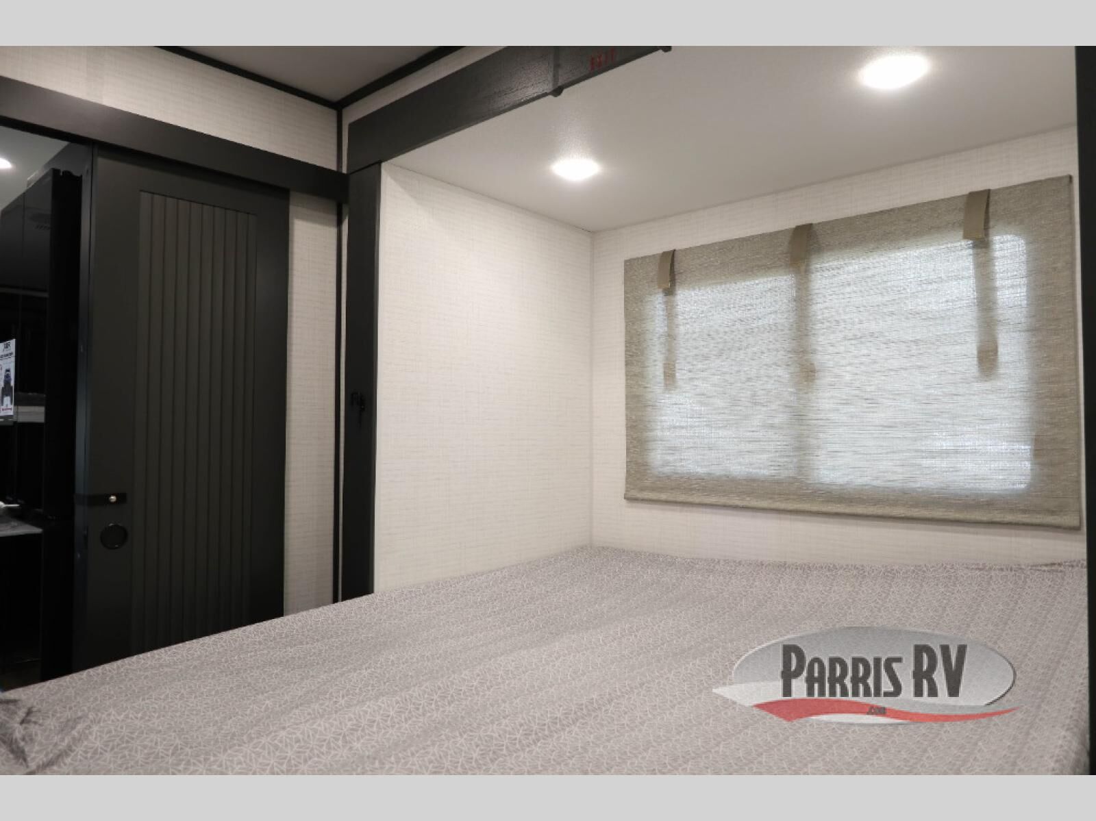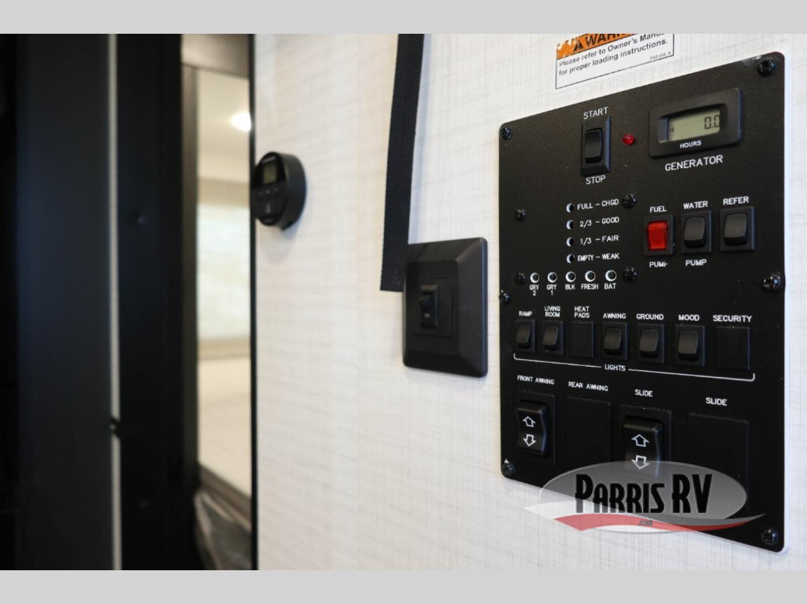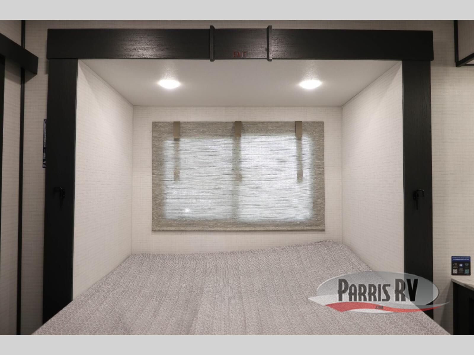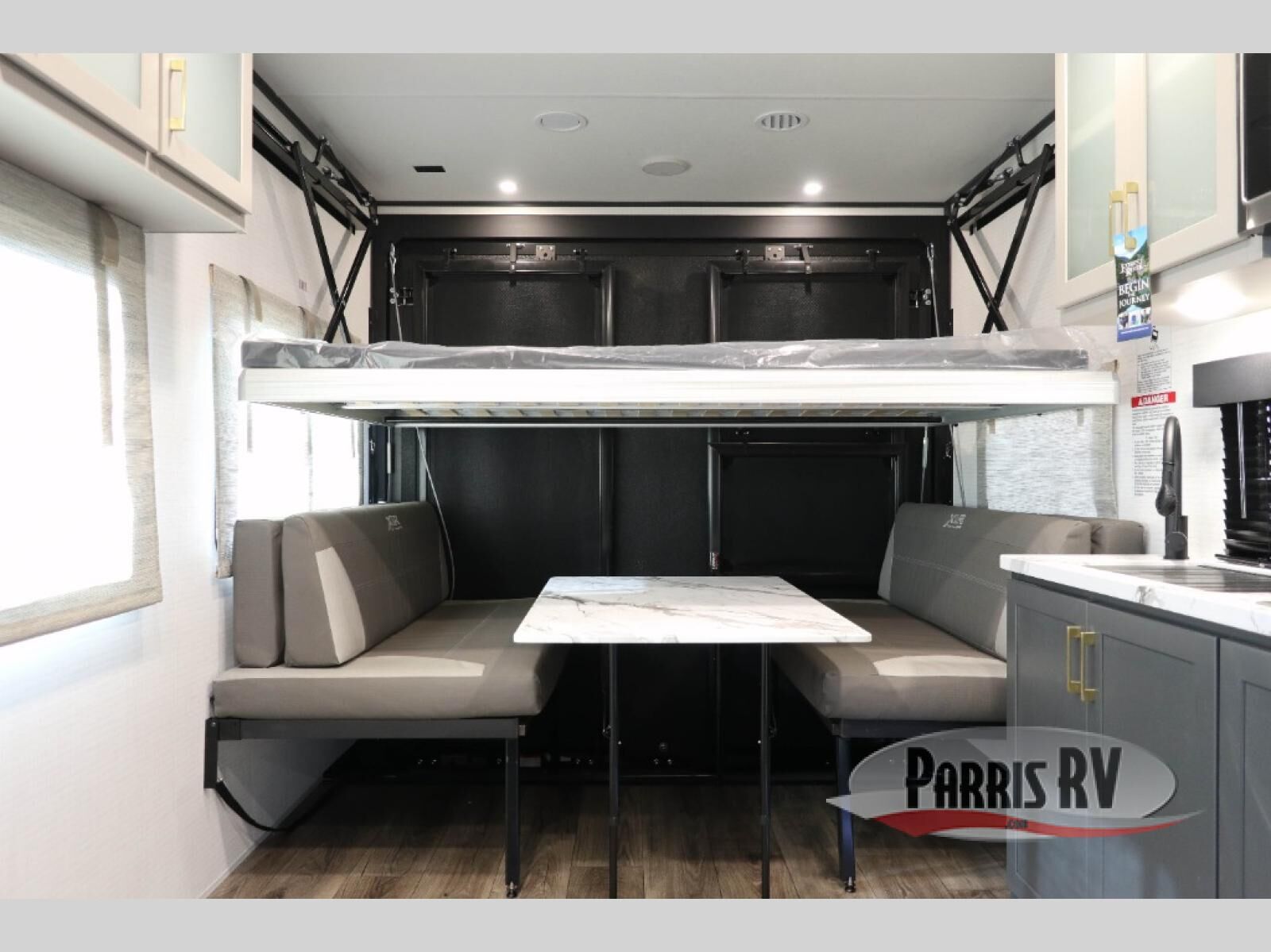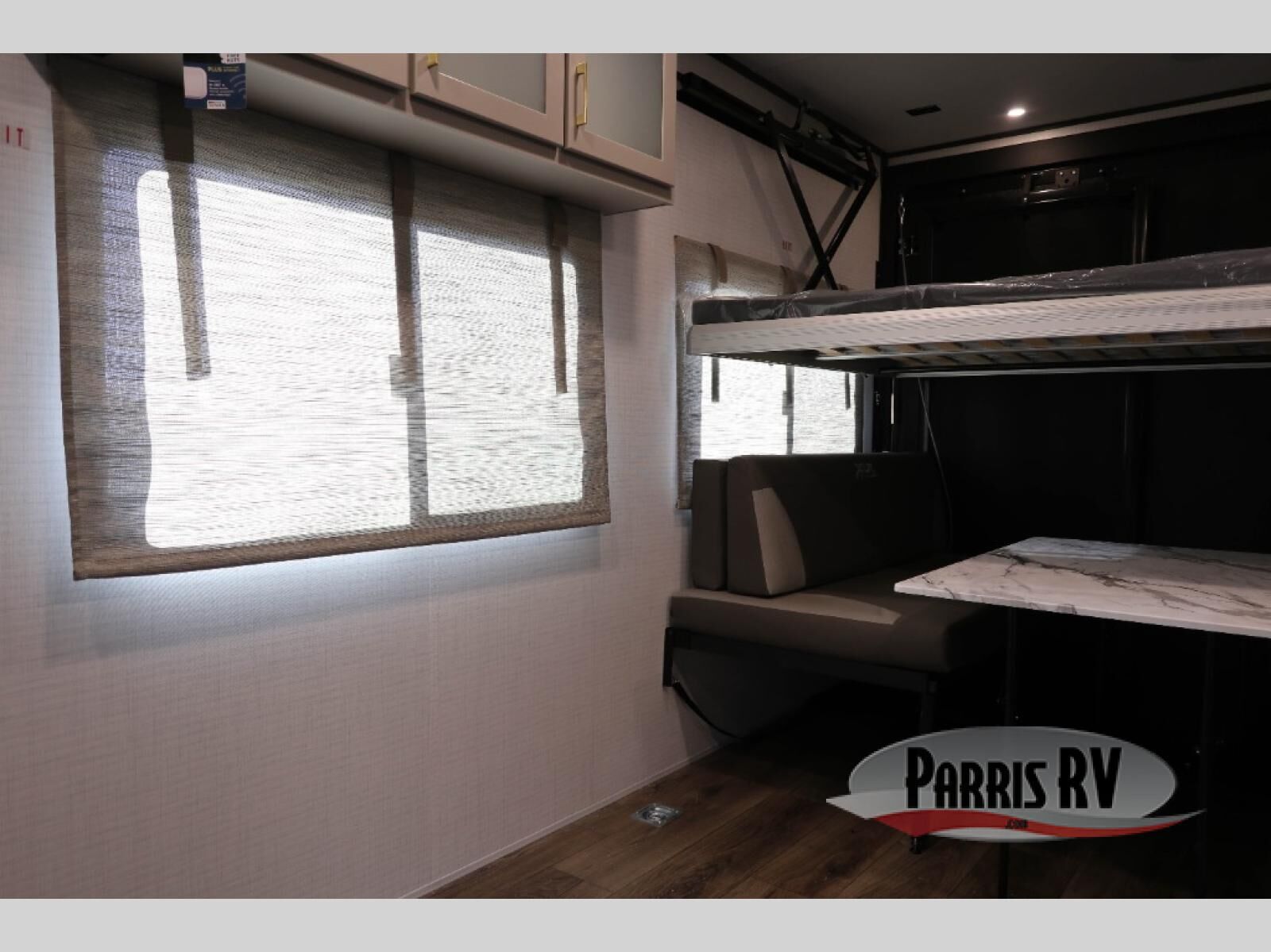 Bring your favorite off-road toys with you in this toy hauler to your favorite camping spots! The 14' garage includes opposing sofa sleepers with a removable dinette table to create a queen bed sleeping area, plus a Euro bed above for your guests to sleep on. The front of this toy hauler is shared with the master bedroom and dual entry bath you are sure to love, pus there is a dresser with a mirror to get ready each day. The exterior has many features you will love like the docking station, outside TV prep area, 15' power awning, and the outside storage areas!