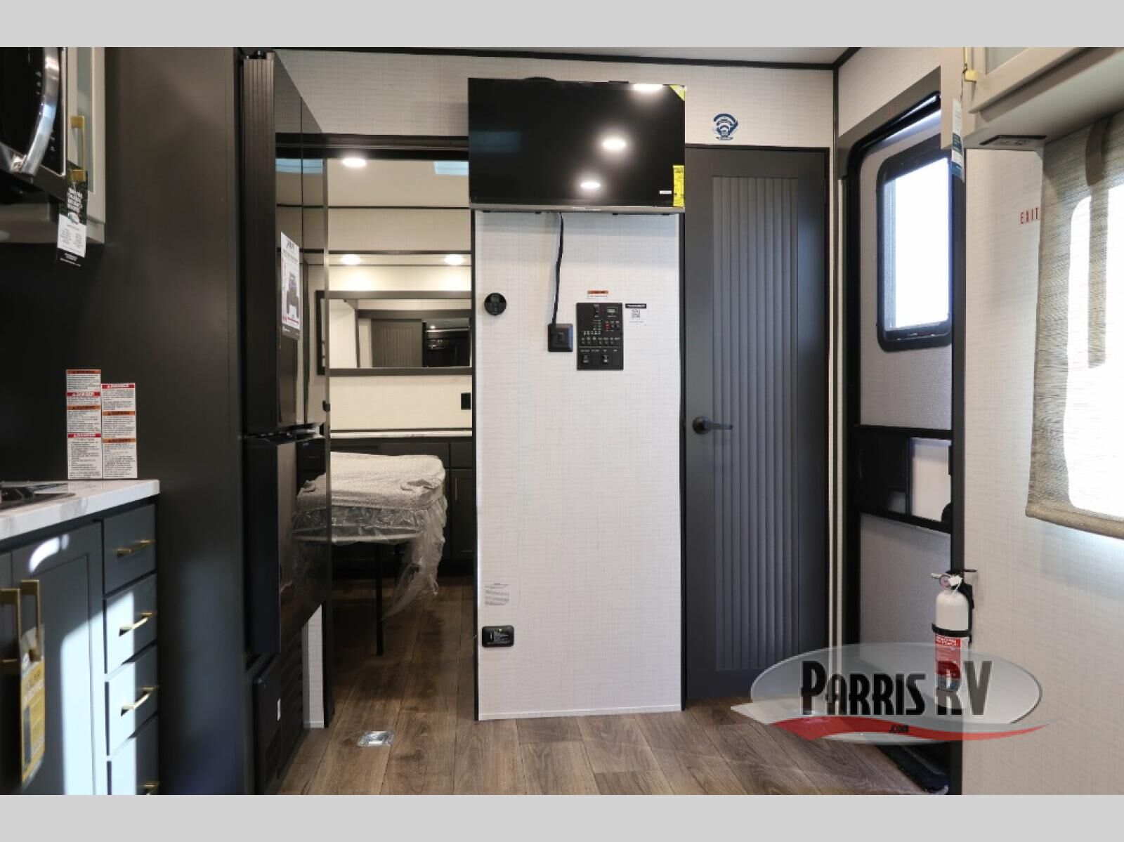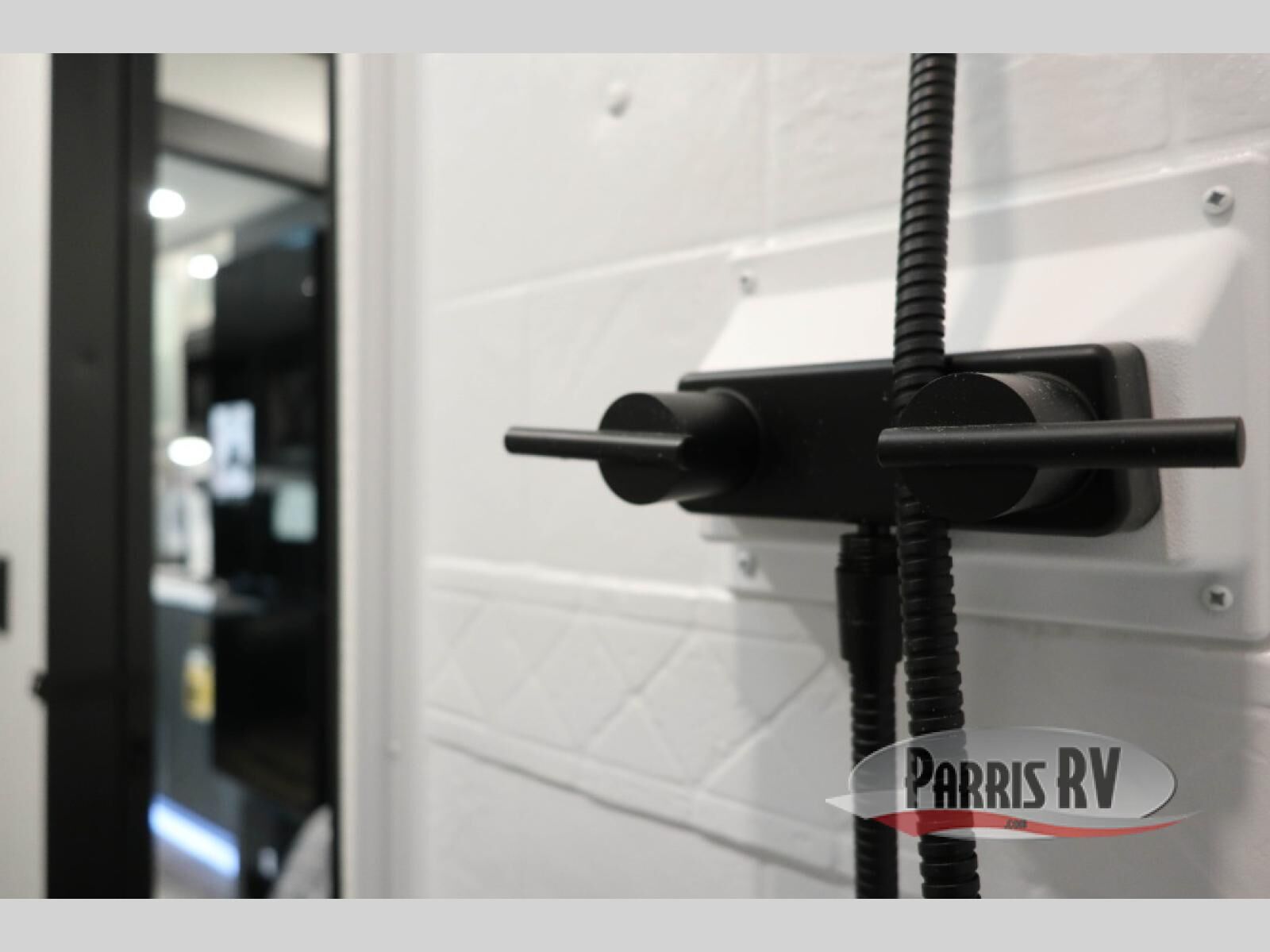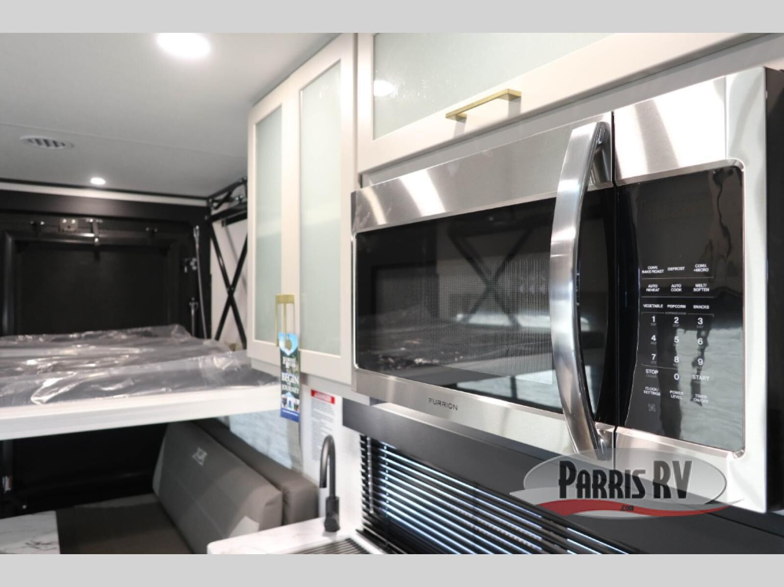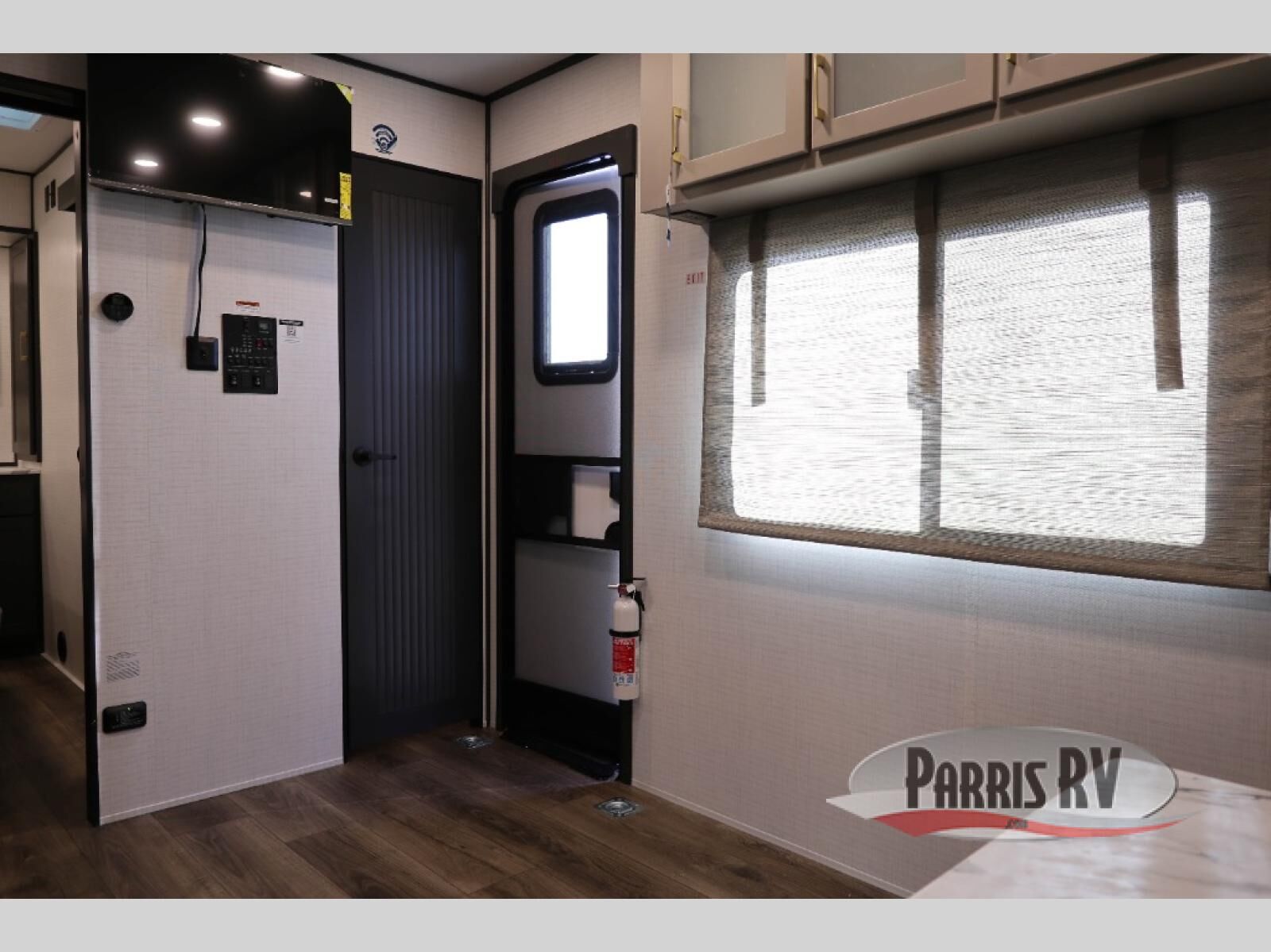 Bring your favorite off-road toys with you in this toy hauler to your favorite camping spots! The 14' garage includes opposing sofa sleepers with a removable dinette table to create a queen bed sleeping area, plus a Euro bed above for your guests to sleep on. The front of this toy hauler is shared with the master bedroom and dual entry bath you are sure to love, pus there is a dresser with a mirror to get ready each day. The exterior has many features you will love like the docking station, outside TV prep area, 15' power awning, and the outside storage areas!