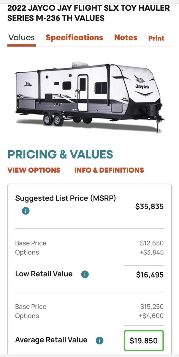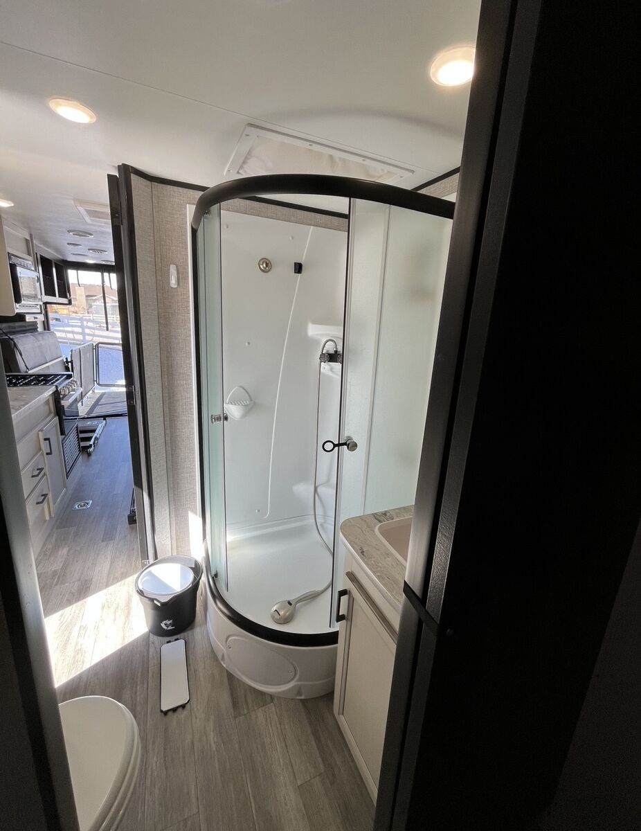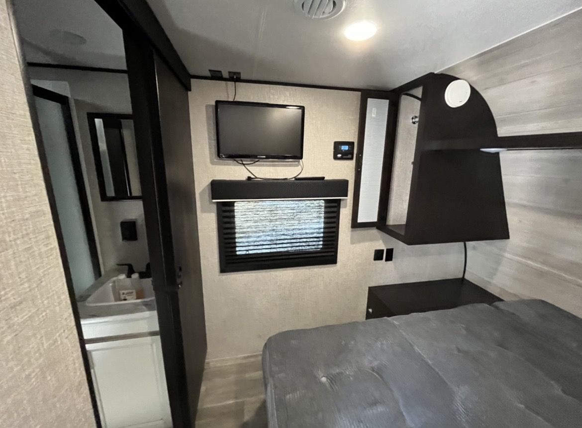 Toy hauler, one owner, clean clear title. Has factory upgraded 15,000 btu air conditioner, back up cam, 700 watts of solar, max air vent cover, upgraded to a Dometic porcelain toilet ($400 bucks), factory solar package, roof sealed with eternabond, and has upgraded aluminum rims with Goodyear radial tires. No smoking, no pets ever in this trailer. For more info message me. Asking $16,000 obo. I also have an Ecoflow Delta Pro that can go with it (for $500). Tks 4 looking! Great boondocking trailer. Also, the motorcycle chock can be removed (it’s a quick disconnect).
