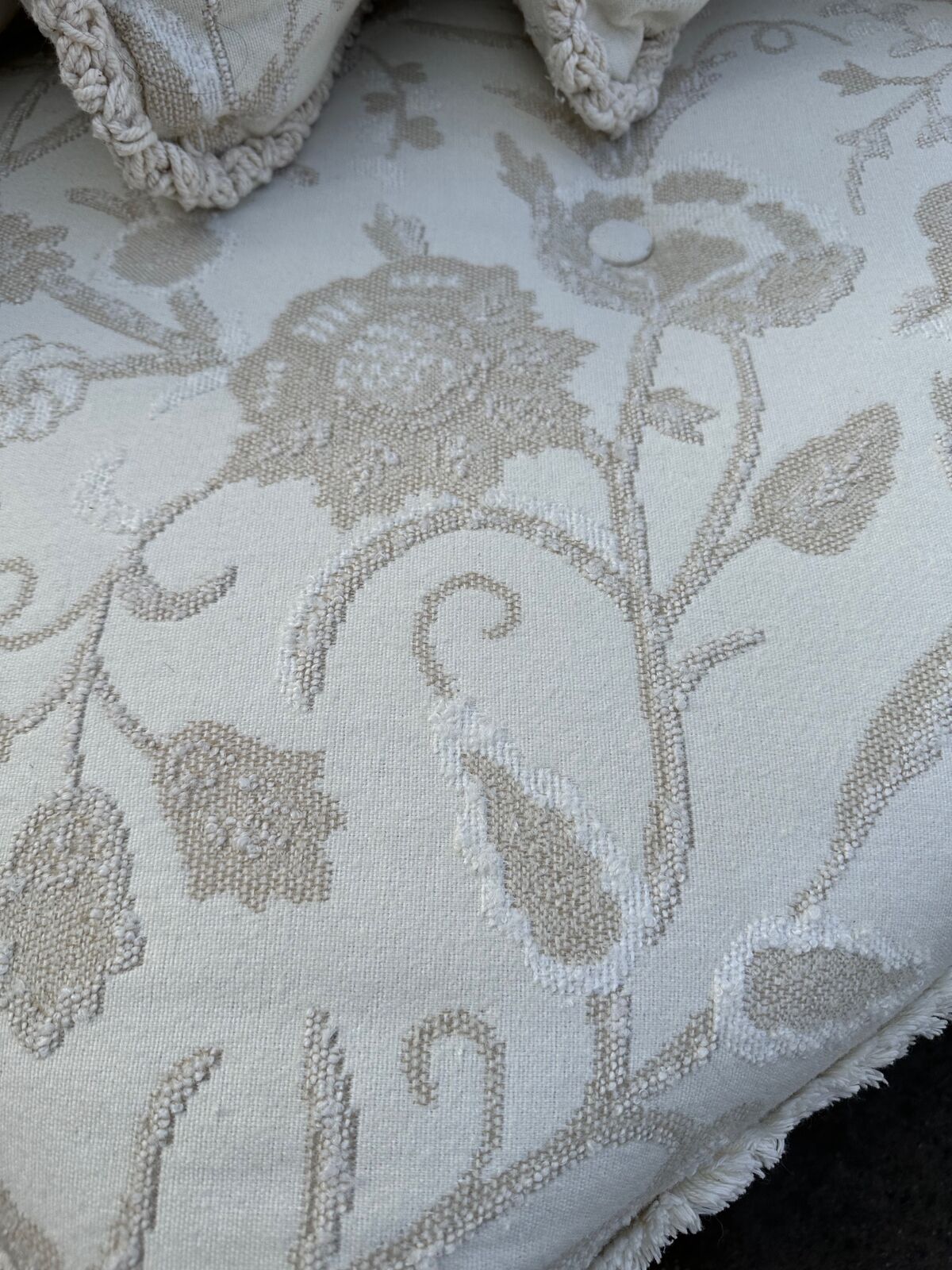 You'll have wonderful conversations around this family sofa. Has 18 pillows and is about 13 feet long. Fabric is in great condition and a lovely floral beige to fit into any decor. Very open to offers, just ask.