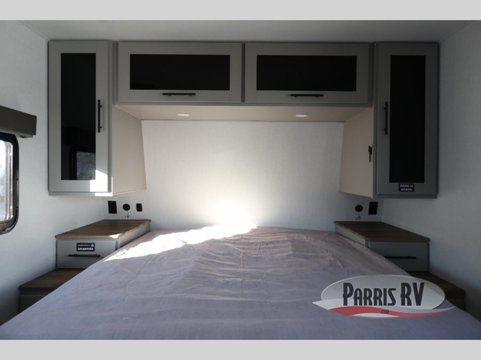 This compact, yet feature-packed travel trailer offers smart design and comfort throughout. Step inside through the 28" entry to find a front queen bed that easily converts into a 60" jackknife sofa, flanked by wardrobe nightstands for your clothes and essentials. The central kitchen is equipped with a 10-cu. ft. refrigerator, two-burner cooktop, sink, and overhead storage, while a booth dinette across from it offers dining space and a clear view of the 32-inch TV. At the rear, enjoy the convenience of a full bathroom with a spacious 30" x 36" shower, a sink with linen shelves, and additional overhead compartments for organized storage.