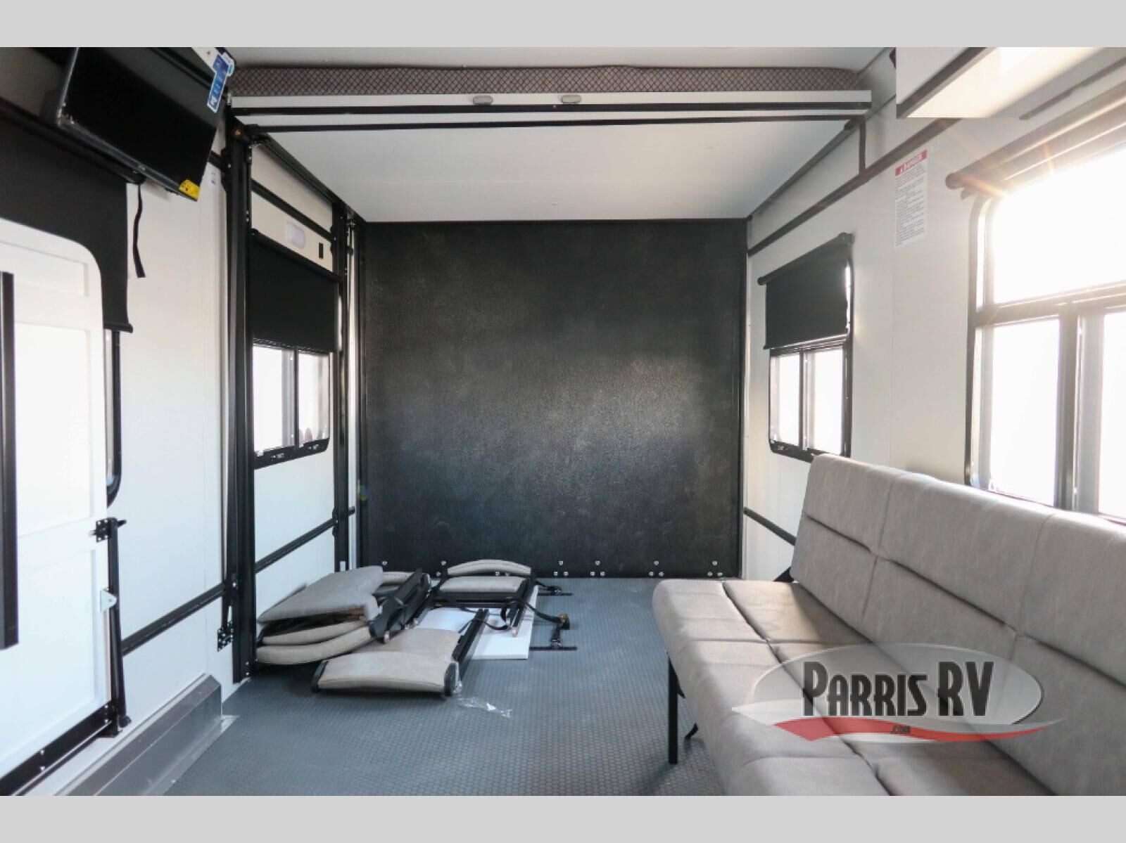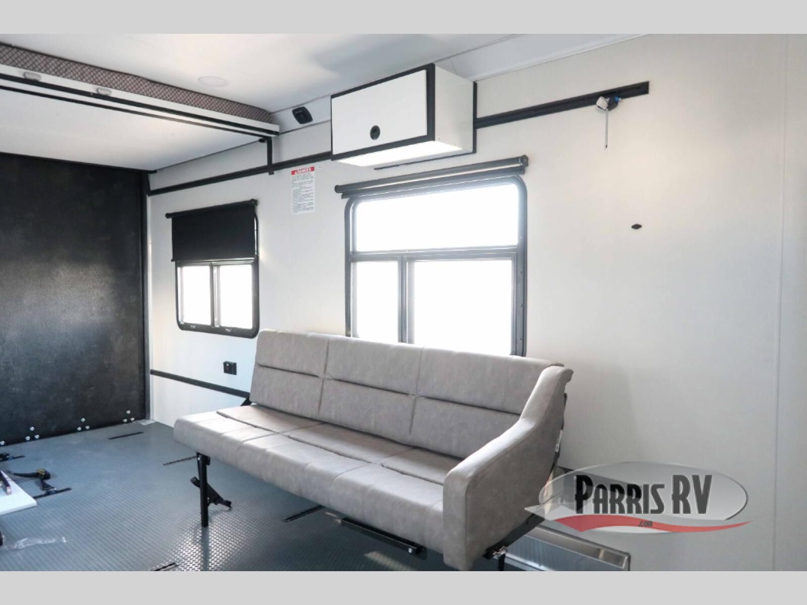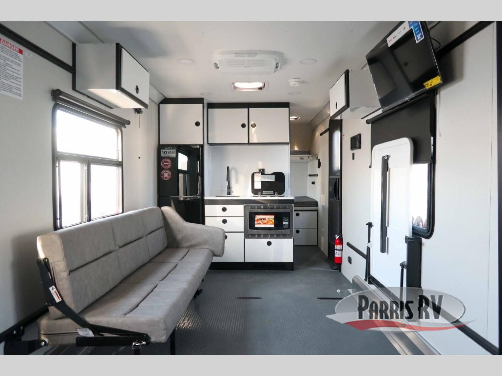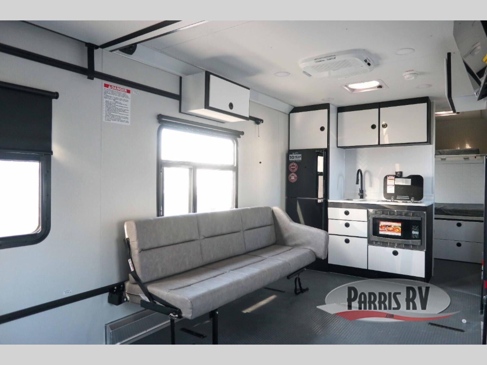 With any PLA 450 toy hauler travel trailer by ATC Trailers, you will enjoy lightweight towing and a configurable garage space for your toys, gear, and more! The all-aluminum and composite construction features no wood so you won't have to worry about rot, and the All-Weather Protection Package means you can extend your camping season. There is a 200-watt solar panel, a 100-watt inverter, and 120V/USB outlets to keep your adventures going. Outside, you'll find storage for your gear, a power awning with a light strip, sleek frameless dual pane windows, and more convenient features. The interior is just as accommodating with aluminum cabinets, dimmable can ceiling lights, configurable furniture track system, and solid surface countertops!